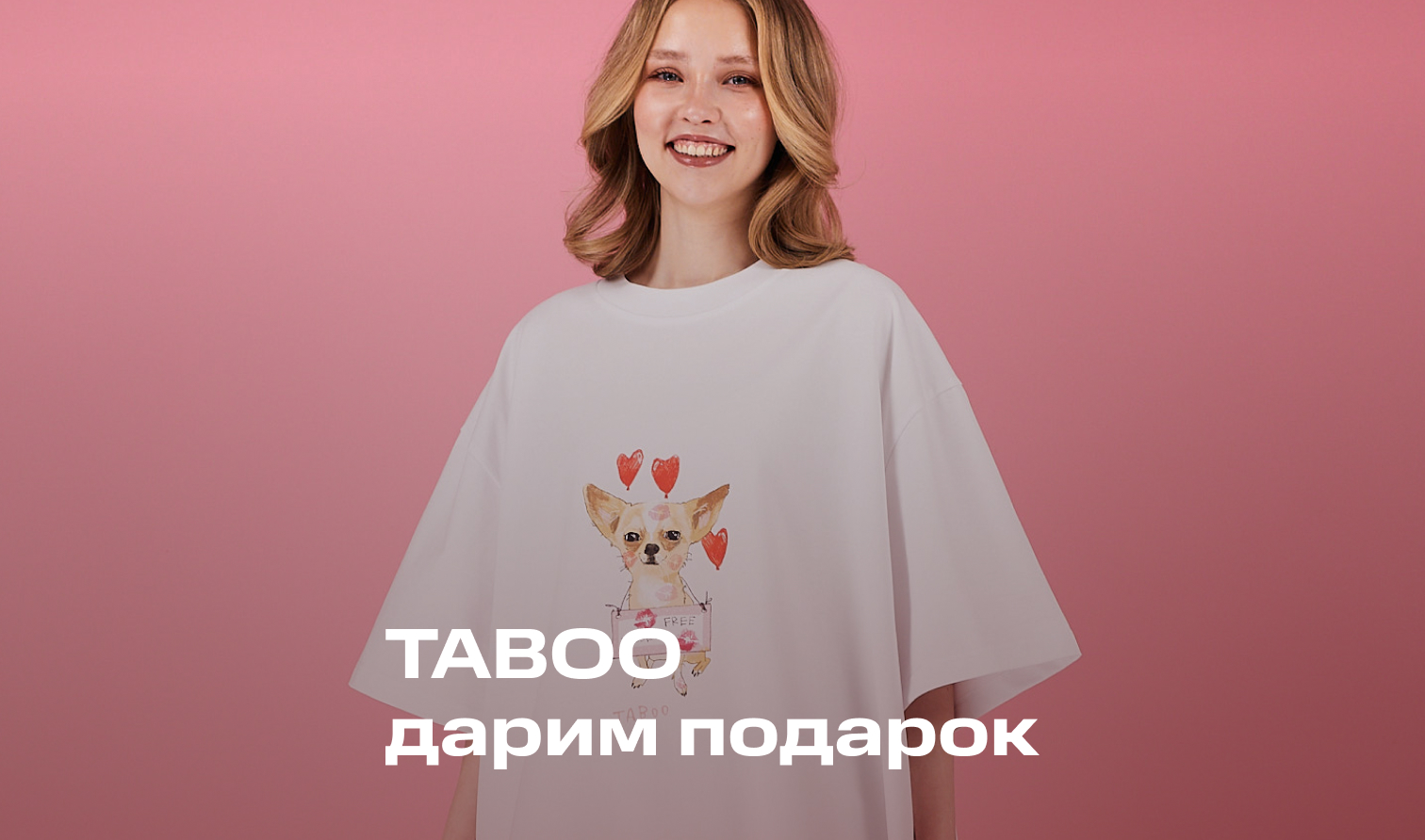 С 13 по 15 февраля покупай от двух вещей (аксессуары не участвуют) в бренде TABOO на сумму от 10 000 ₽ и получи лимитированную футболку в подарок!