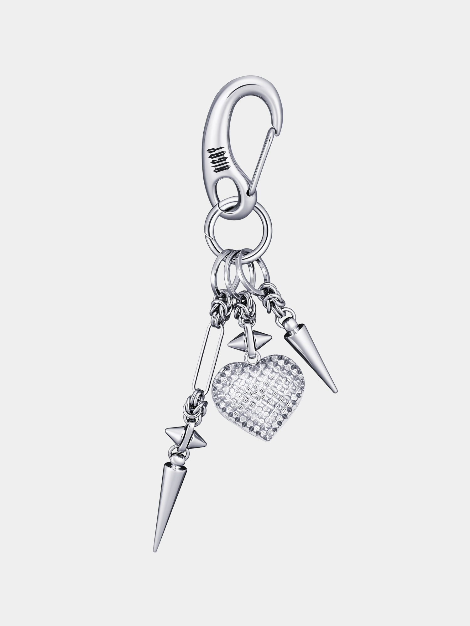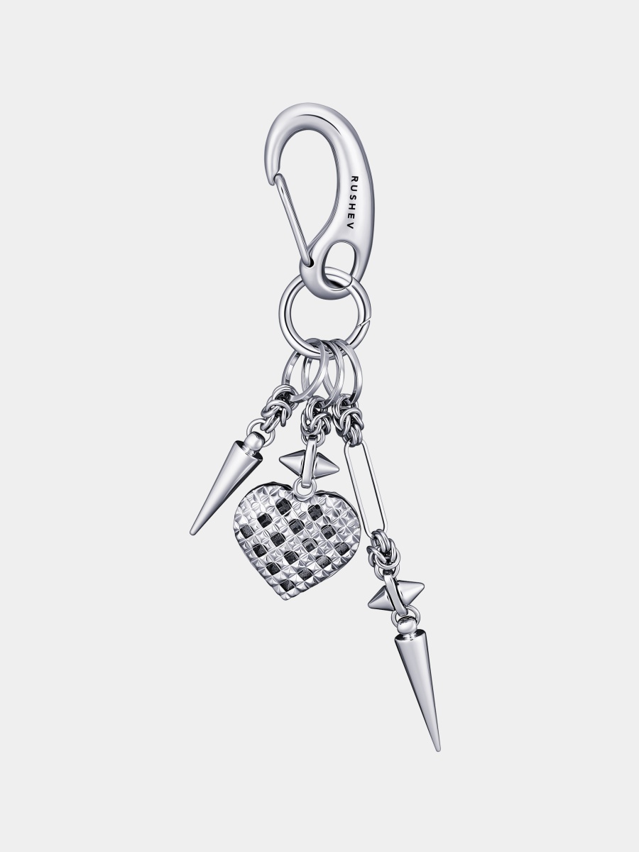Брелок с подвесами в виде сияющего сердца, булавок и шипов.
