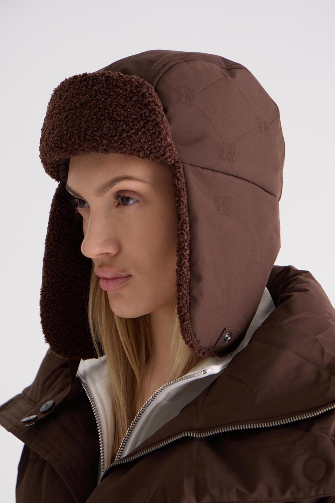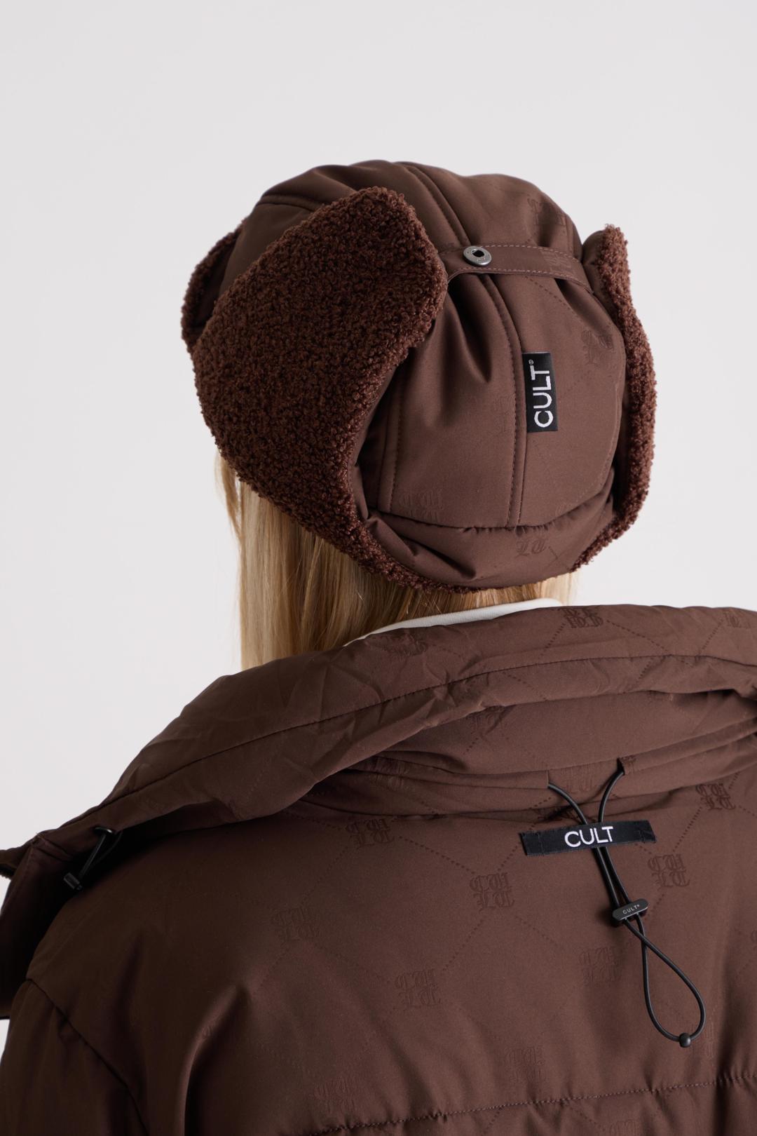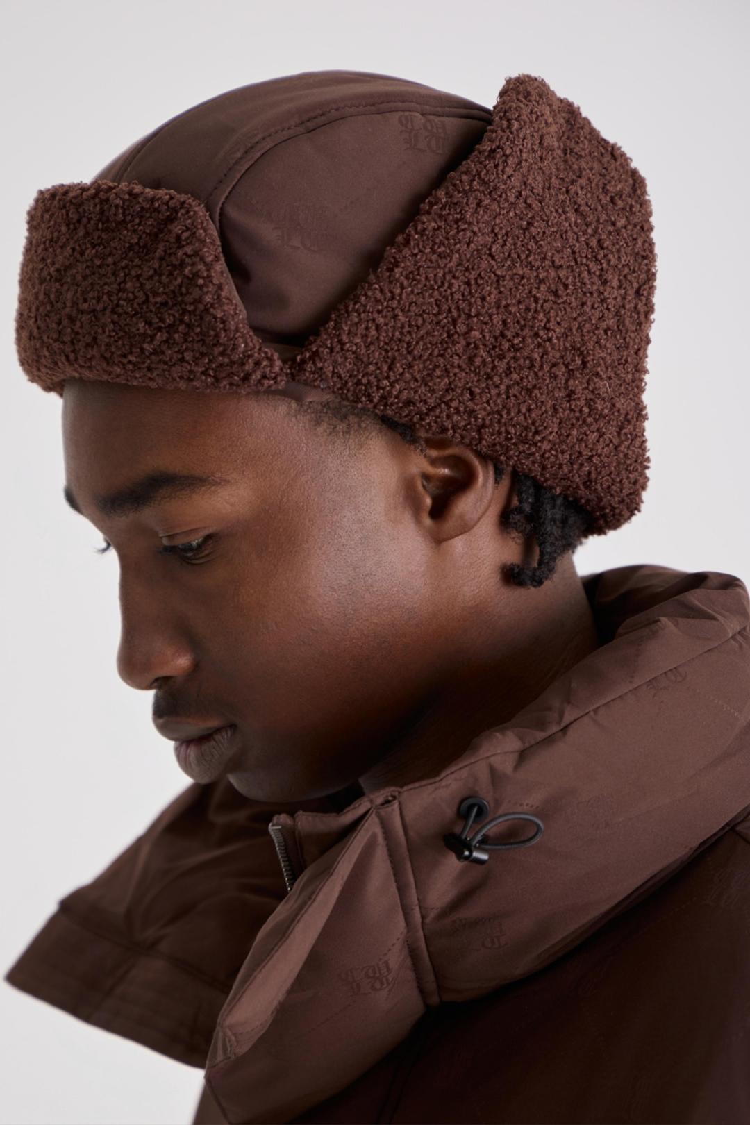 Шапка ушанка унисекс с паттерном из монограммы бренда, на меху. Застежка на кнопки.