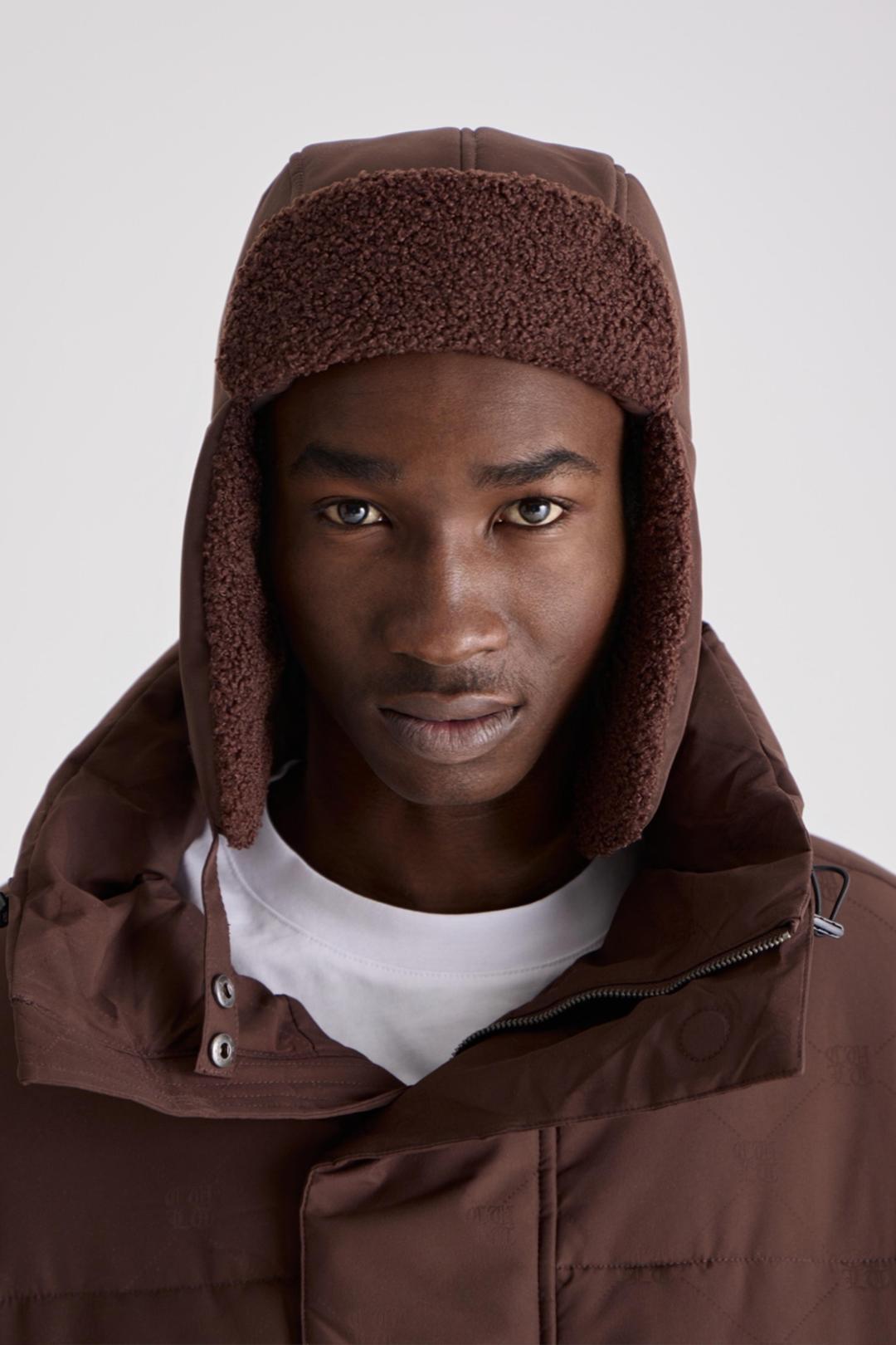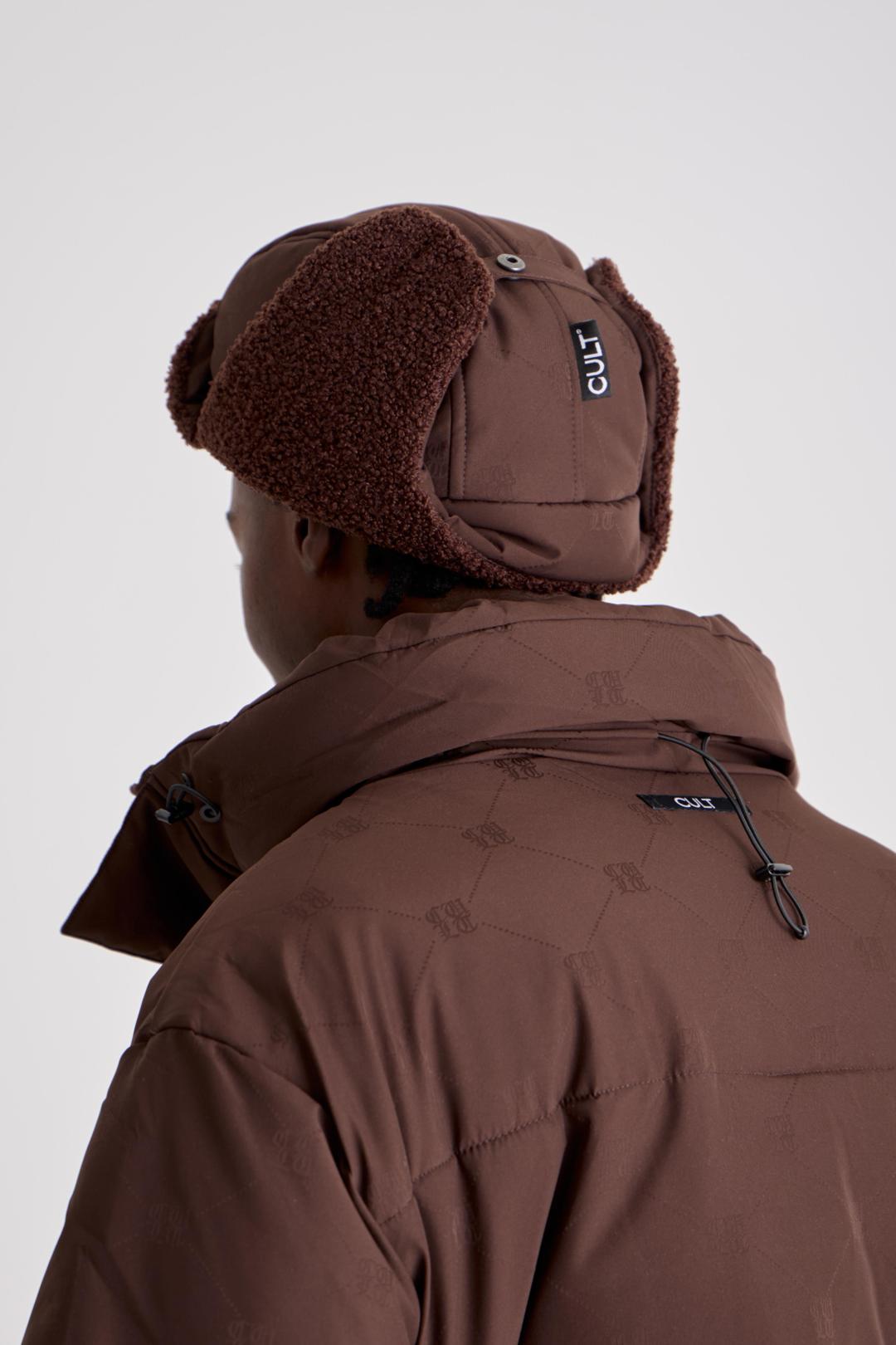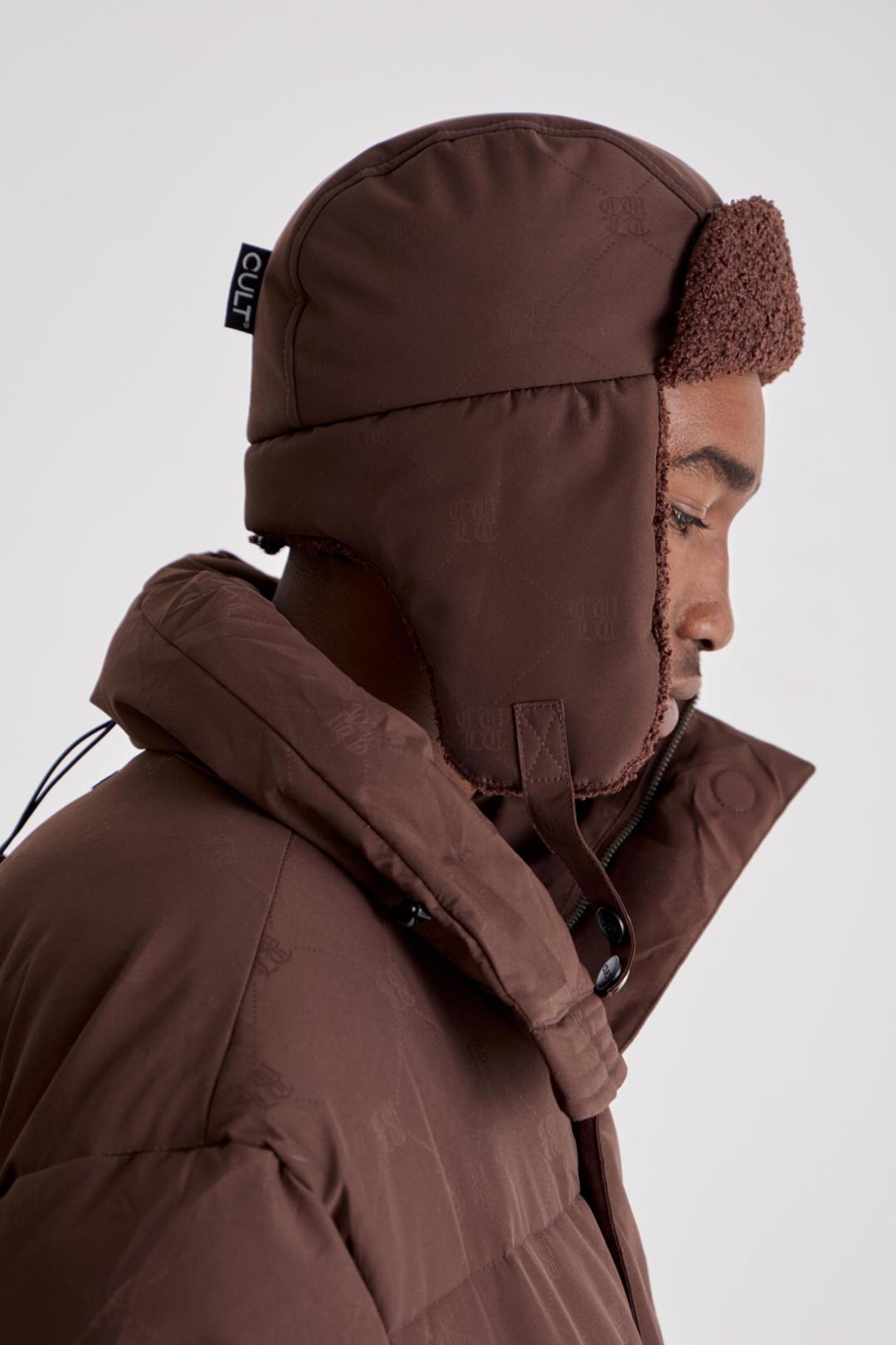 Шапка ушанка унисекс с паттерном из монограммы бренда, на меху. Застежка на кнопки.