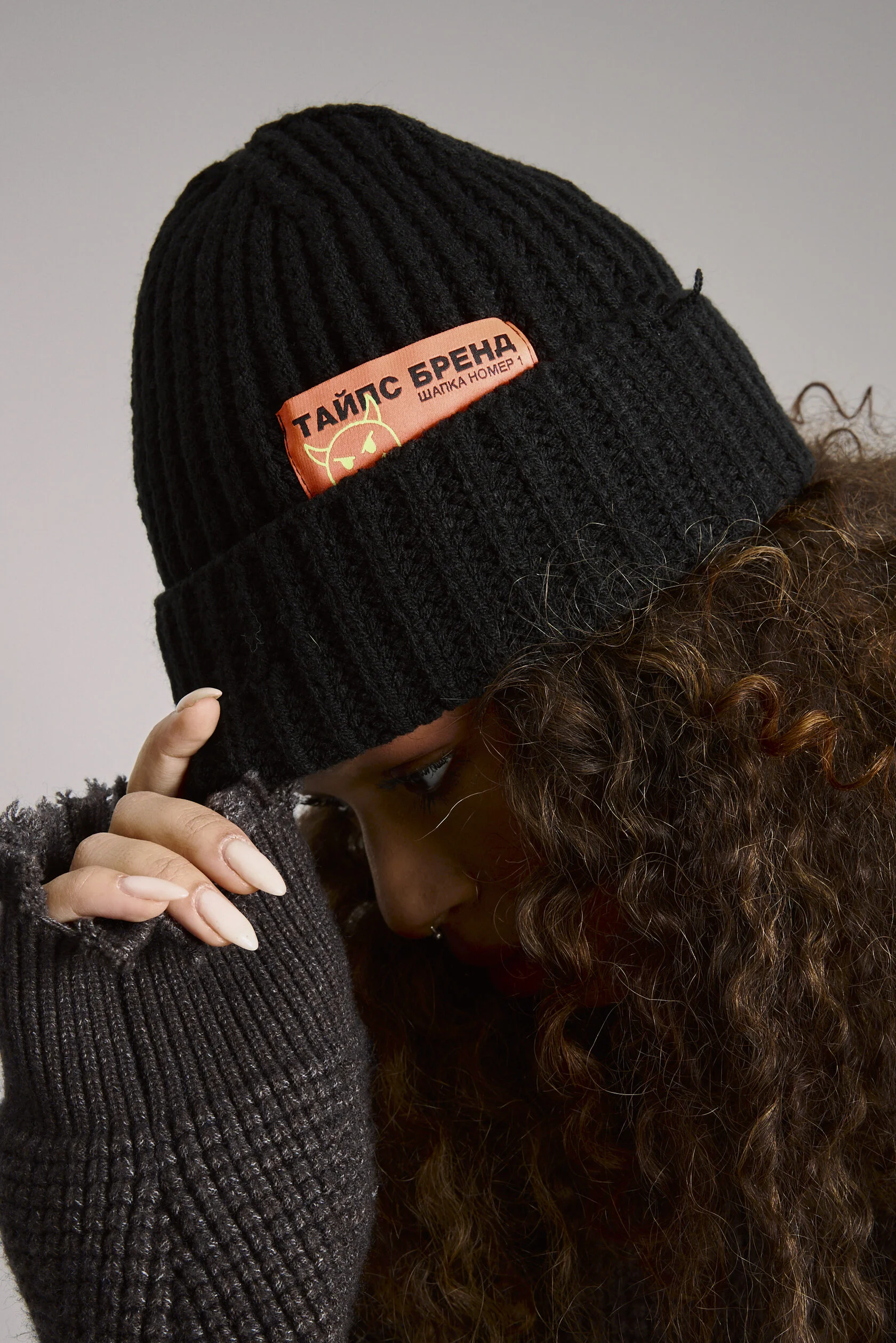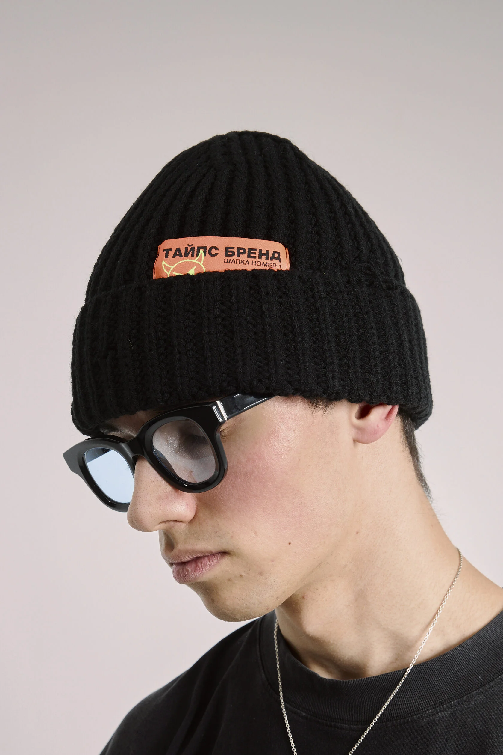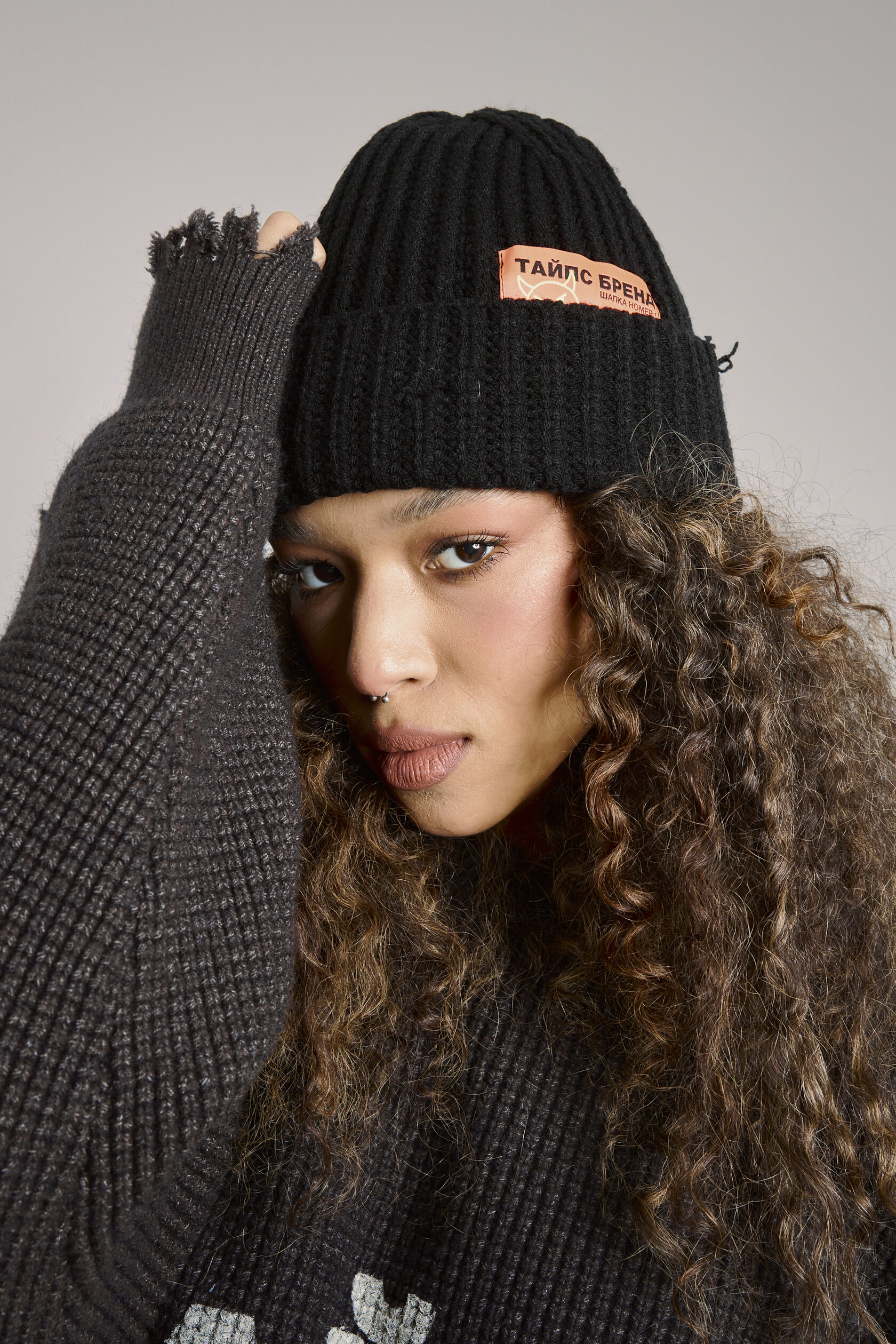 Шапка чёрная вязанная, из 100% акрил с декоративной нашивкой. На шапке присутствует декоративный "distressed" эффект.