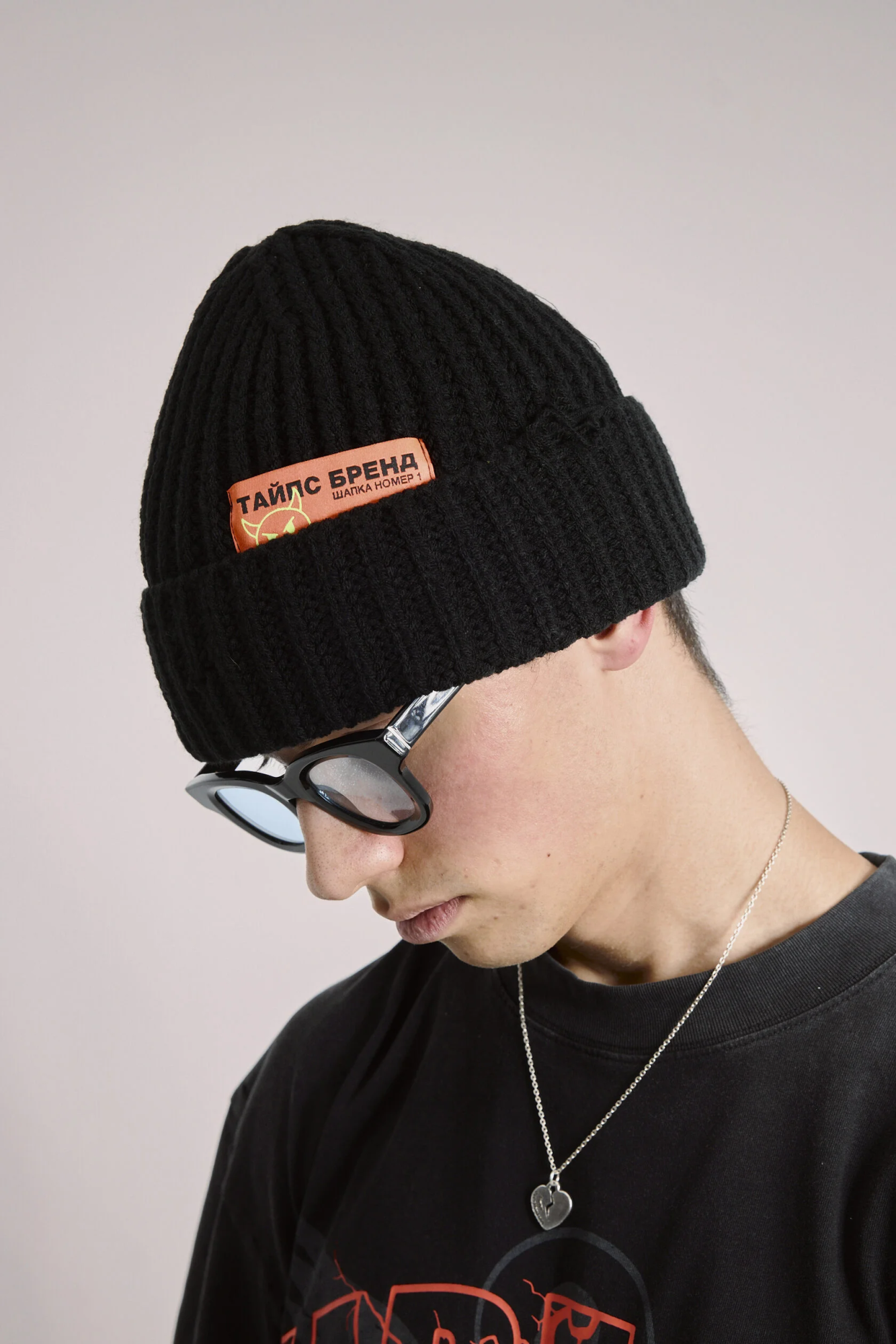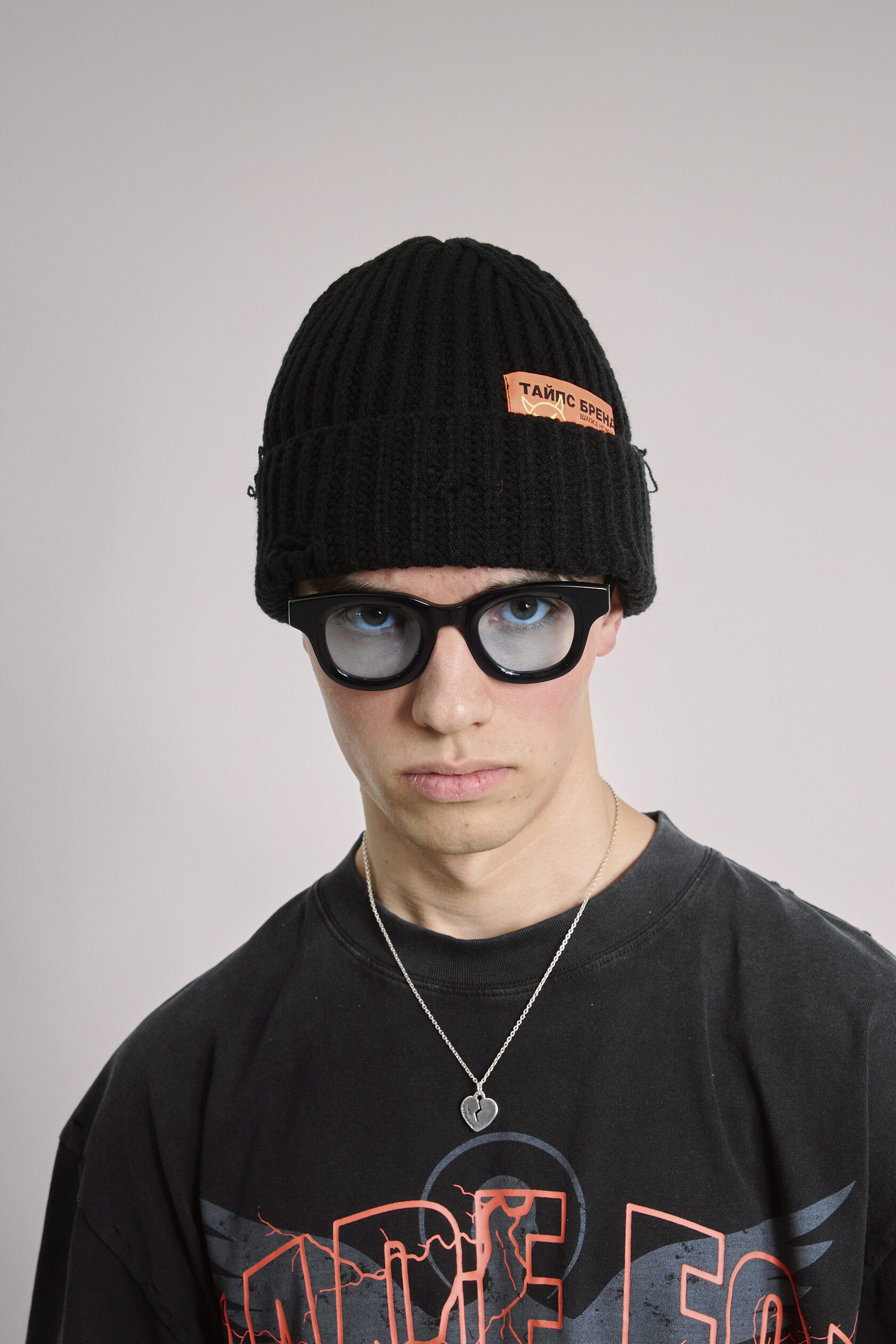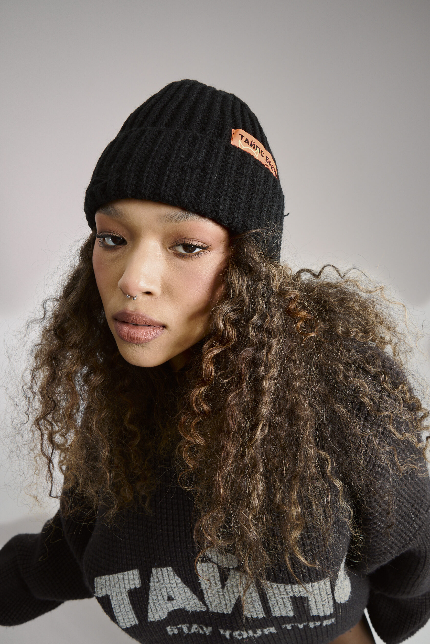 Шапка чёрная вязанная, из 100% акрил с декоративной нашивкой. На шапке присутствует декоративный "distressed" эффект.