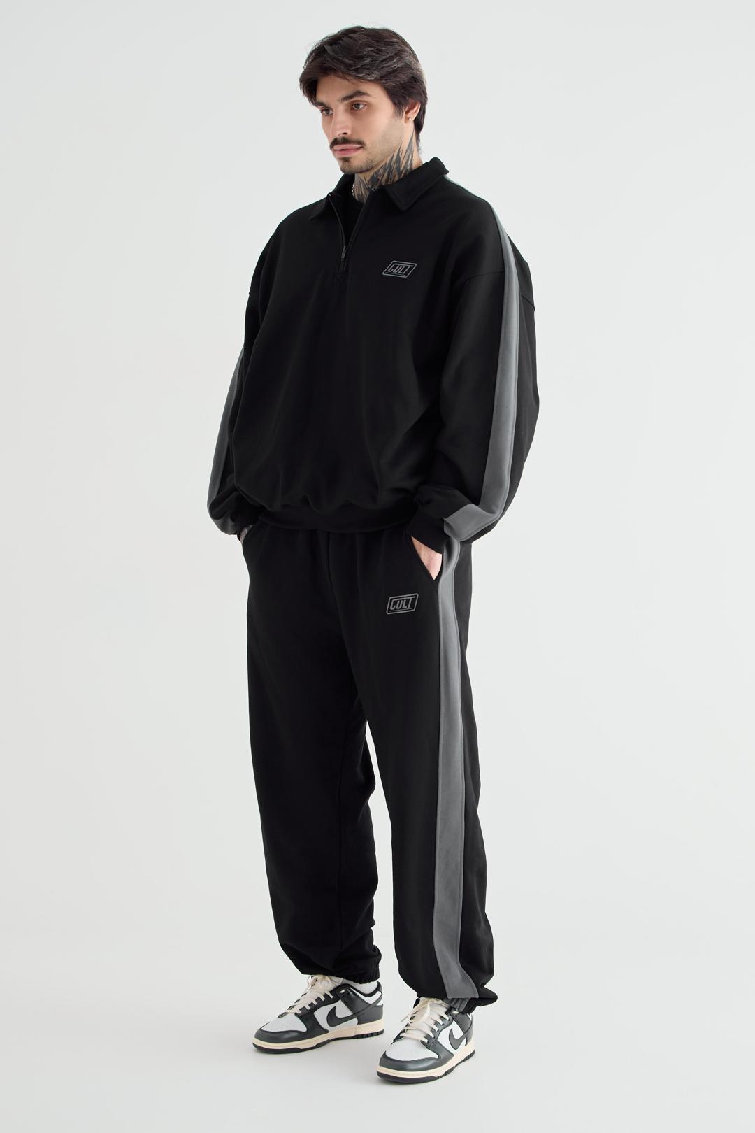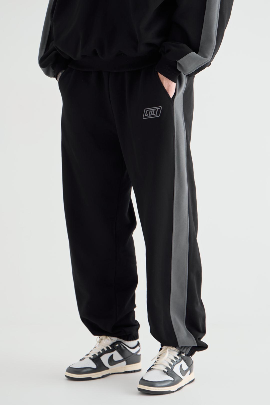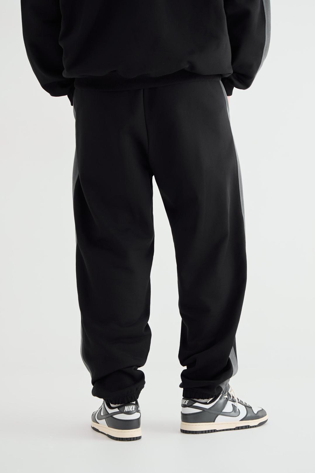 Джоггеры мужские из премиального футера трехнитки с контрастными лампасами по бокам, которые придают образу динамичность. Манжеты и пояс на резинке. Шнурок в поясе для регулировки посадки находится внутри изделия. Брюки имеют удобные боковые карманы.