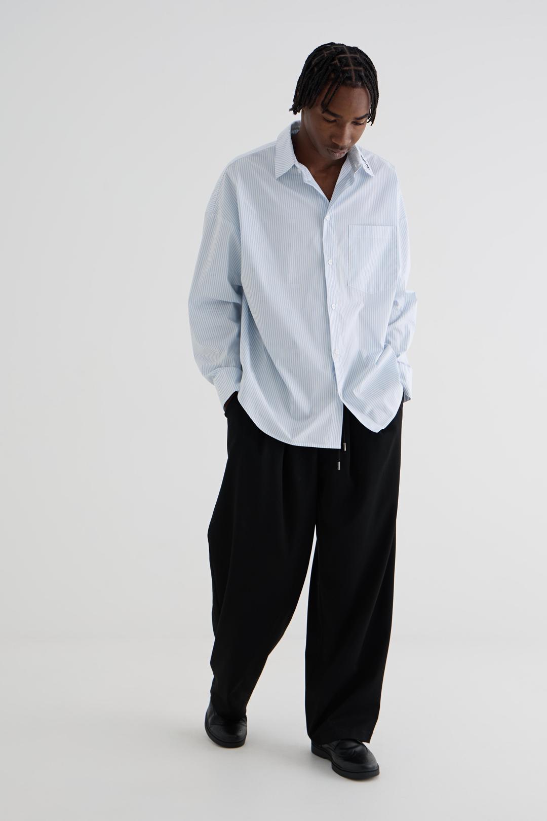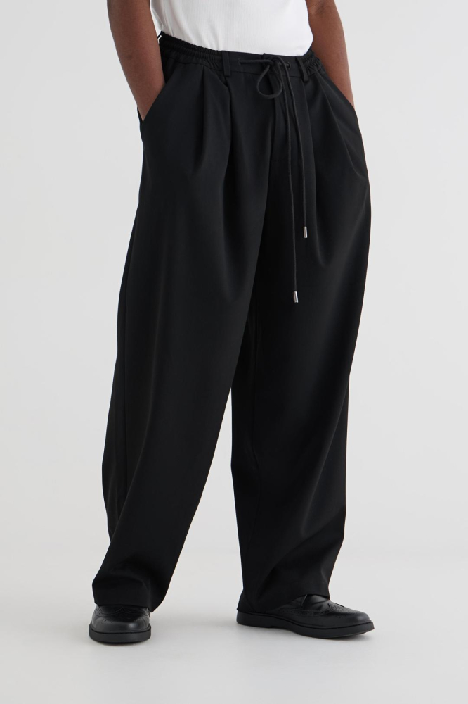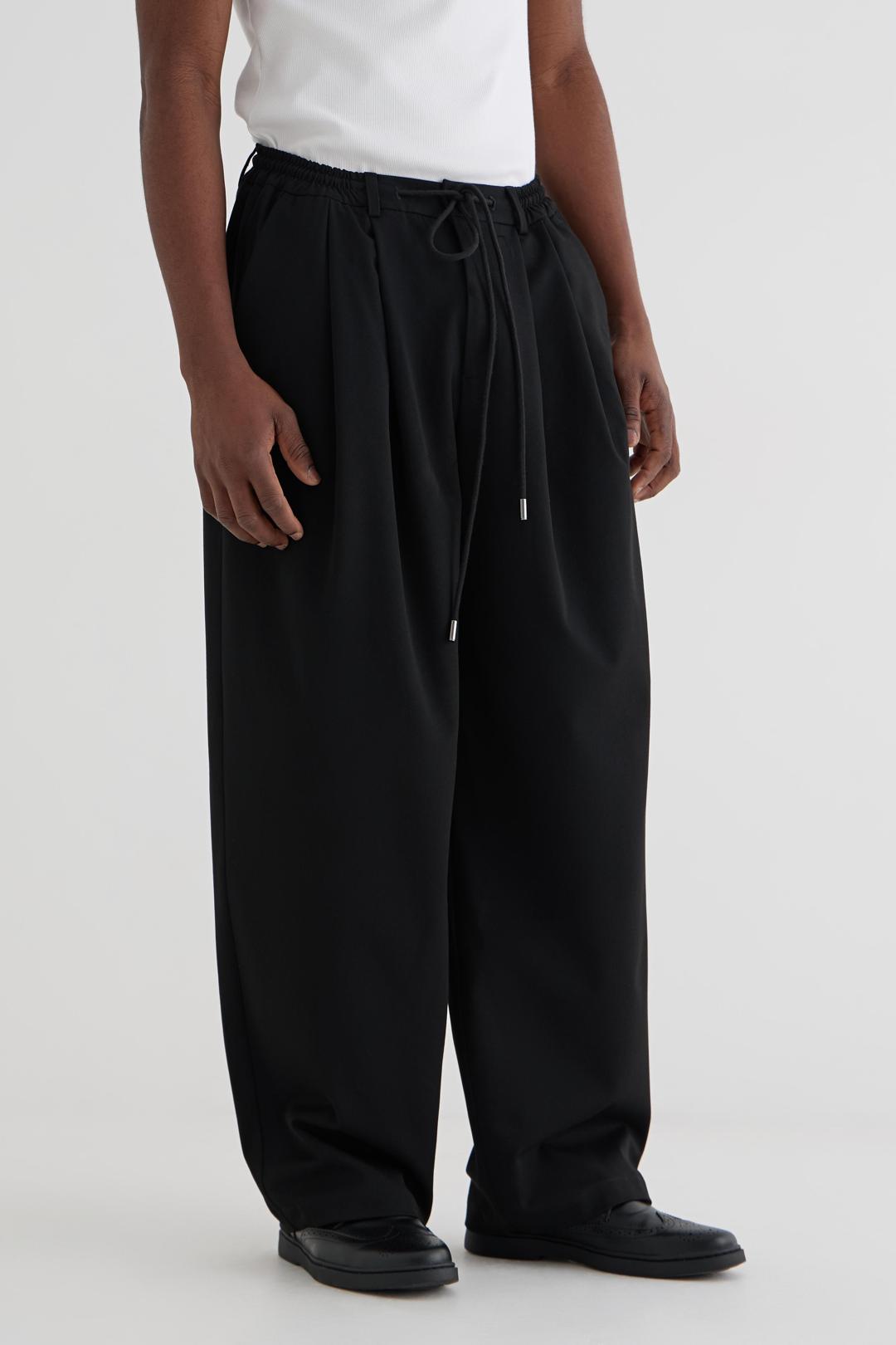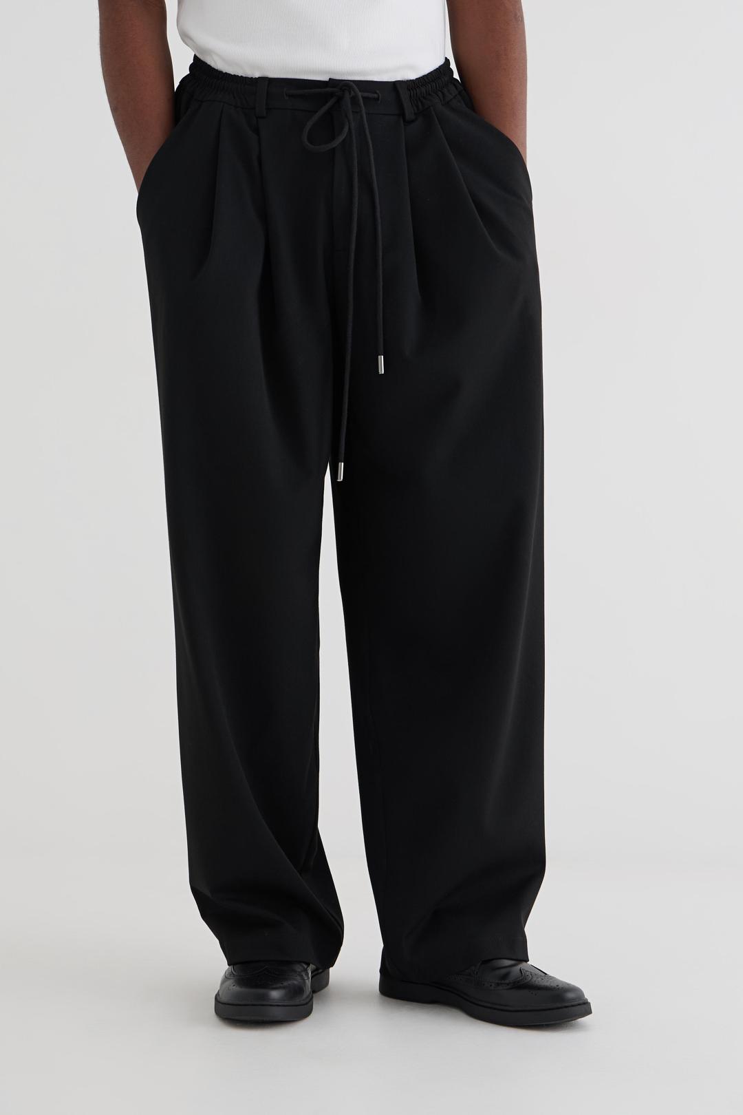 Брюки мужские из костюмной ткани прямого силуэта. Изделие с боковыми карманами и застёжкой гульфик на молнию и крючок. Сзади талиевые вытачки и ложные прорезные карманы в рамку. Пояс со шнурком, по бокам собран эластичной тесьмой.
