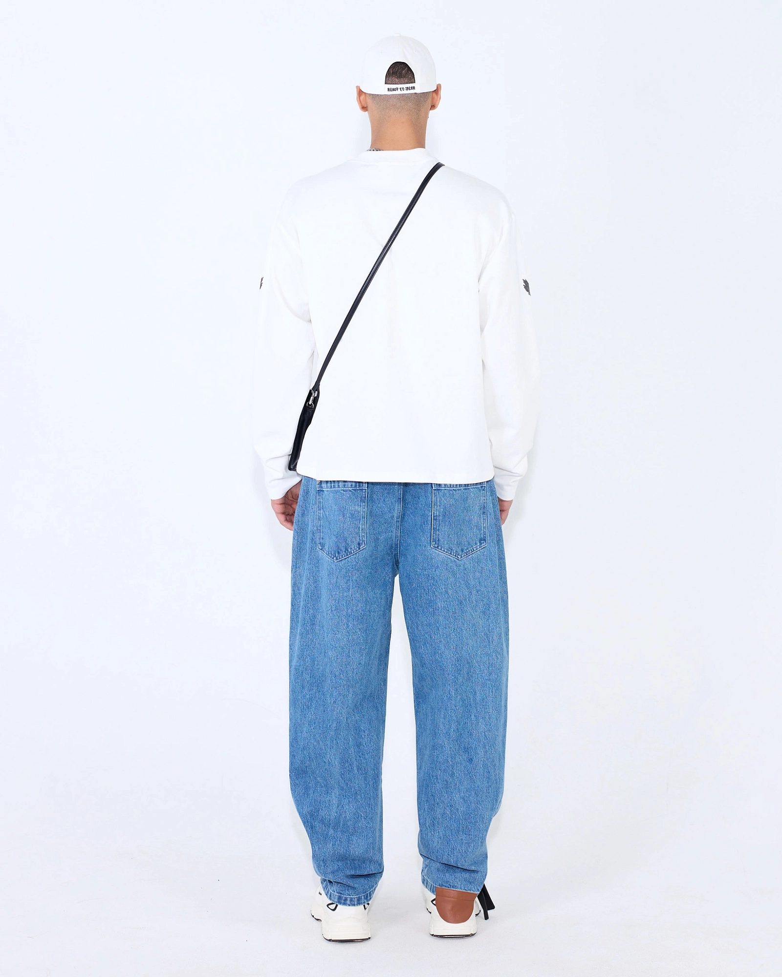 Джинсы-бэгги из плотного хлопкового денима с лёгким эффектом винтажной выварки. Широкий объём по всей длине создают расслабленный силуэт, держащий форму. Низ дополнен кожаной «пяточкой» по правой брючине — деталь защищает край от протирания каблуком и работает как акцент.