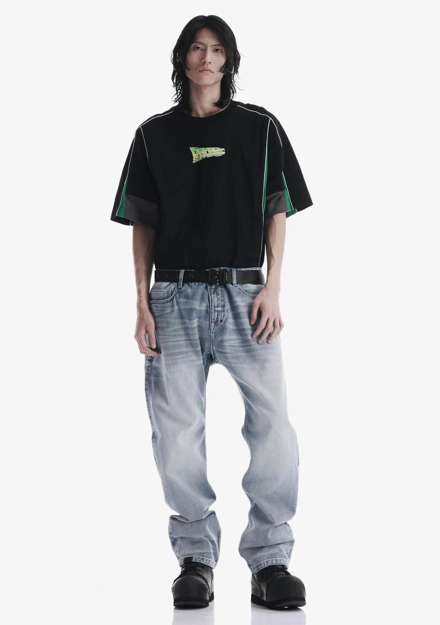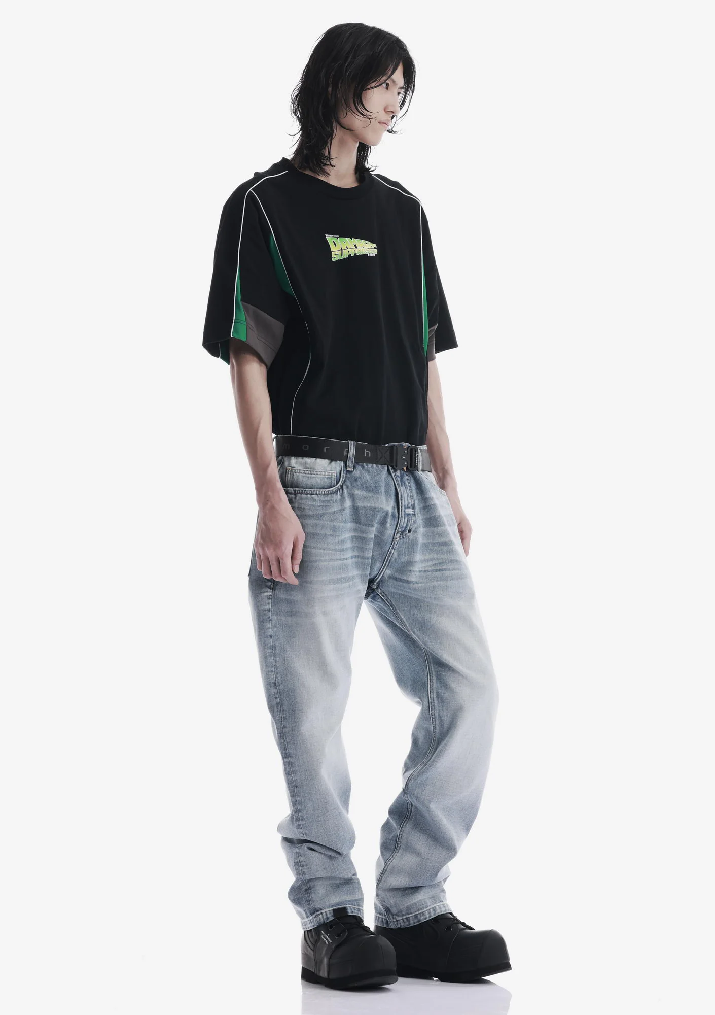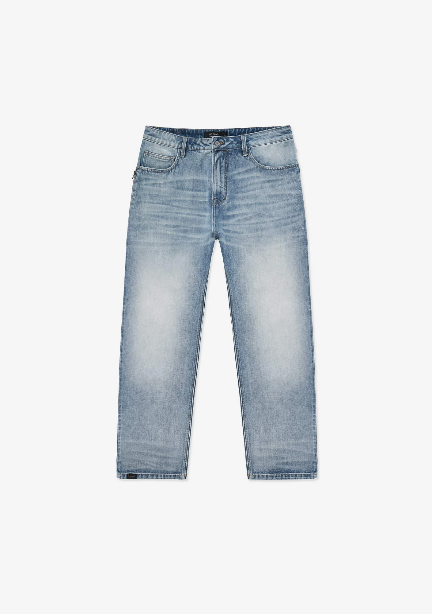 Джинсы свободного силуэта из плотного денима с выраженной фактурой, обеспечивающего износостойкость и стабильную форму. Классическая конструкция с 5 карманами дополнена дополнительным карманом на молнии.