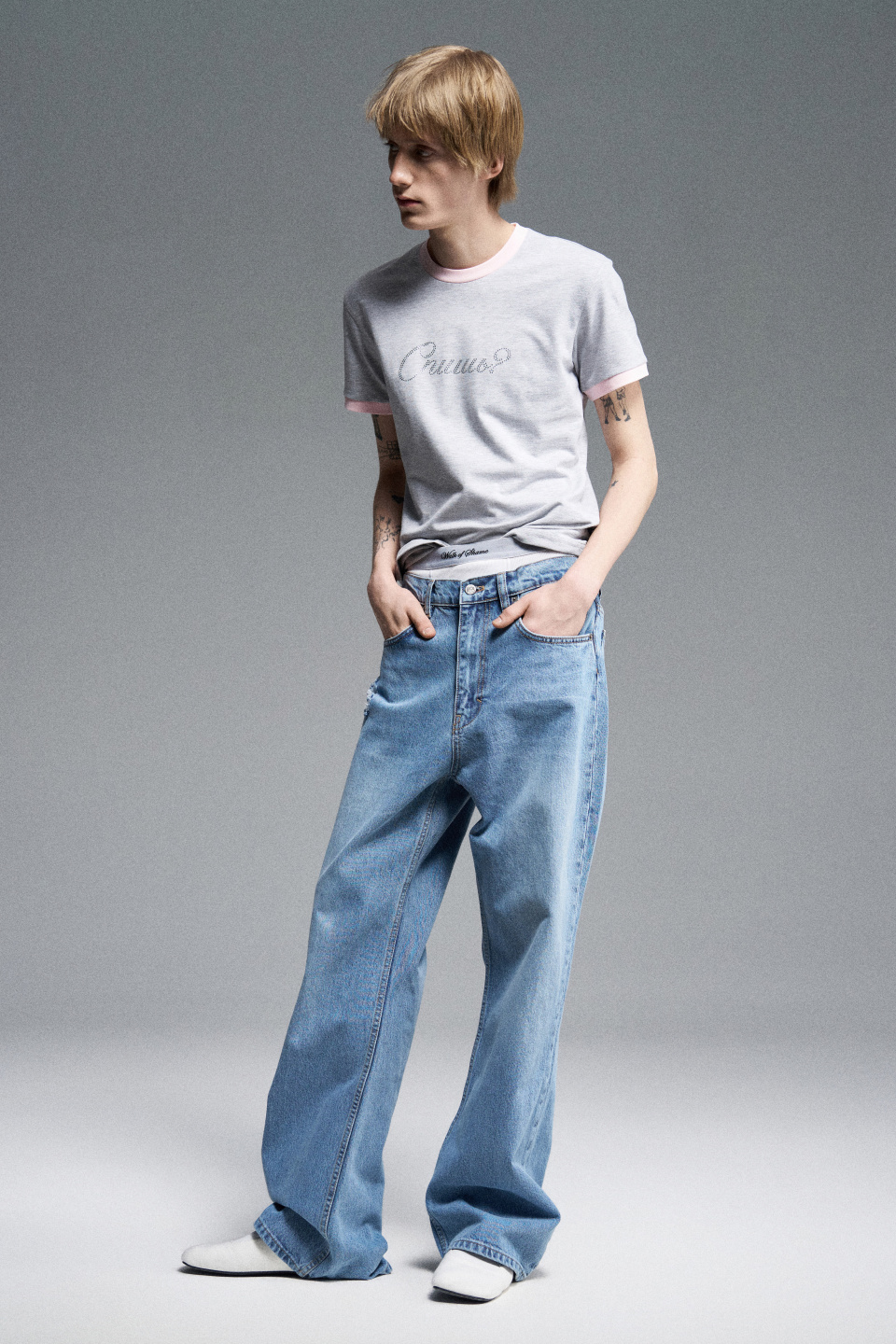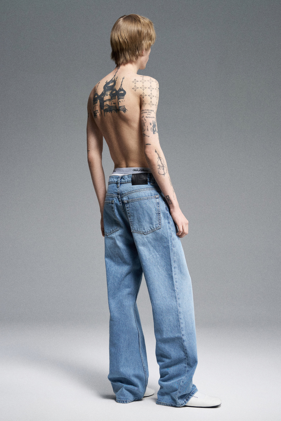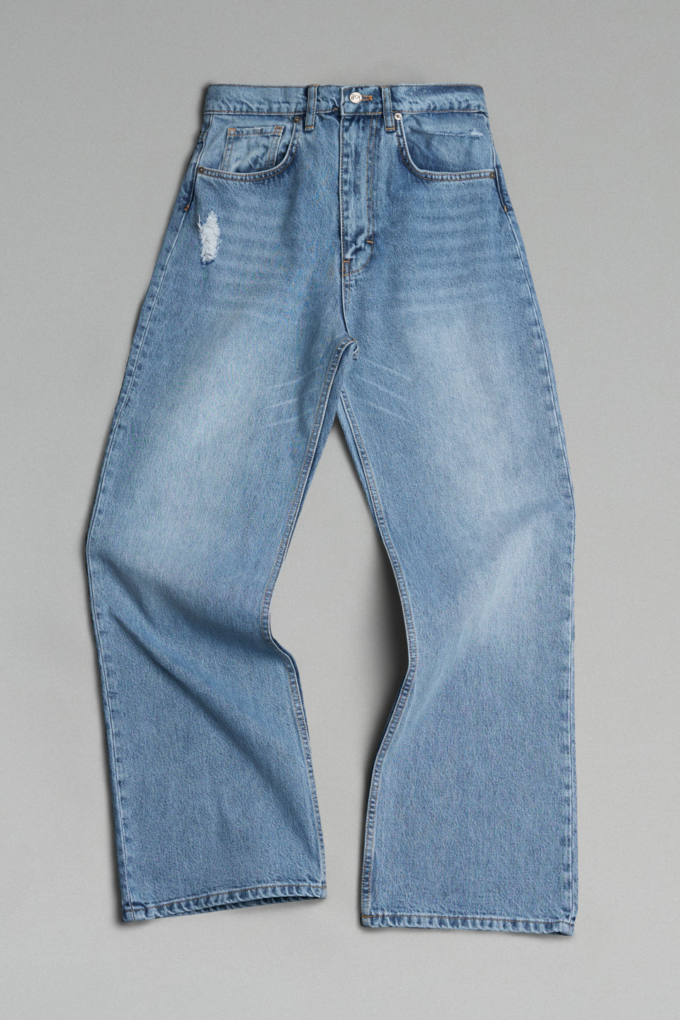 Прямые джинсы свободного кроя со средней посадкой. Пять карманов. Застежка на молнию и металлическую брендированную пуговицу.