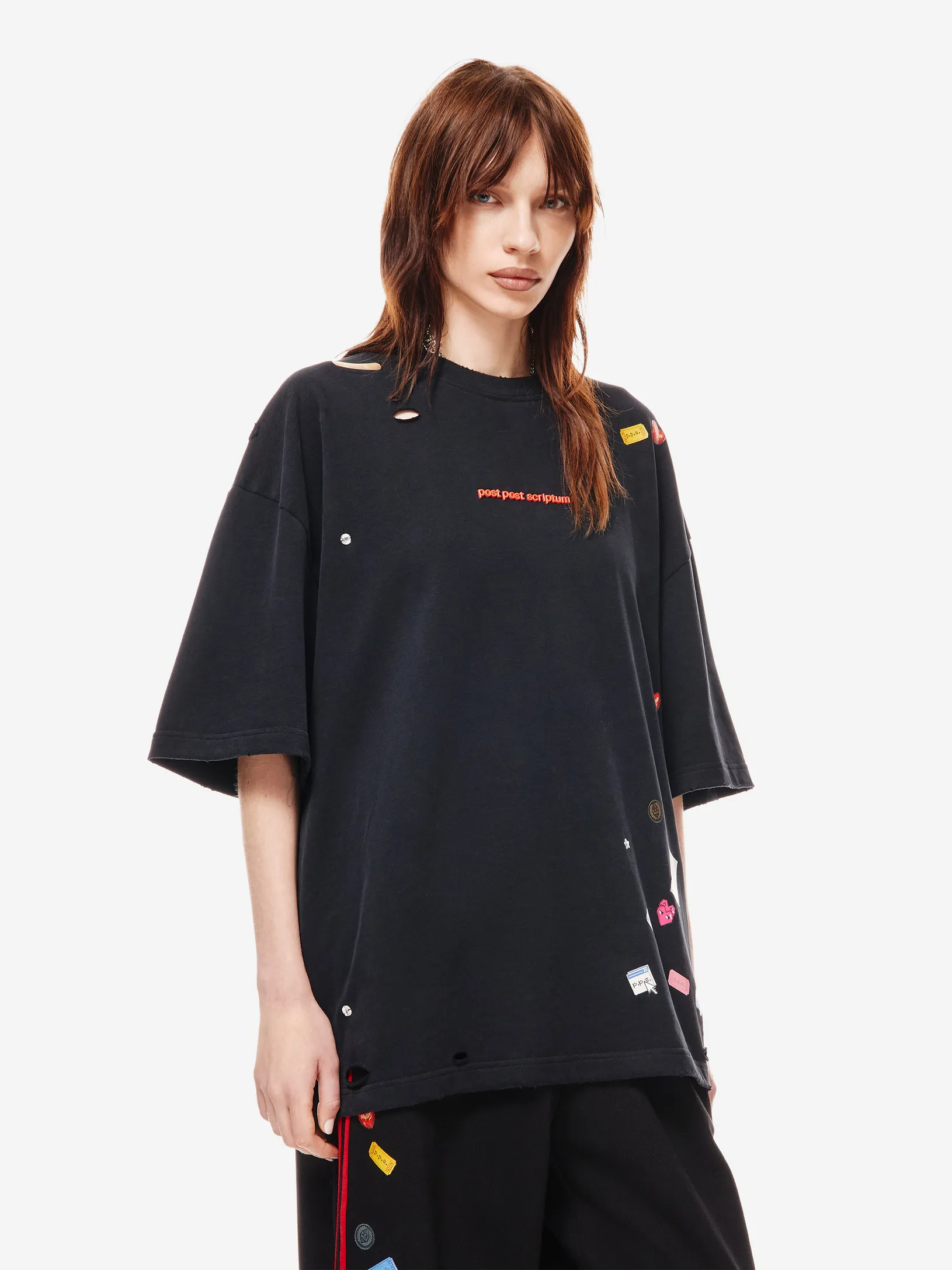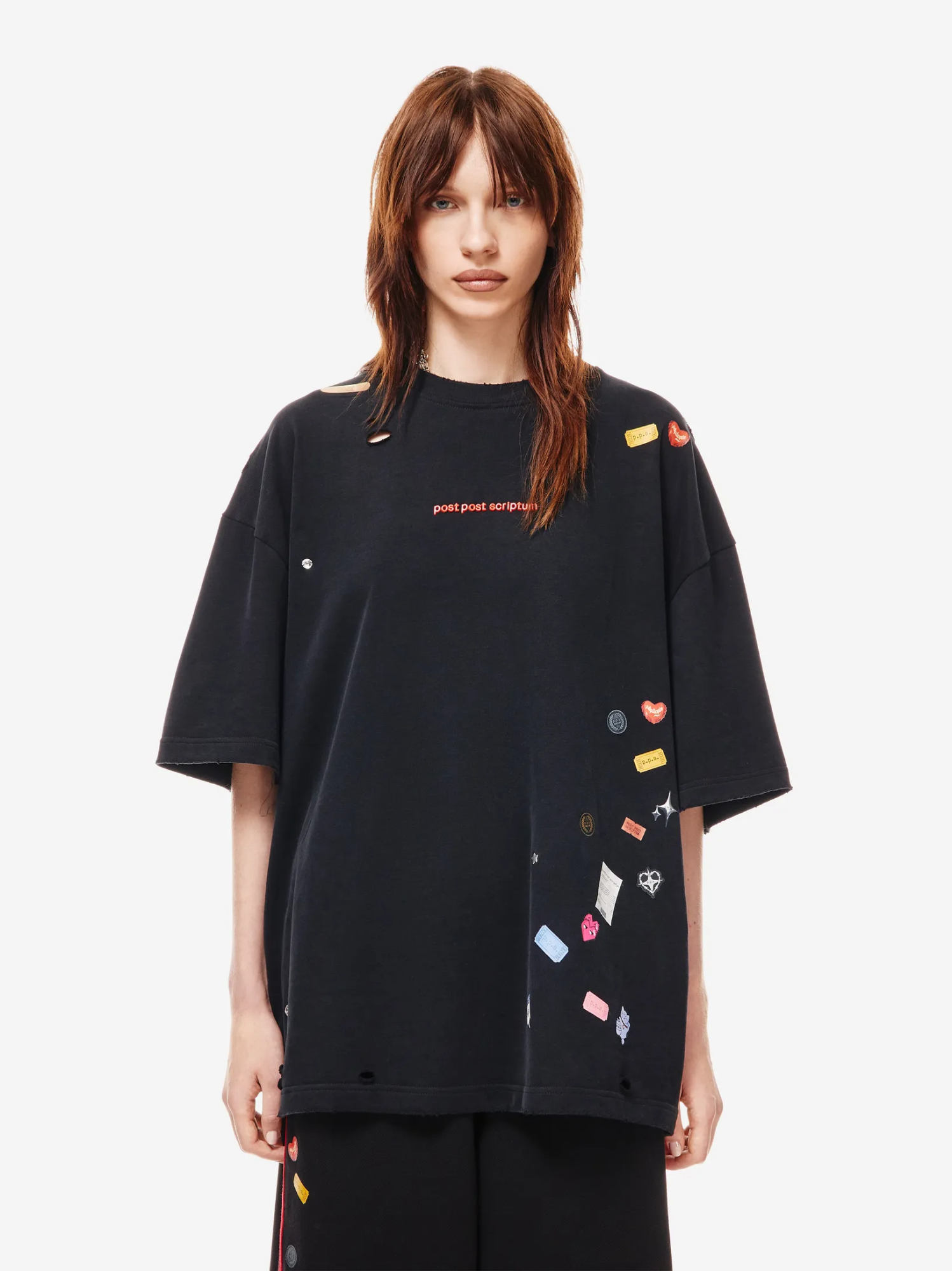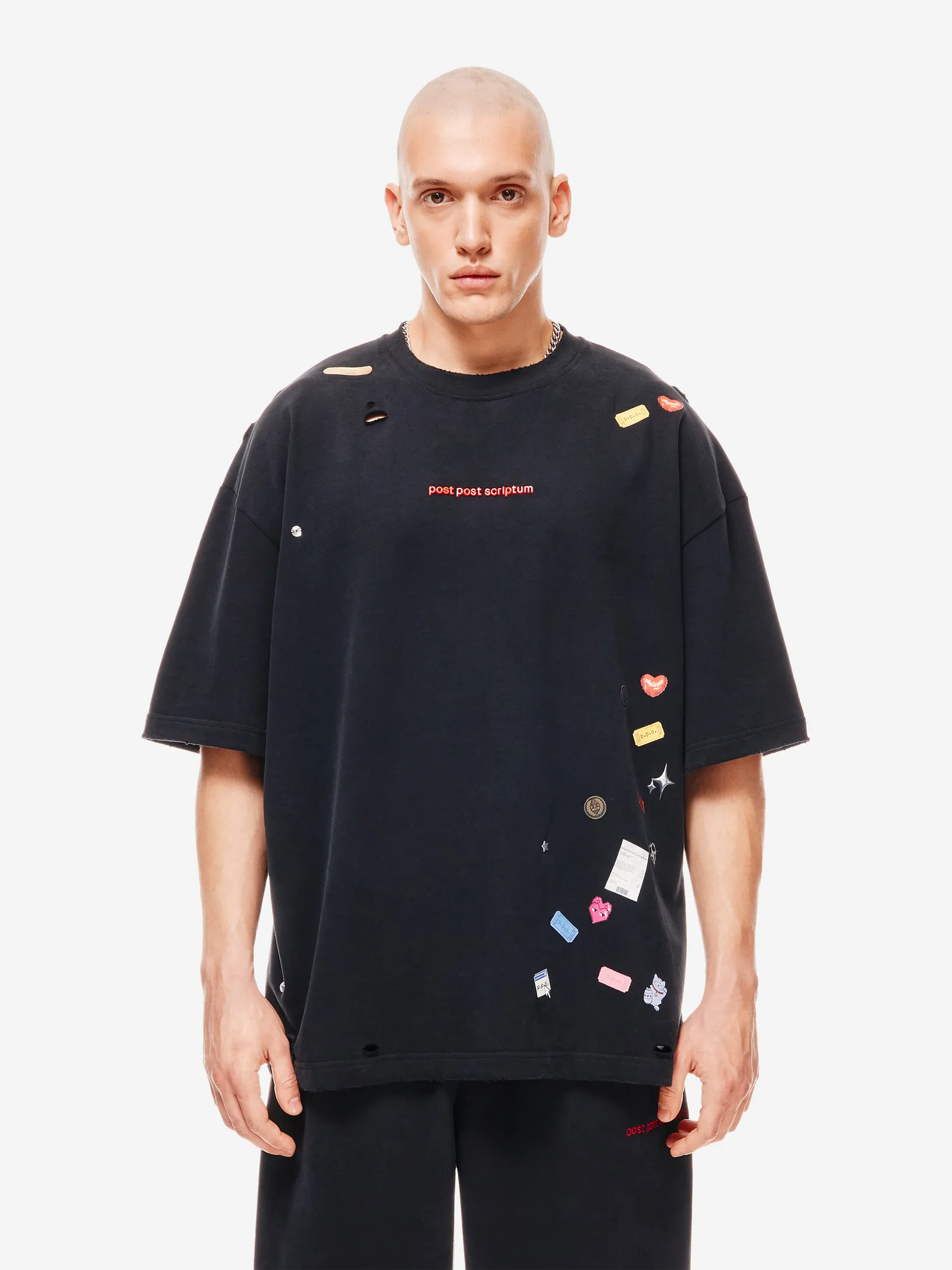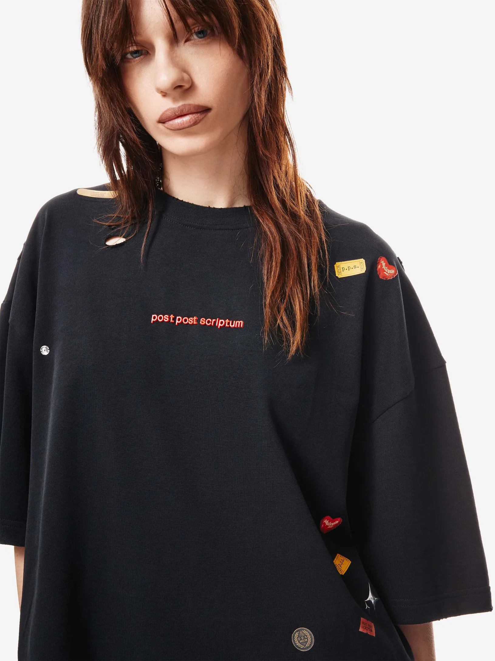 Базовая футболка силуэта oversize из плотного 100% хлопка. Модель с круглой горловиной и широкими рукавами. Вышитый логотип pstpstscrptm и фирменный патч-манифест подчеркивают эстетику бренда.