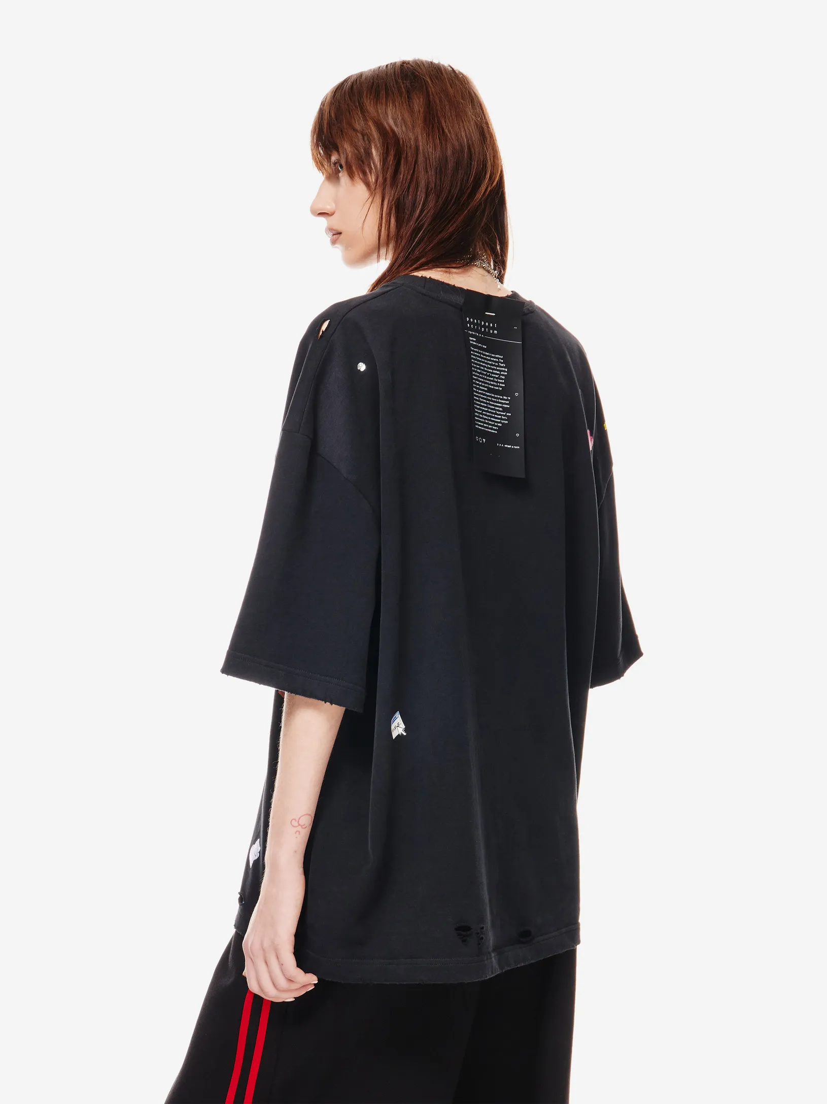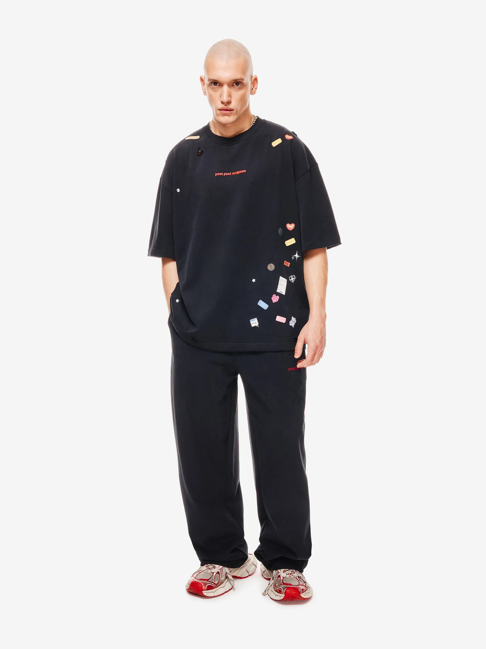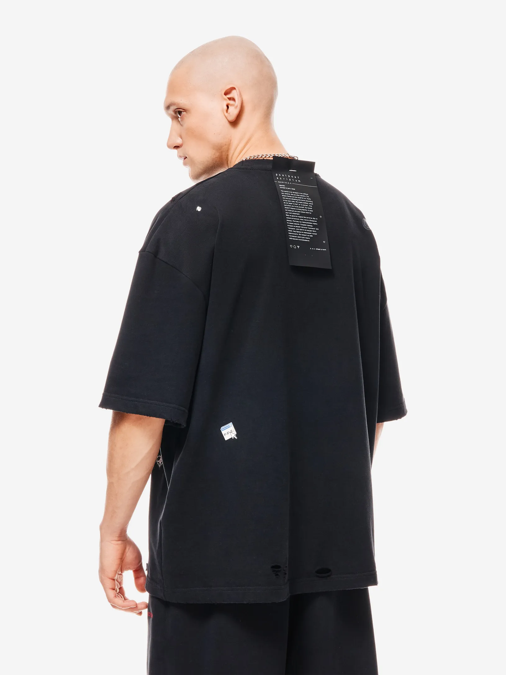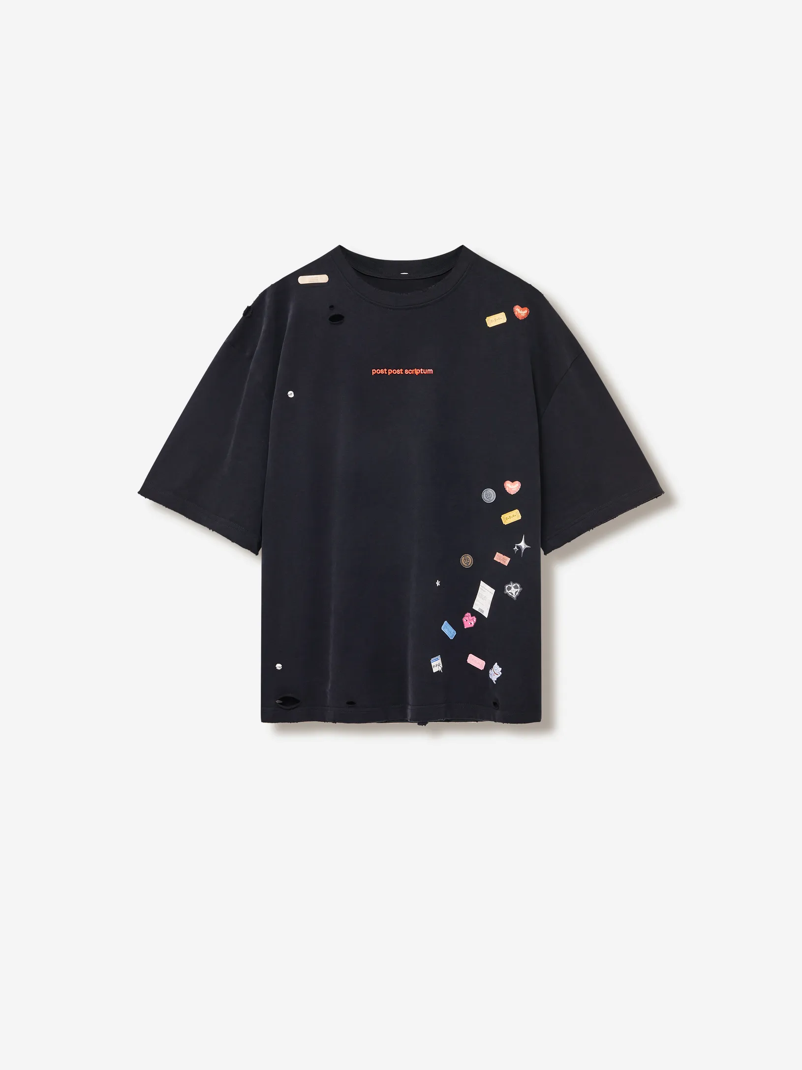 Базовая футболка силуэта oversize из плотного 100% хлопка. Модель с круглой горловиной и широкими рукавами. Вышитый логотип pstpstscrptm и фирменный патч-манифест подчеркивают эстетику бренда.