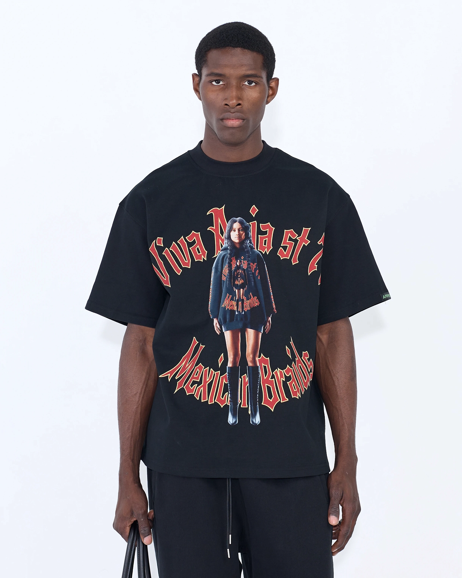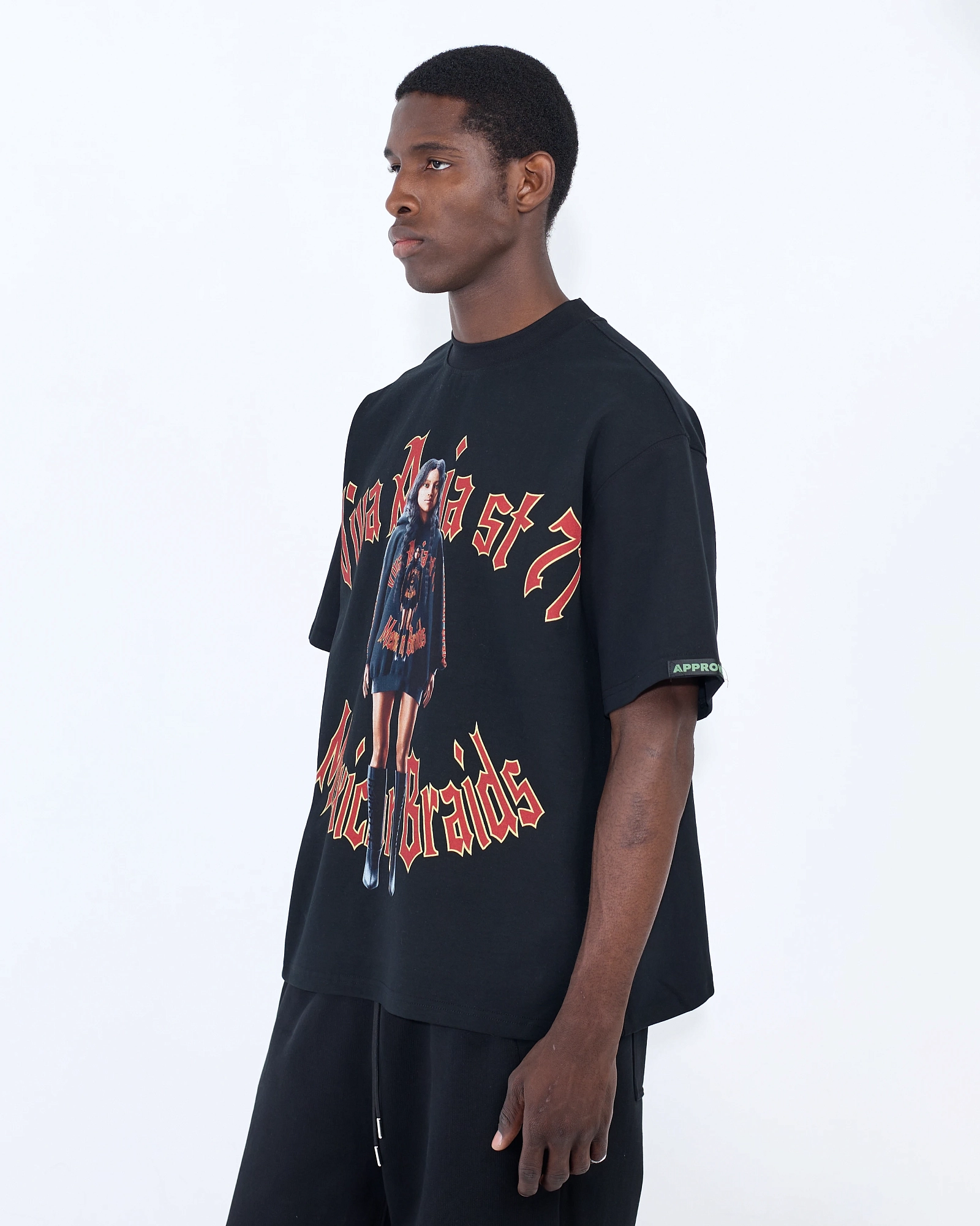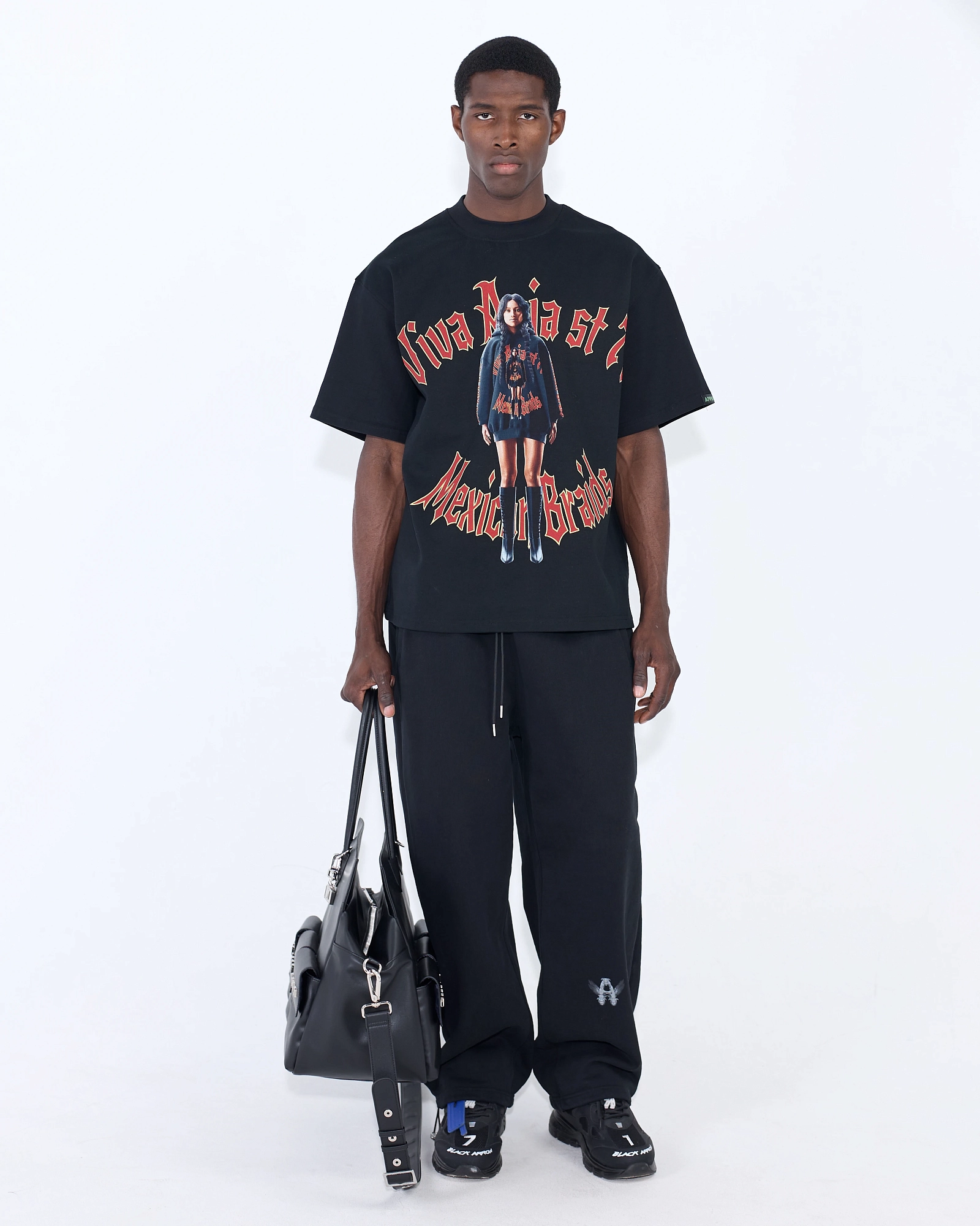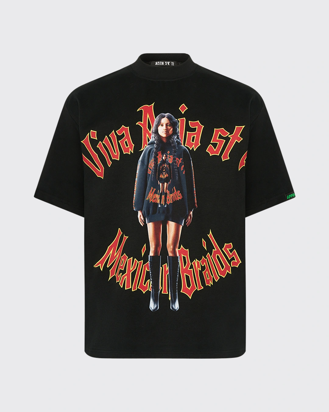 MEXICAN BRAIDS — это визуальное заявление о культурной самоидентичности. Футболка выполнена в свободном оверсайз-крое из плотного хлопка и дополнена графичным принтом с брендированной символикой. Центральный элемент — изображение девушки и готические надписи, создающие смелое визуальное высказывание. В сочетании с объёмным низом — идеальный выбор для повседневных образов в духе современного streetwear.