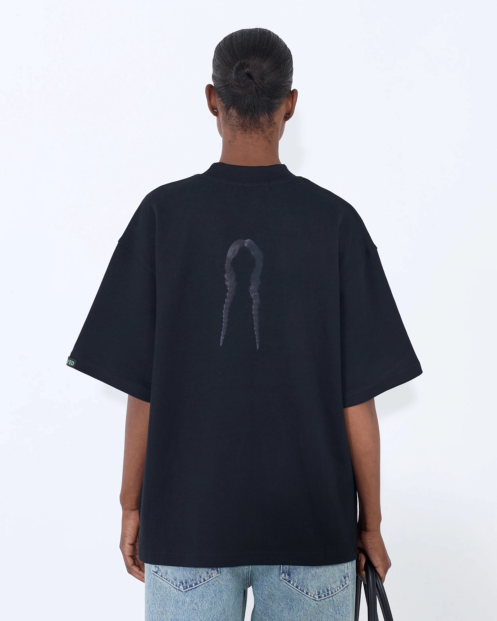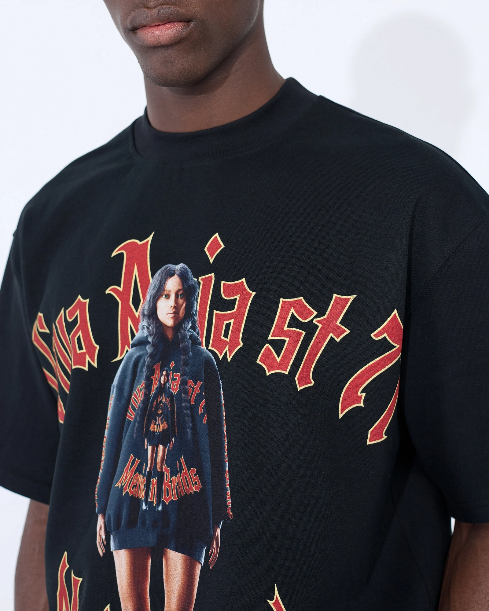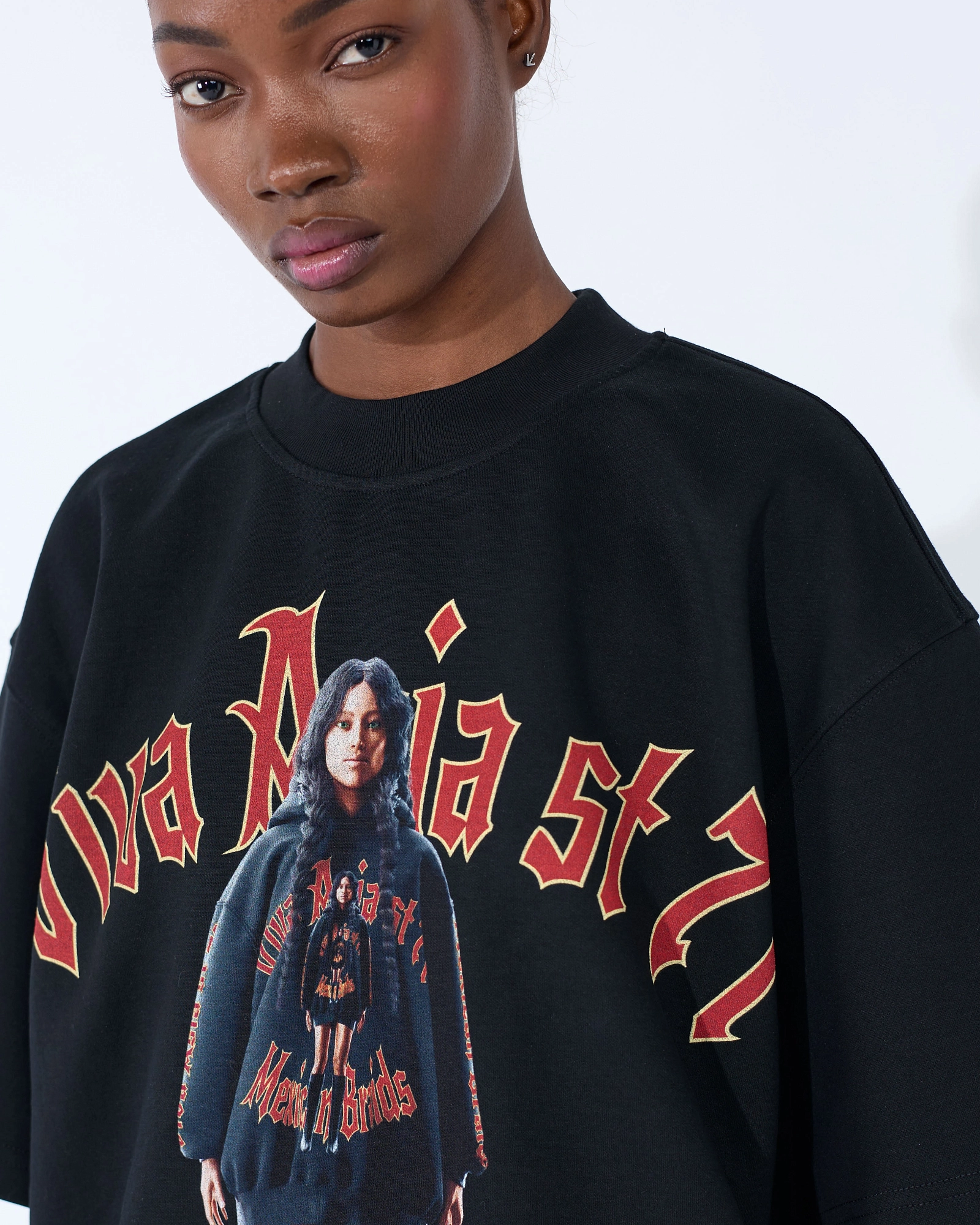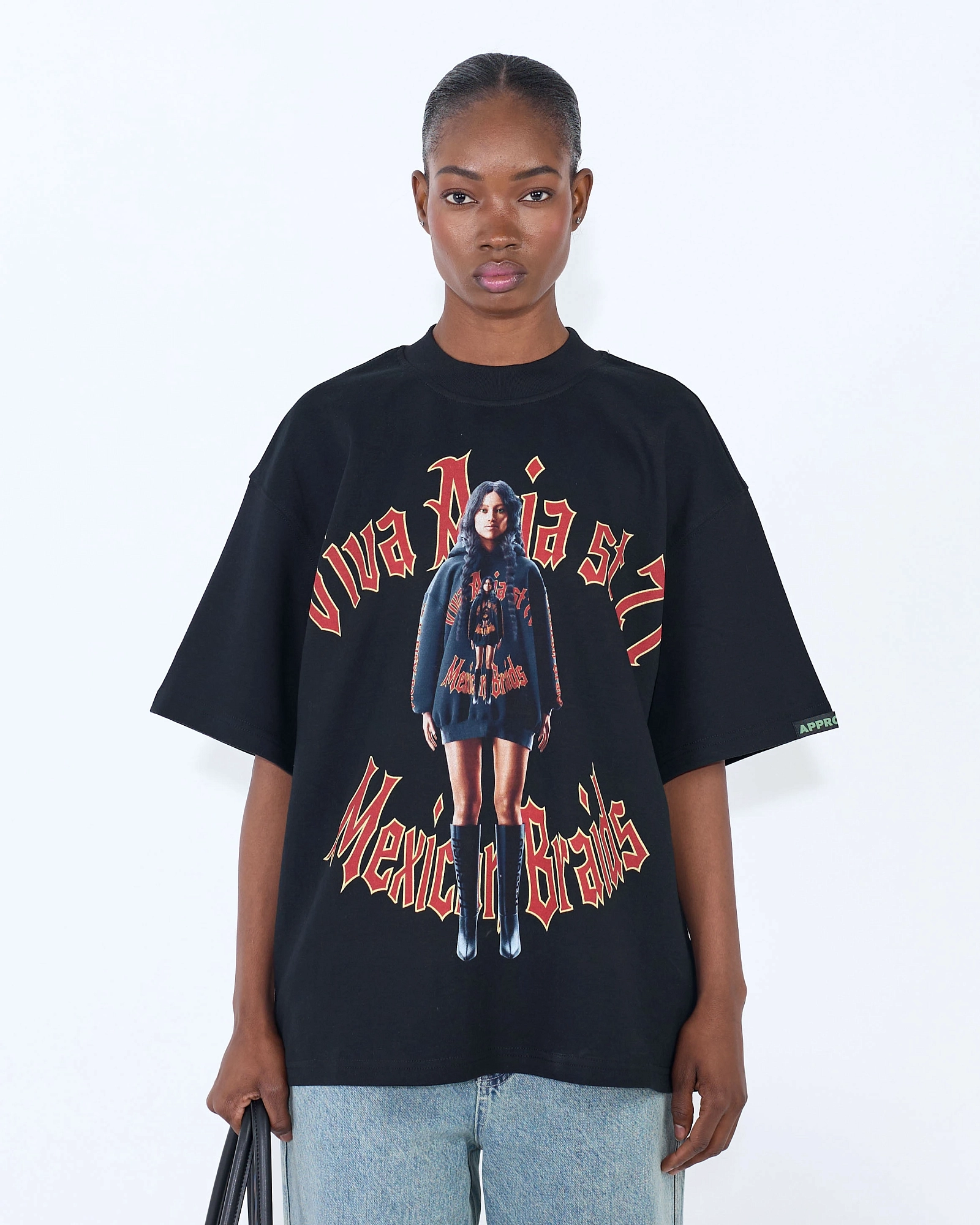 MEXICAN BRAIDS — это визуальное заявление о культурной самоидентичности. Футболка выполнена в свободном оверсайз-крое из плотного хлопка и дополнена графичным принтом с брендированной символикой. Центральный элемент — изображение девушки и готические надписи, создающие смелое визуальное высказывание. В сочетании с объёмным низом — идеальный выбор для повседневных образов в духе современного streetwear.