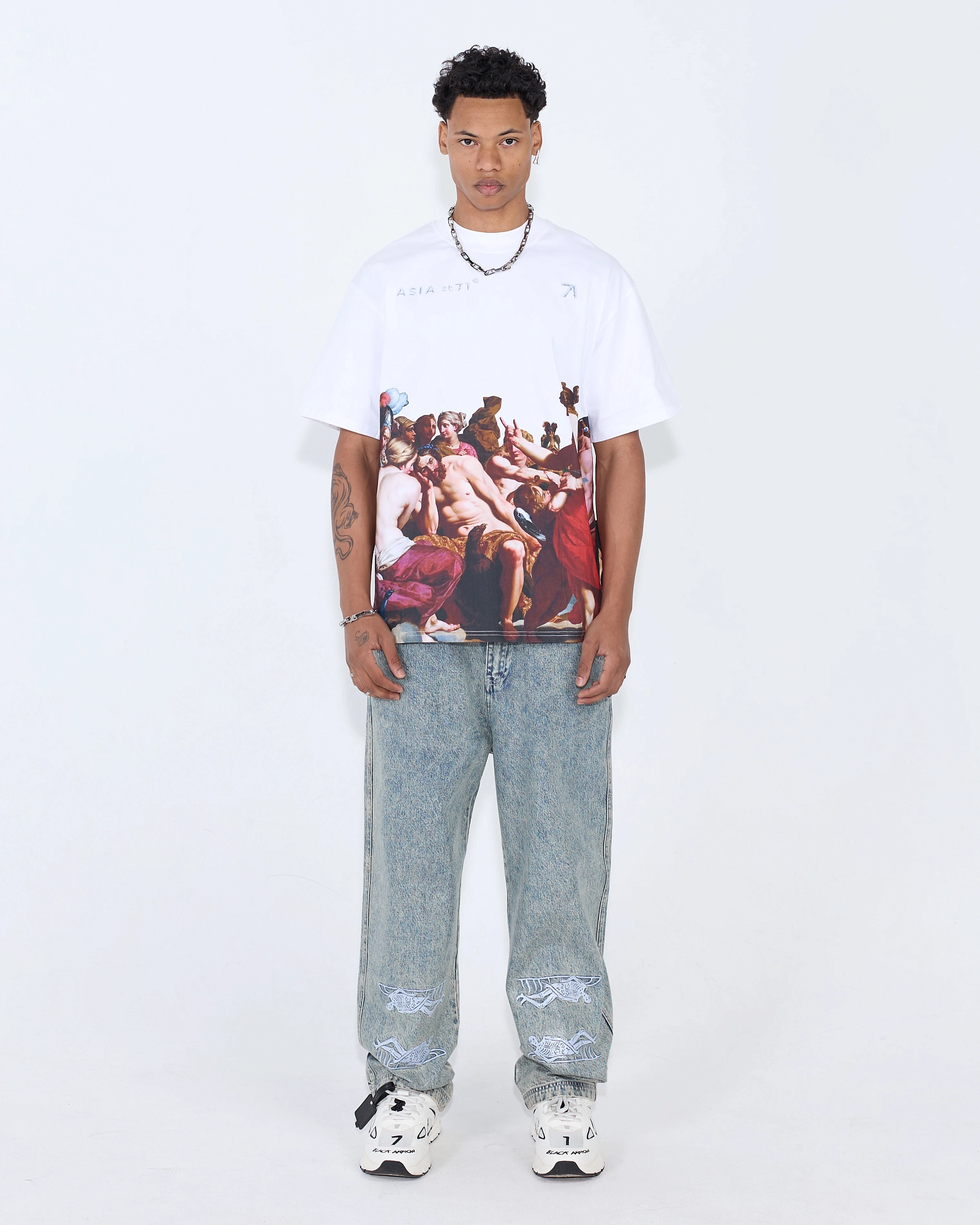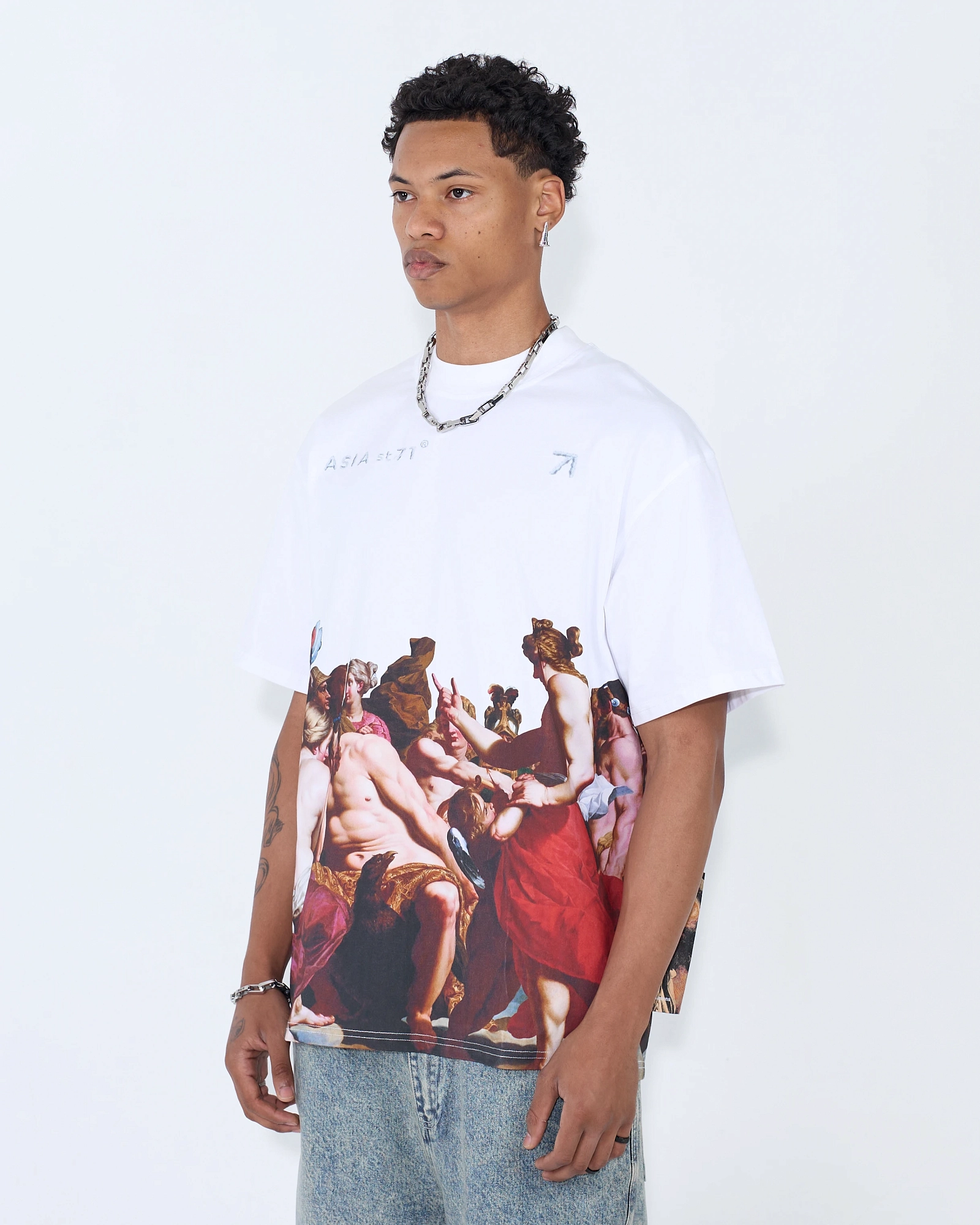 Футболка из коллекции Art Union — это синтез классического искусства и уличной моды. Модель выполнена из облегченного хлопка и дополнена выразительным принтом, вдохновлённым живописью эпохи Ренессанса. Свободный крой подчёркивает современное звучание вещи и делает её еще более комфортной в носке. Внешний имиджевый жаккардовый лейбл по шву. Рекомендуем комбинировать её с денимом или лаконичными брюками.