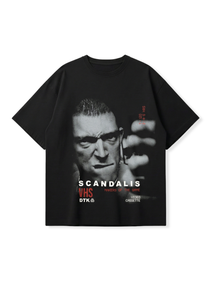 Массивная футболка свободного силуэта, вдохновленная кинематографом 90-х и эстетикой кассет. Свободный крой со спущенной линией плеча и широкими рукавами создает монументальный образ в уличном стиле. На груди расположена контрастная черно-белая шелкография с портретом Венсана Касселя, передающая атмосферу культового французского кино. Дизайн дополнен красными вертикальными надписями, имитирующими маркировку видеокассет.
