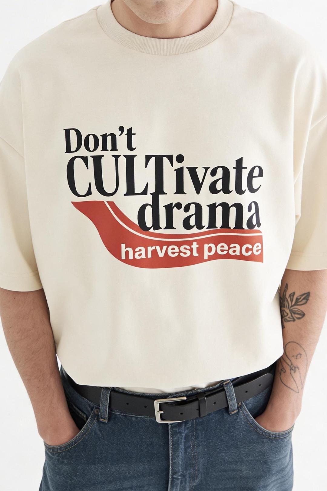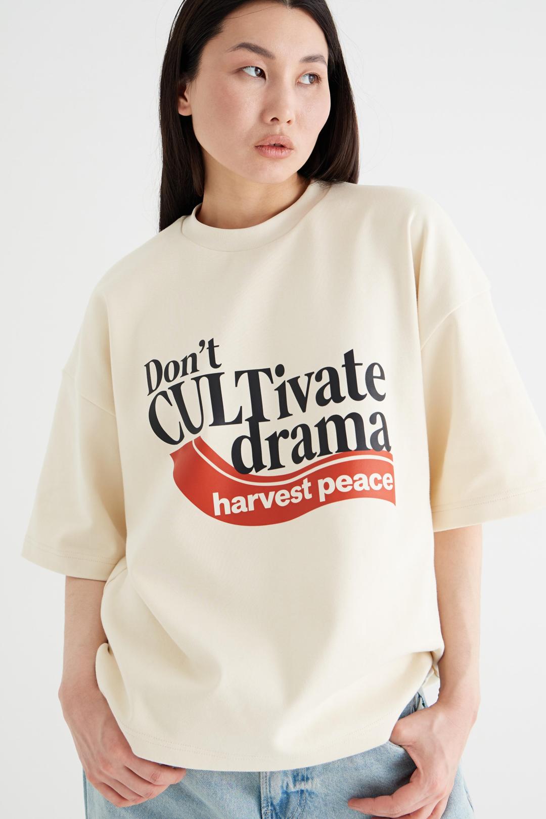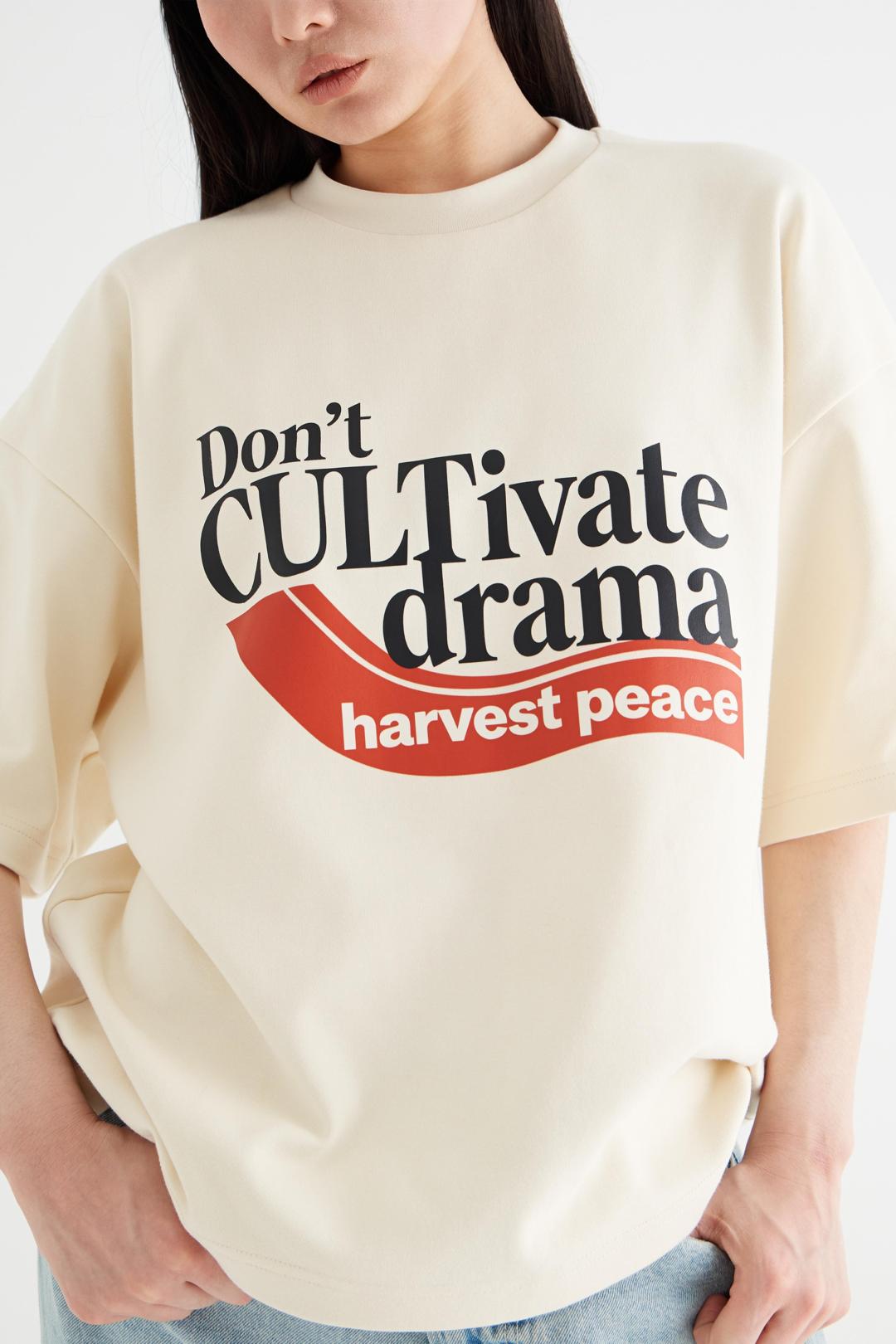 Футболка Драма — это не просто вещь, это высказывание. По центру нанесён принт с посланием: «Не разводите драму — пожинайте спокойствие» («Don't CULTivate drama — harvest peace»). Это смысловой акцент изделия, делающий футболку самостоятельным элементом гардероба и способом самовыражения.