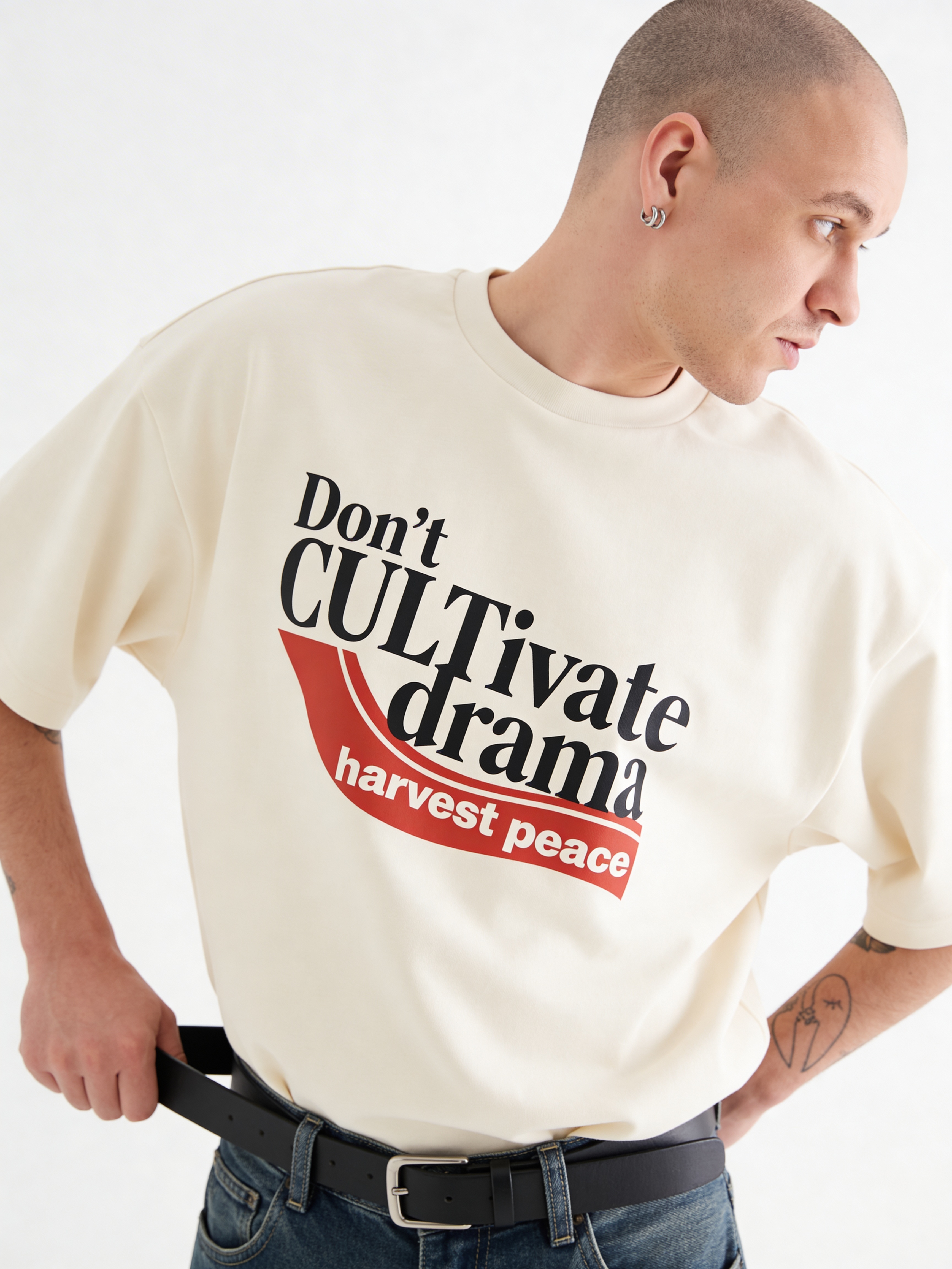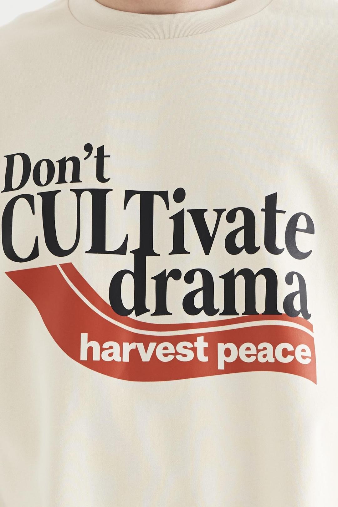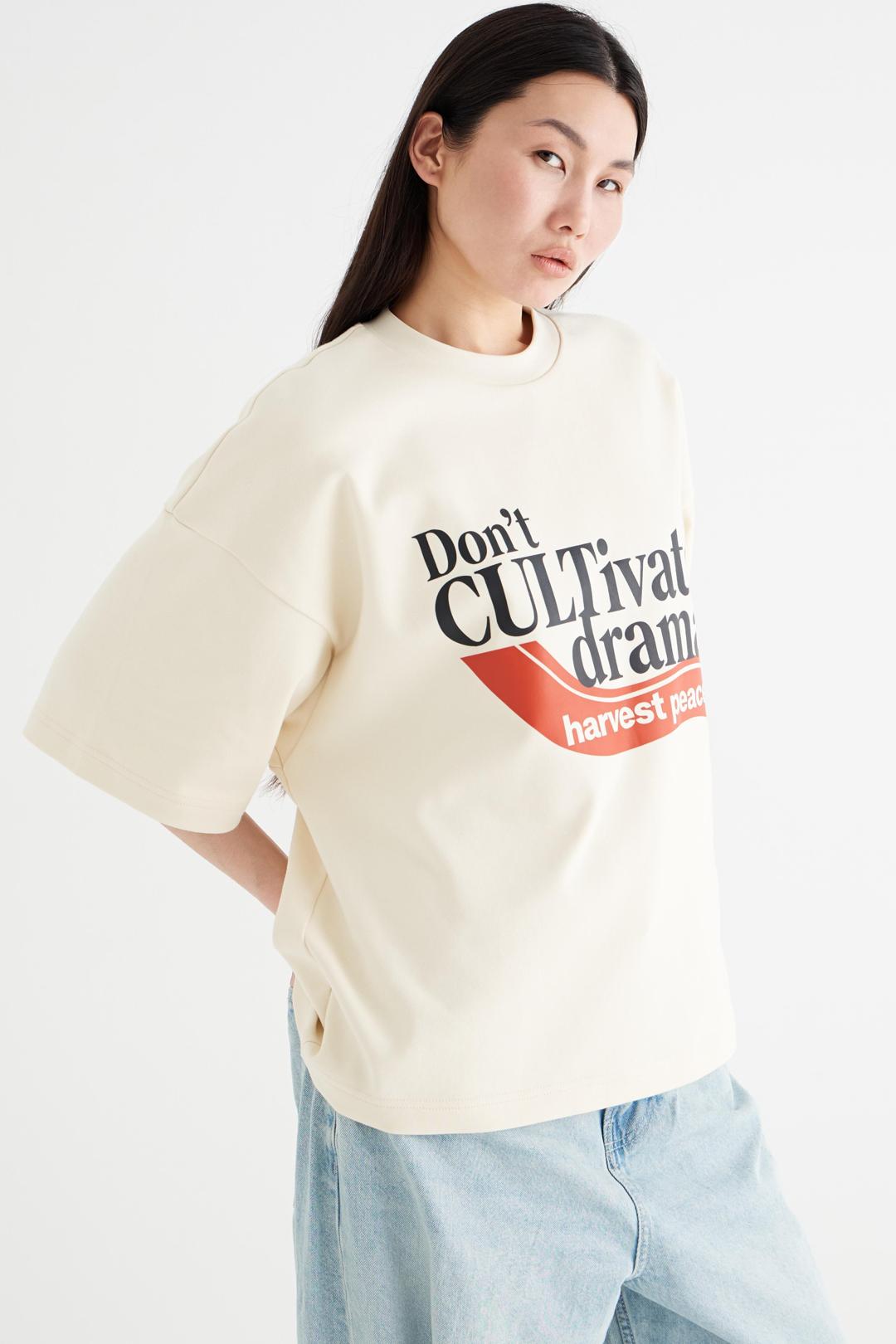 Футболка Драма — это не просто вещь, это высказывание. По центру нанесён принт с посланием: «Не разводите драму — пожинайте спокойствие» («Don't CULTivate drama — harvest peace»). Это смысловой акцент изделия, делающий футболку самостоятельным элементом гардероба и способом самовыражения.