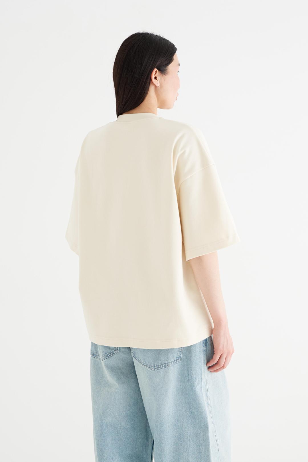 Укороченный силуэт оверсайз обеспечивает комфортную посадку и современную пропорцию в образе. Воротник из эластичной рибаны, внутренний шов горловины обработан киперной лентой. Втачной одношовный рукав со спущенным плечом создаёт естественную линию.