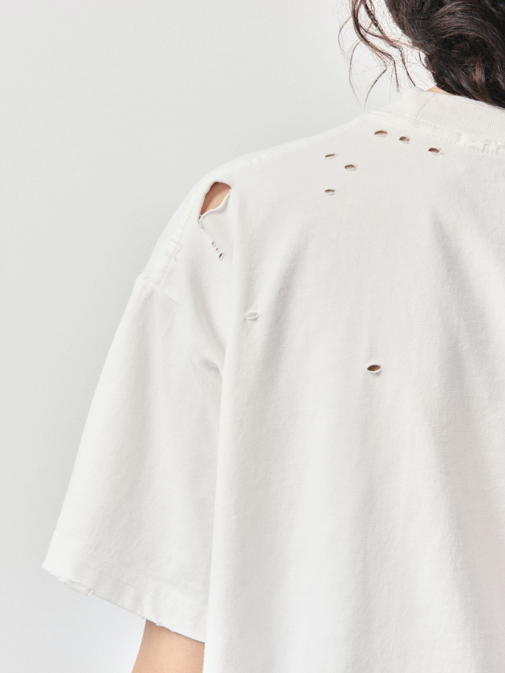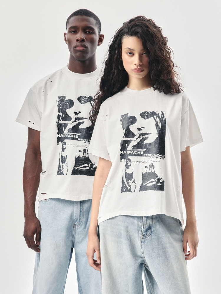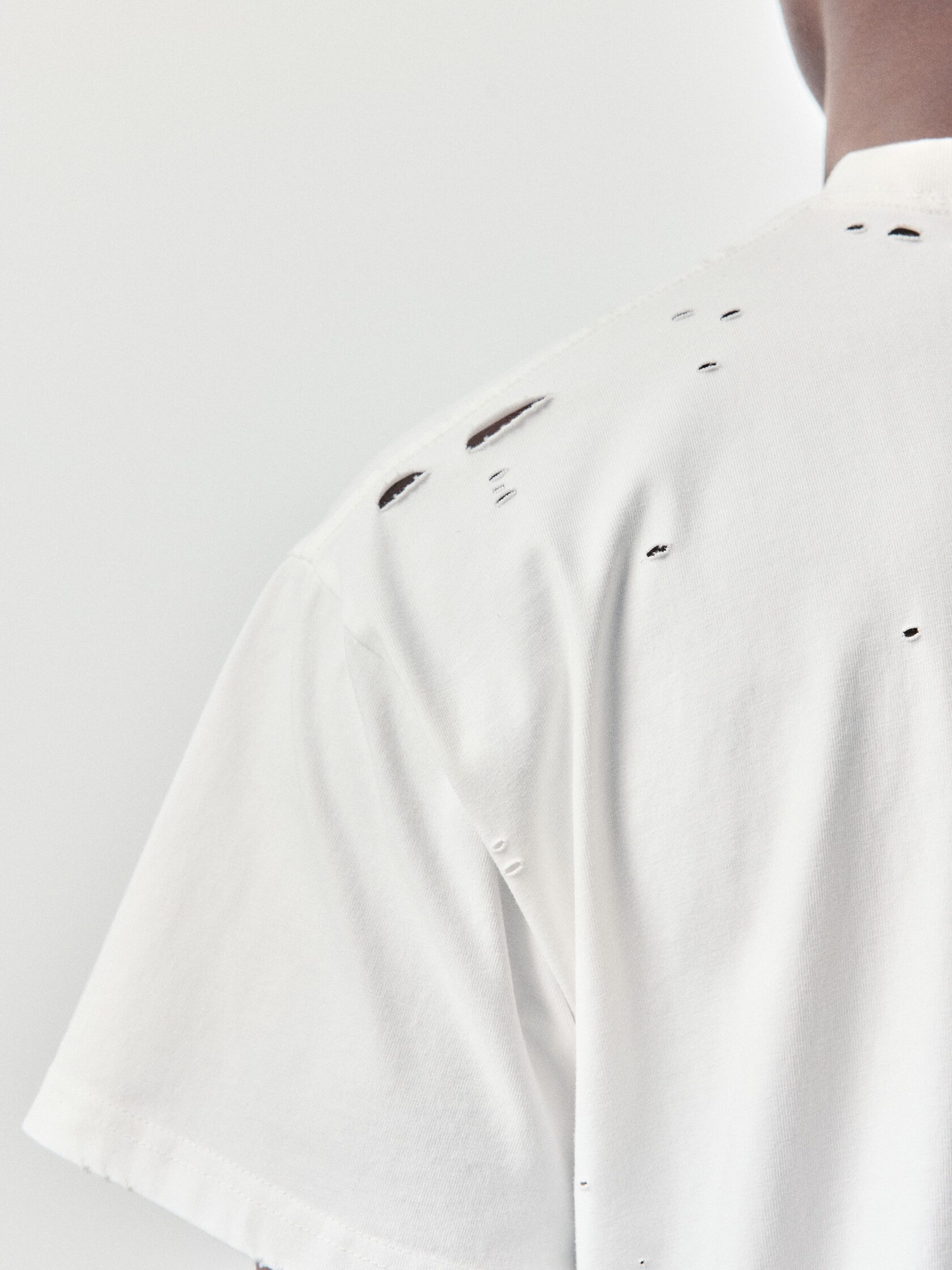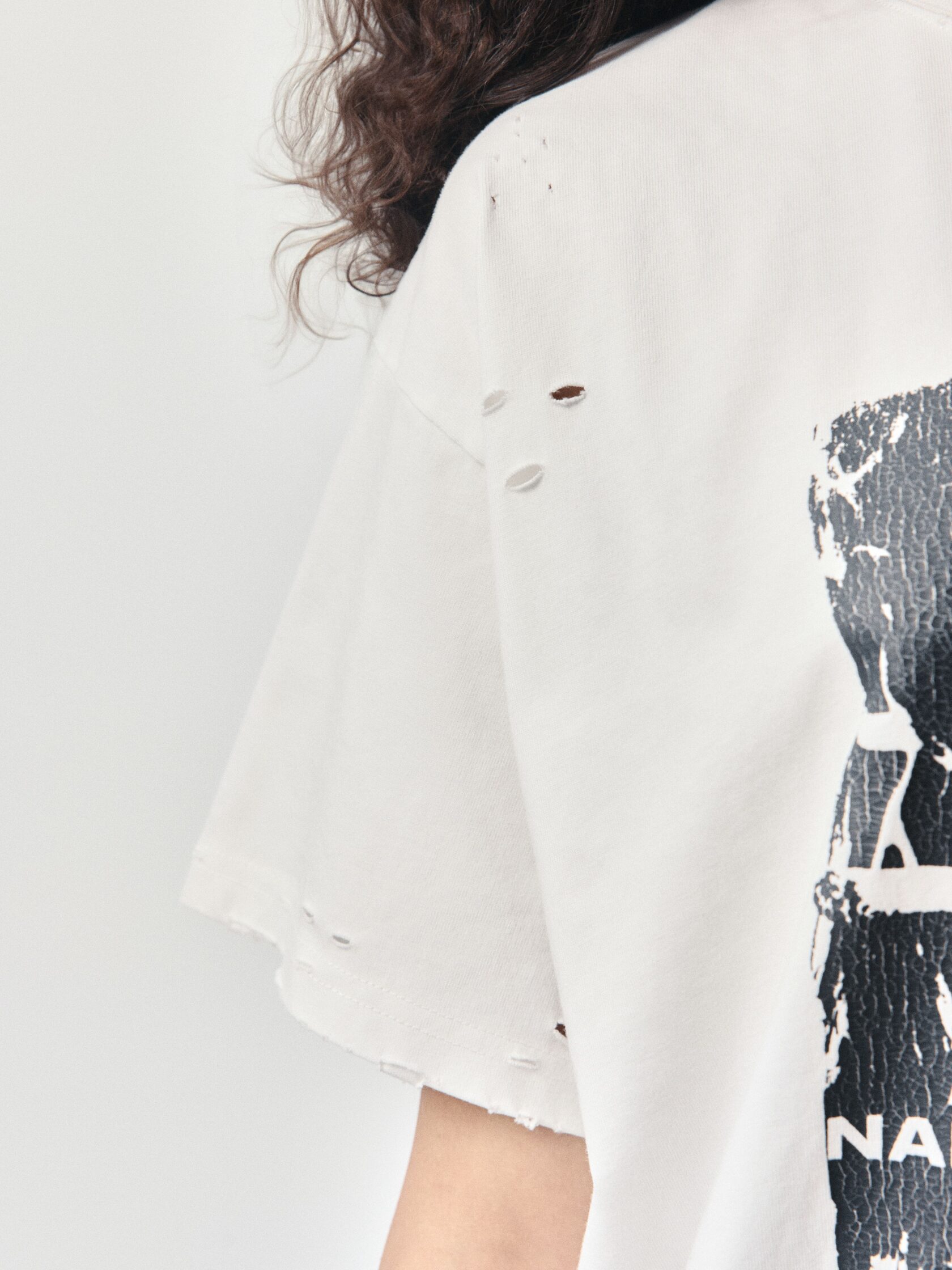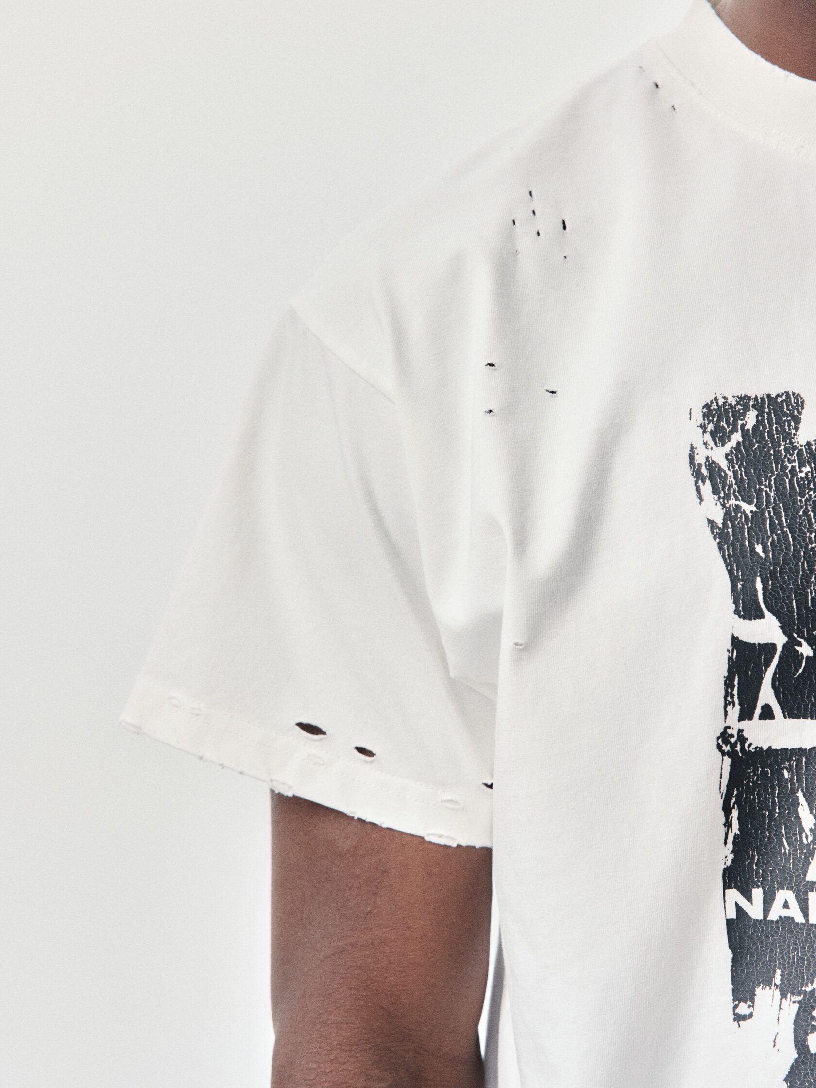 Футболка классического кроя из 100% хлопка плотностью 240 г/м². Дизайн модели создан вручную: уникальный принт нанесен методом ручной печати, а декоративные разрывы добавляют индивидуальный характер. Финальная обработка придает хлопку приятную мягкость и легкий винтажный оттенок, который естественно сочетается с элементами состаривания. Универсальный крой позволяет сочетать футболку с джинсами, худи или курткой из коллекции.