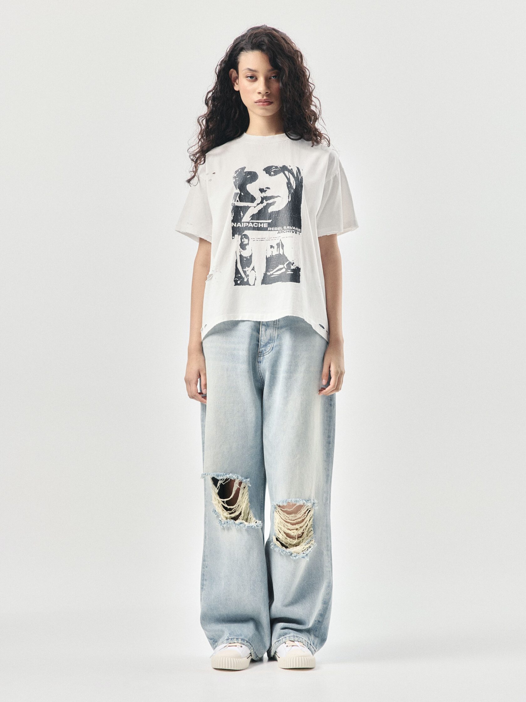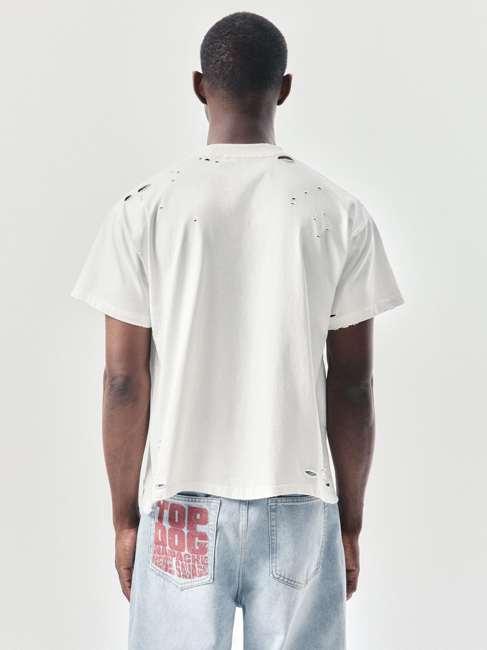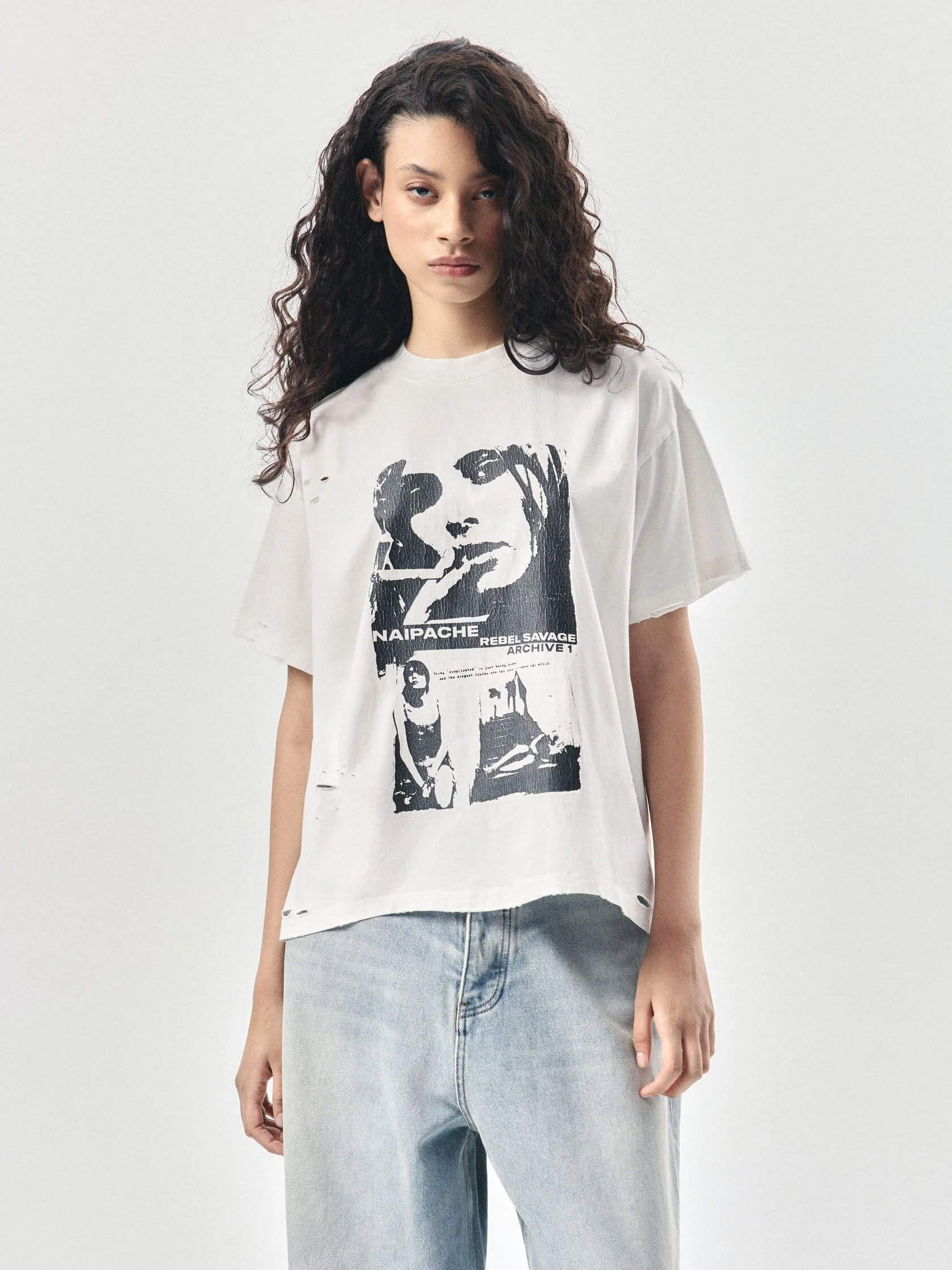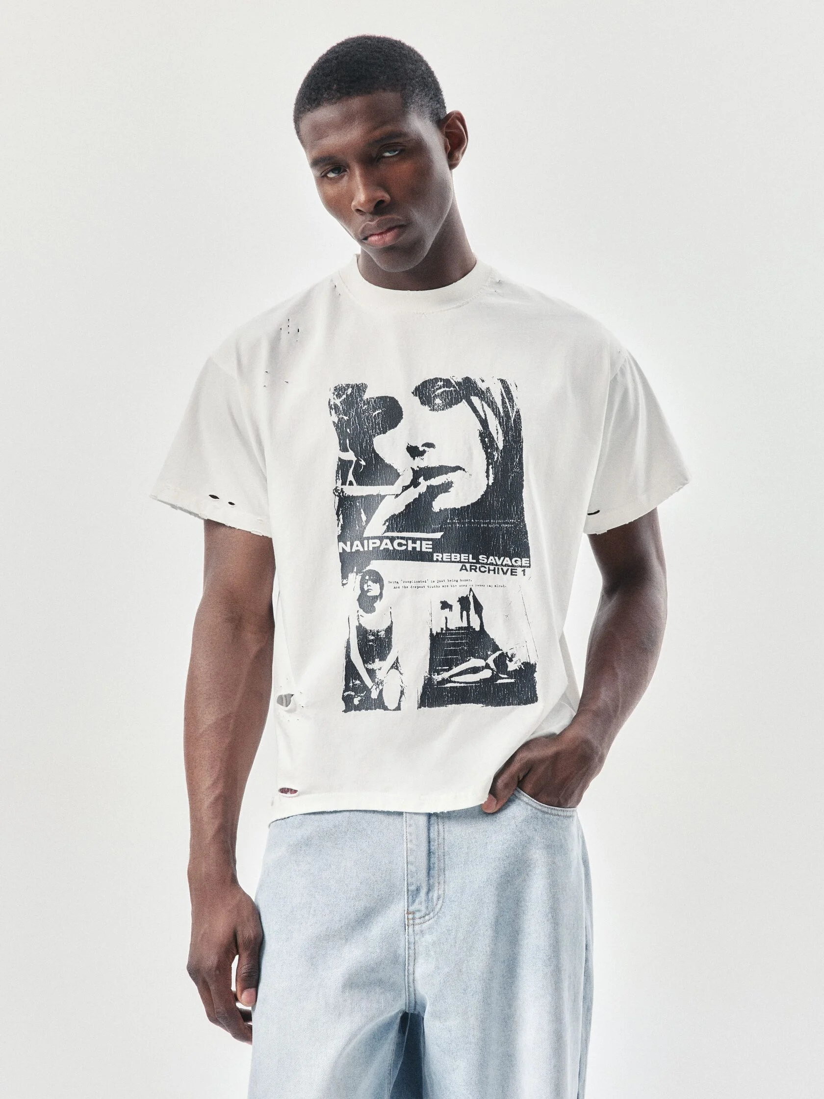 Футболка классического кроя из 100% хлопка плотностью 240 г/м². Дизайн модели создан вручную: уникальный принт нанесен методом ручной печати, а декоративные разрывы добавляют индивидуальный характер. Финальная обработка придает хлопку приятную мягкость и легкий винтажный оттенок, который естественно сочетается с элементами состаривания. Универсальный крой позволяет сочетать футболку с джинсами, худи или курткой из коллекции.