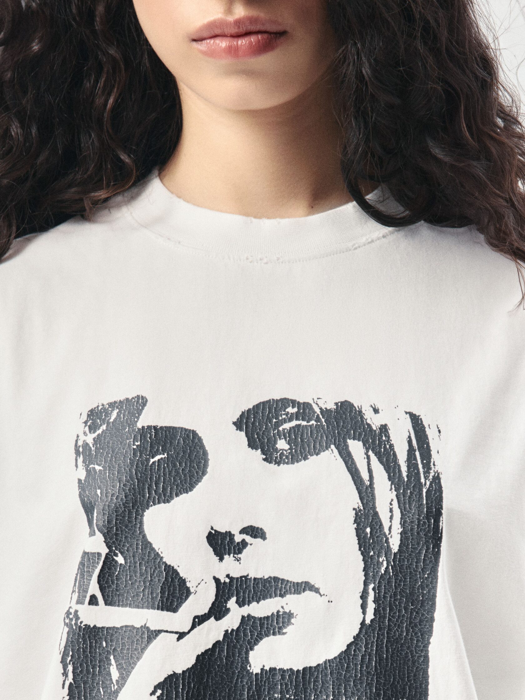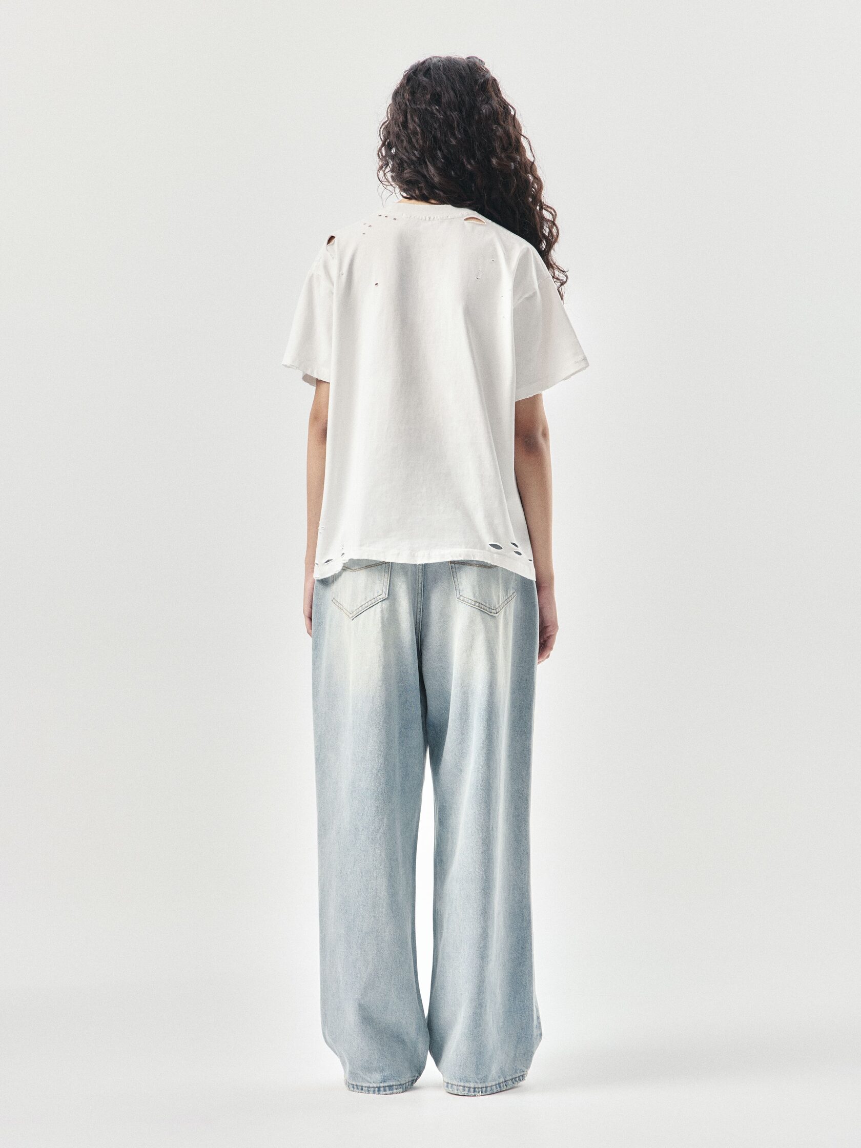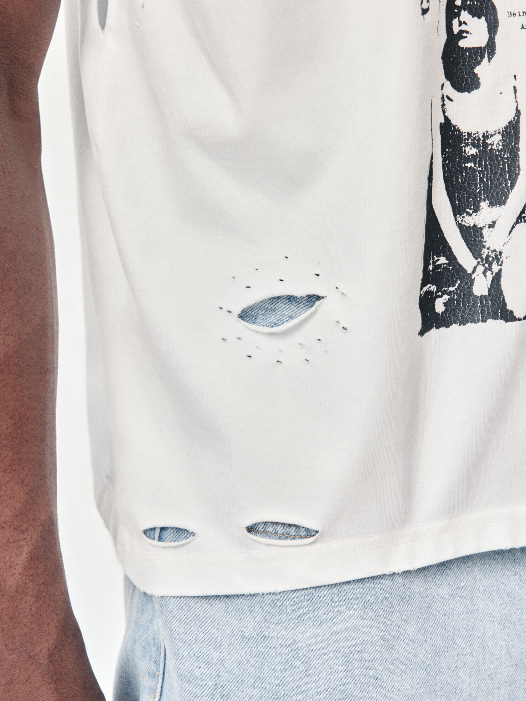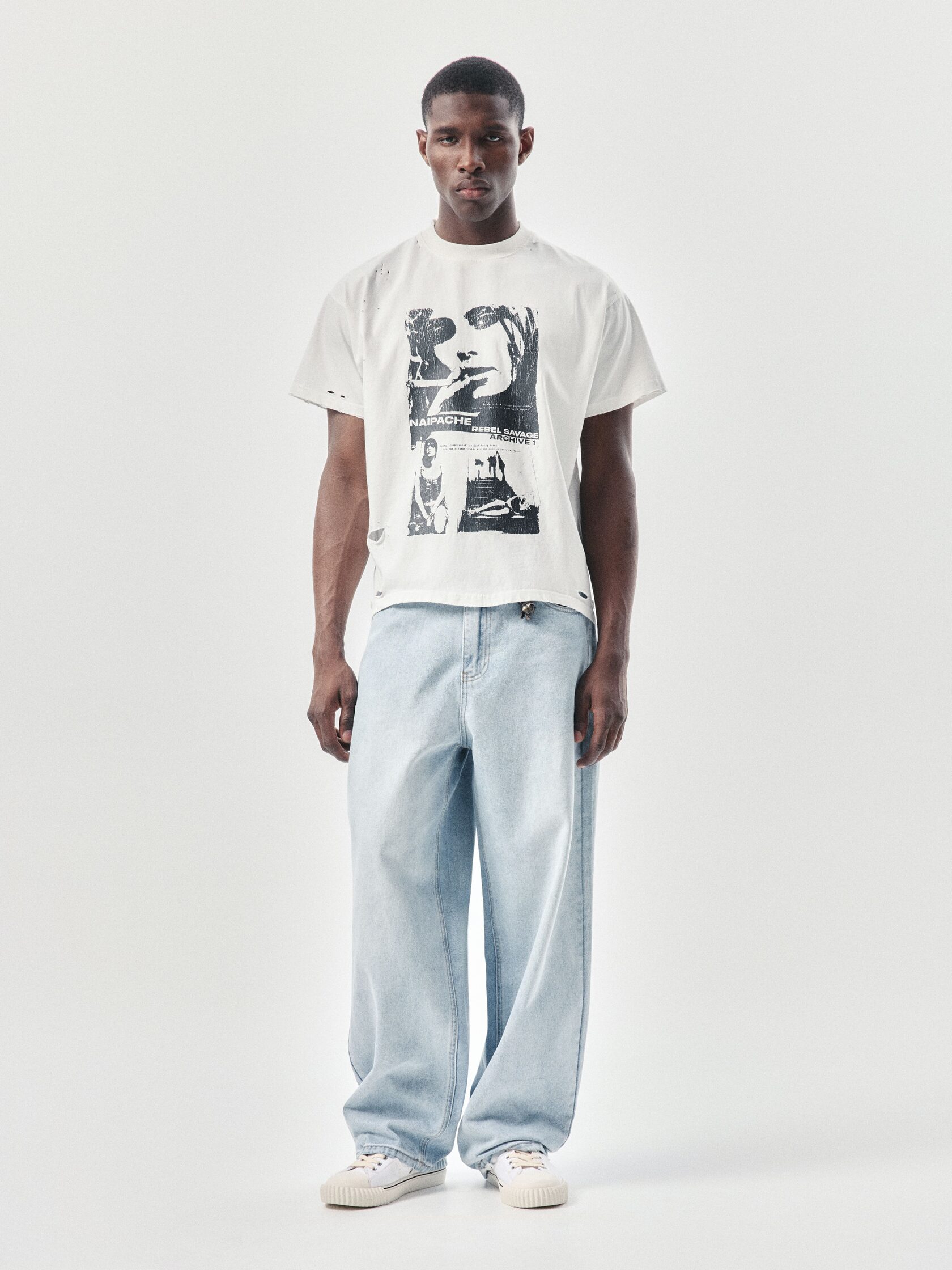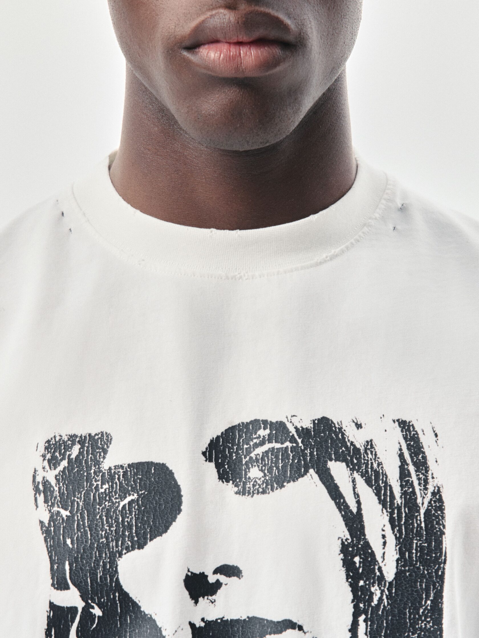 Футболка классического кроя из 100% хлопка плотностью 240 г/м². Дизайн модели создан вручную: уникальный принт нанесен методом ручной печати, а декоративные разрывы добавляют индивидуальный характер. Финальная обработка придает хлопку приятную мягкость и легкий винтажный оттенок, который естественно сочетается с элементами состаривания. Универсальный крой позволяет сочетать футболку с джинсами, худи или курткой из коллекции.