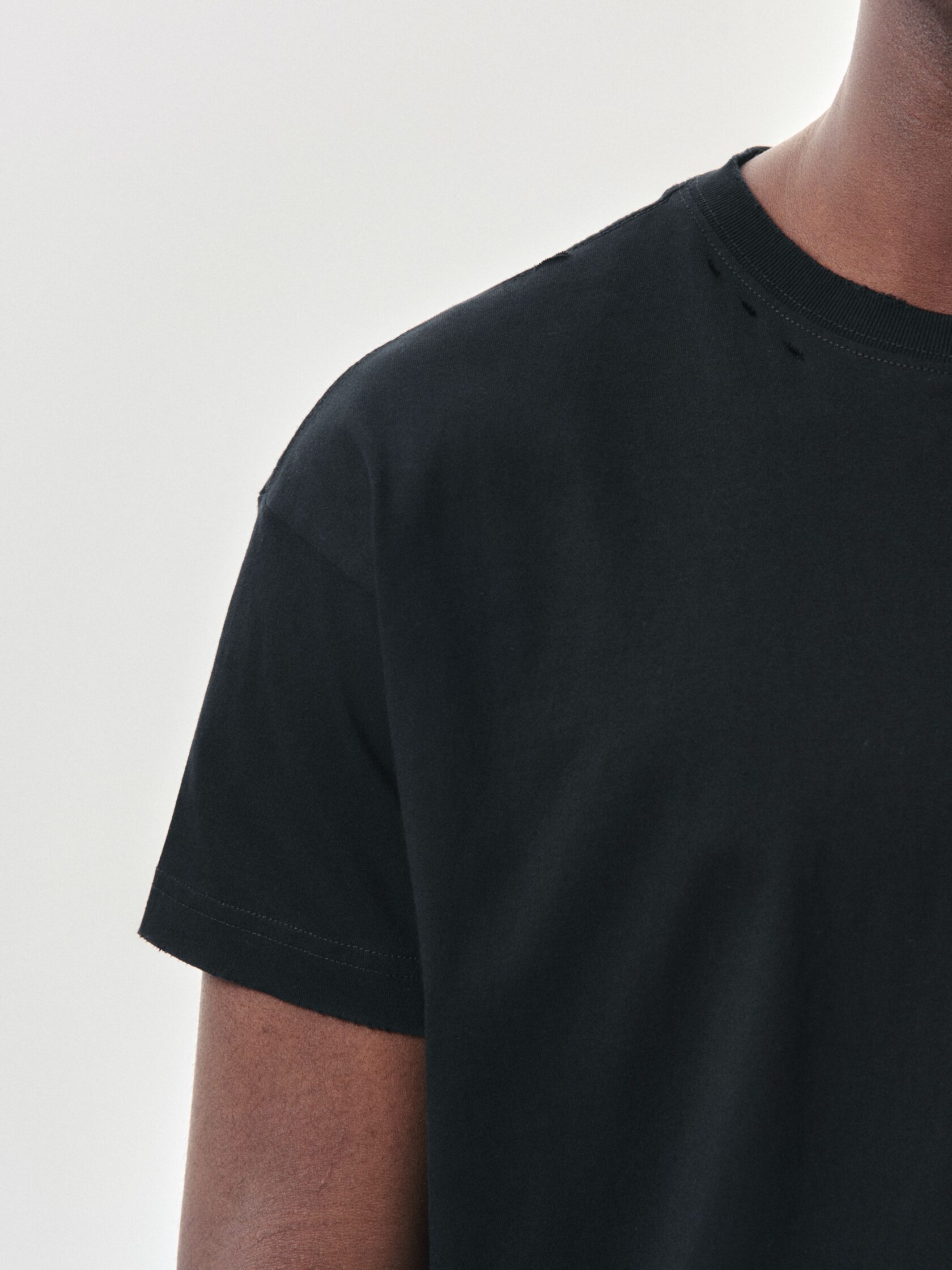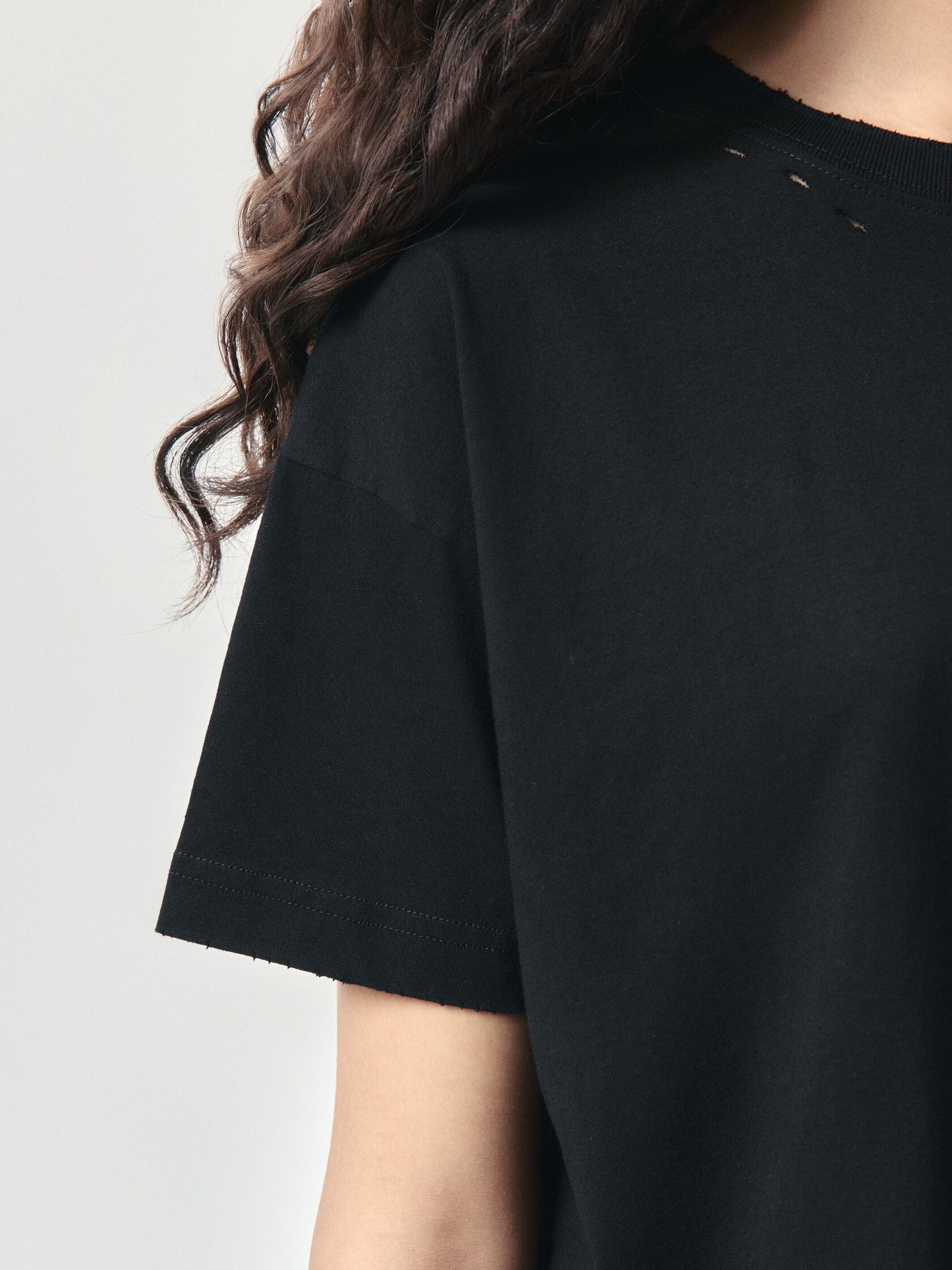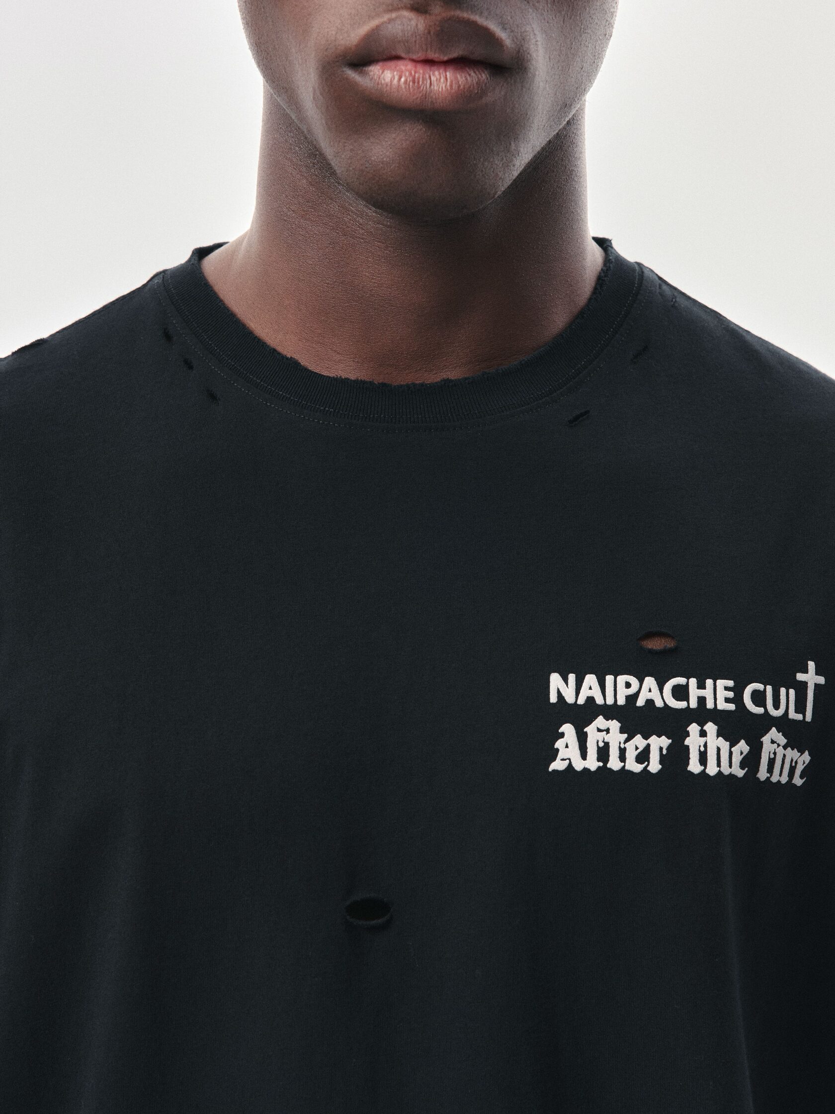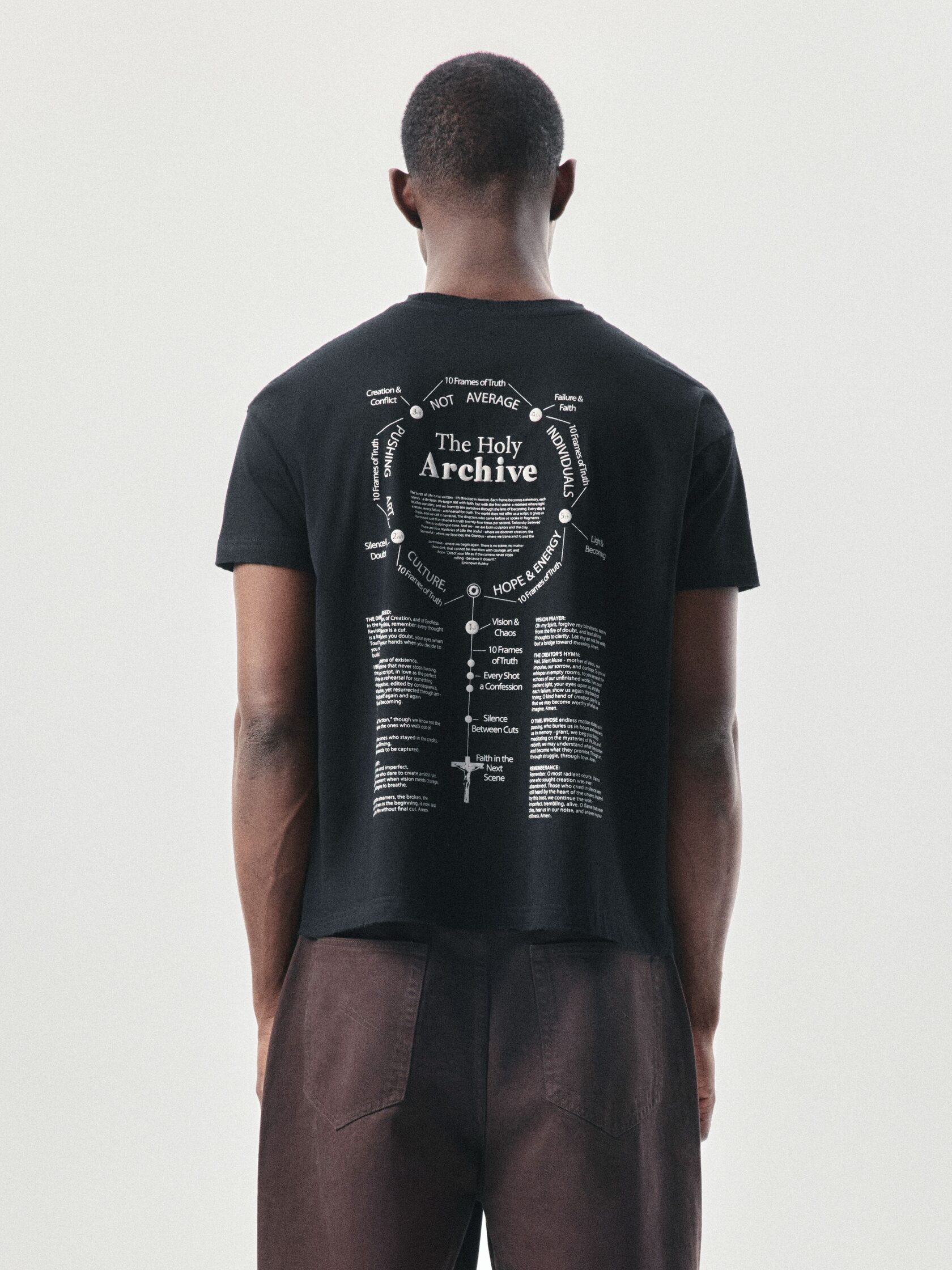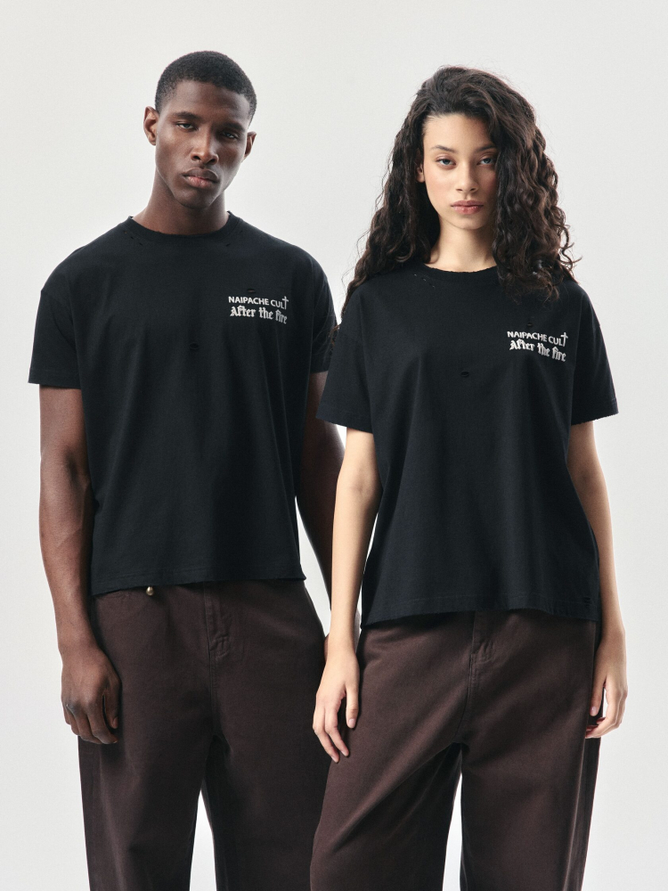 Футболка из 100% хлопка плотностью 180 г/м² с крупным текстовым принтом во всю спину. Модель выделяется комплексной обработкой, где ручная печать обеспечивает уникальность графики. Ключевой этап - спрей-эффект «whiskers» - создаёт характерные светлые потёртости, отсылающие к денимной эстетике, а декоративные разрывы усиливают винтажный характер. Финальная обработка выполняет две задачи: придаёт ткани мягкость и обеспечивает проявление эффекта «whiskers», интегрируя все элементы в целостный образ с налётом архивной вещи. Классический крой и смелая графика делают её самостоятельным акцентом, который можно сочетать с простыми джинсами, однотонным худи или носить под растёгнутой кожаной косухой, чтобы не перегружать образ.