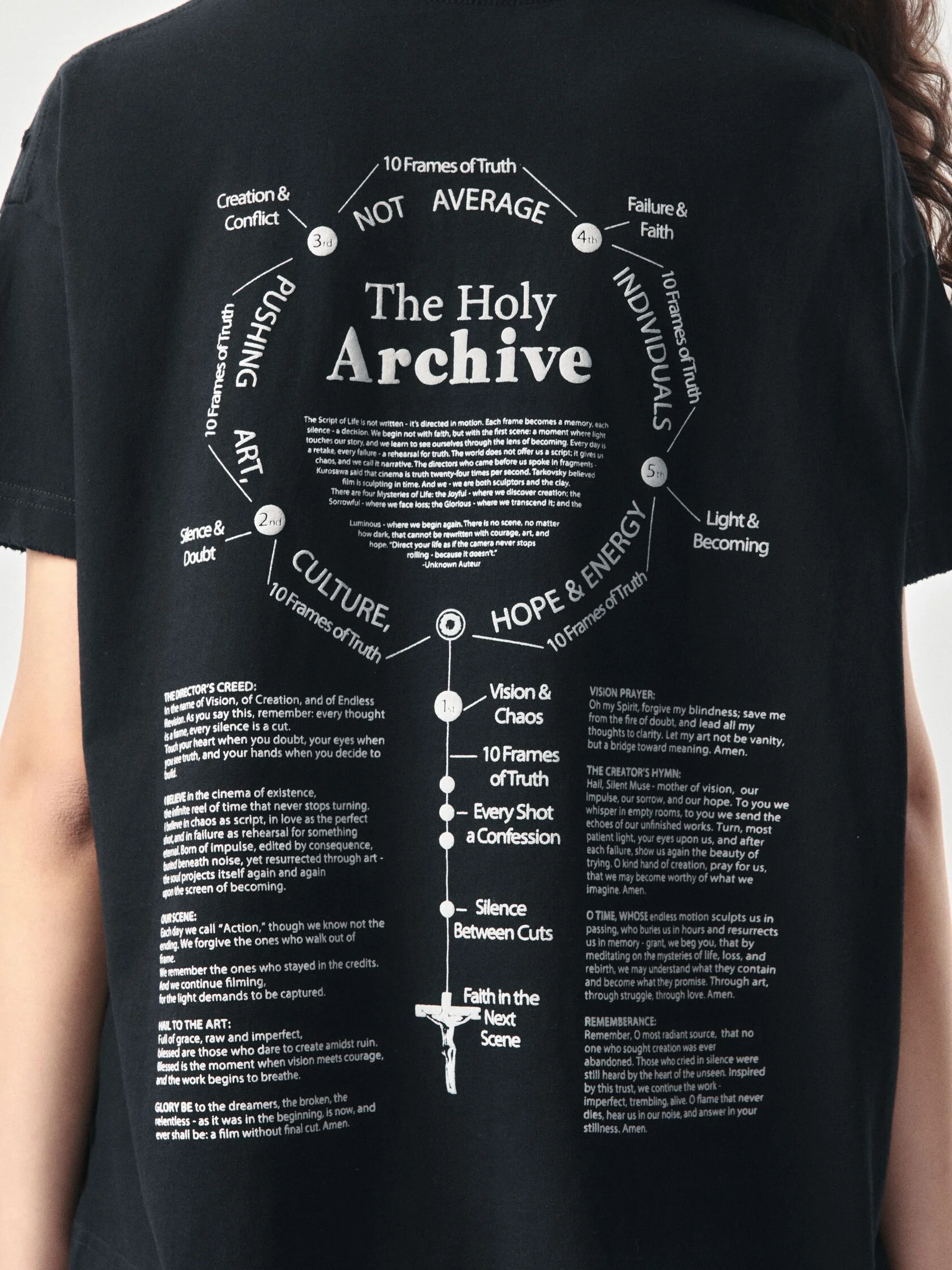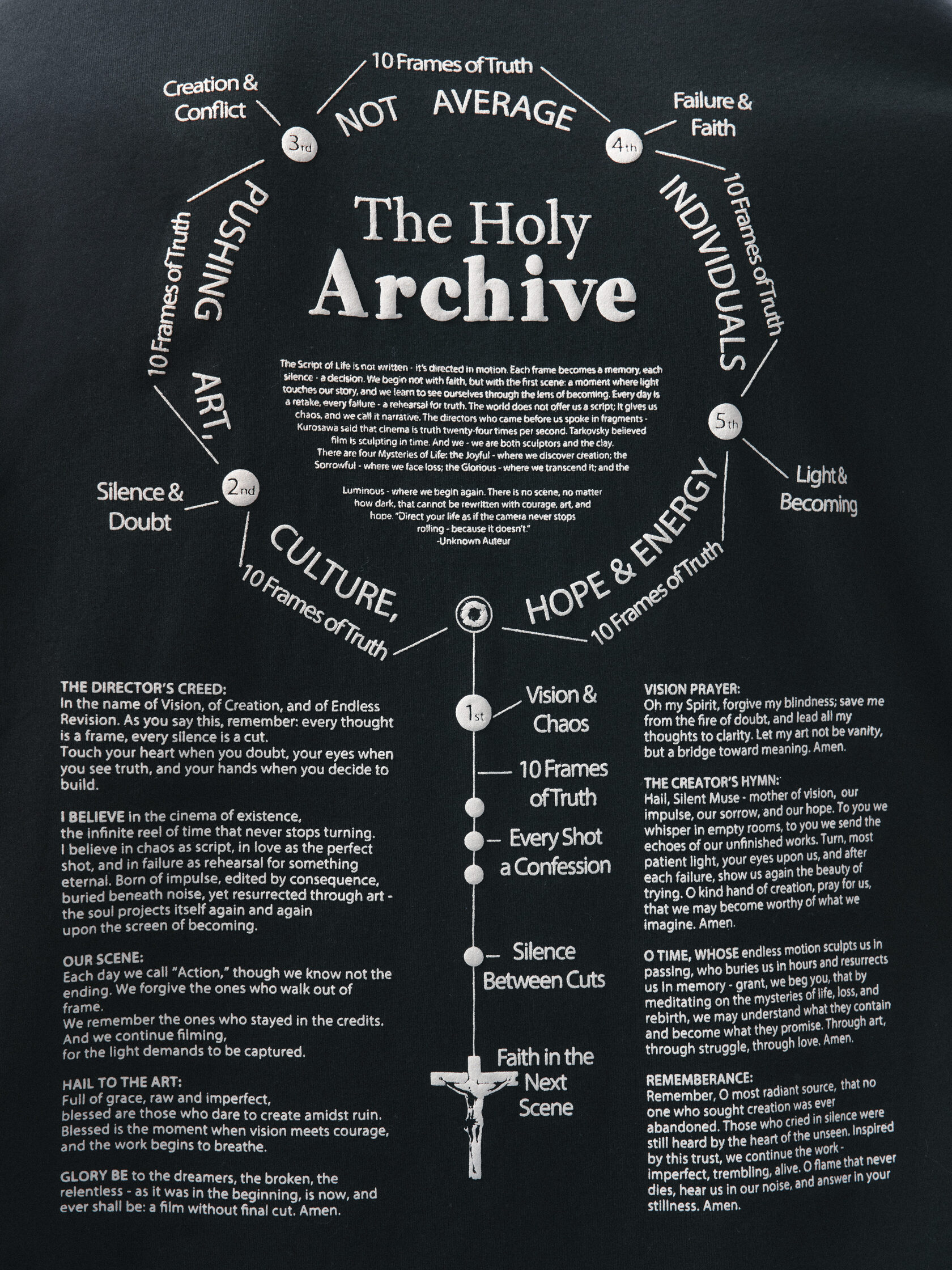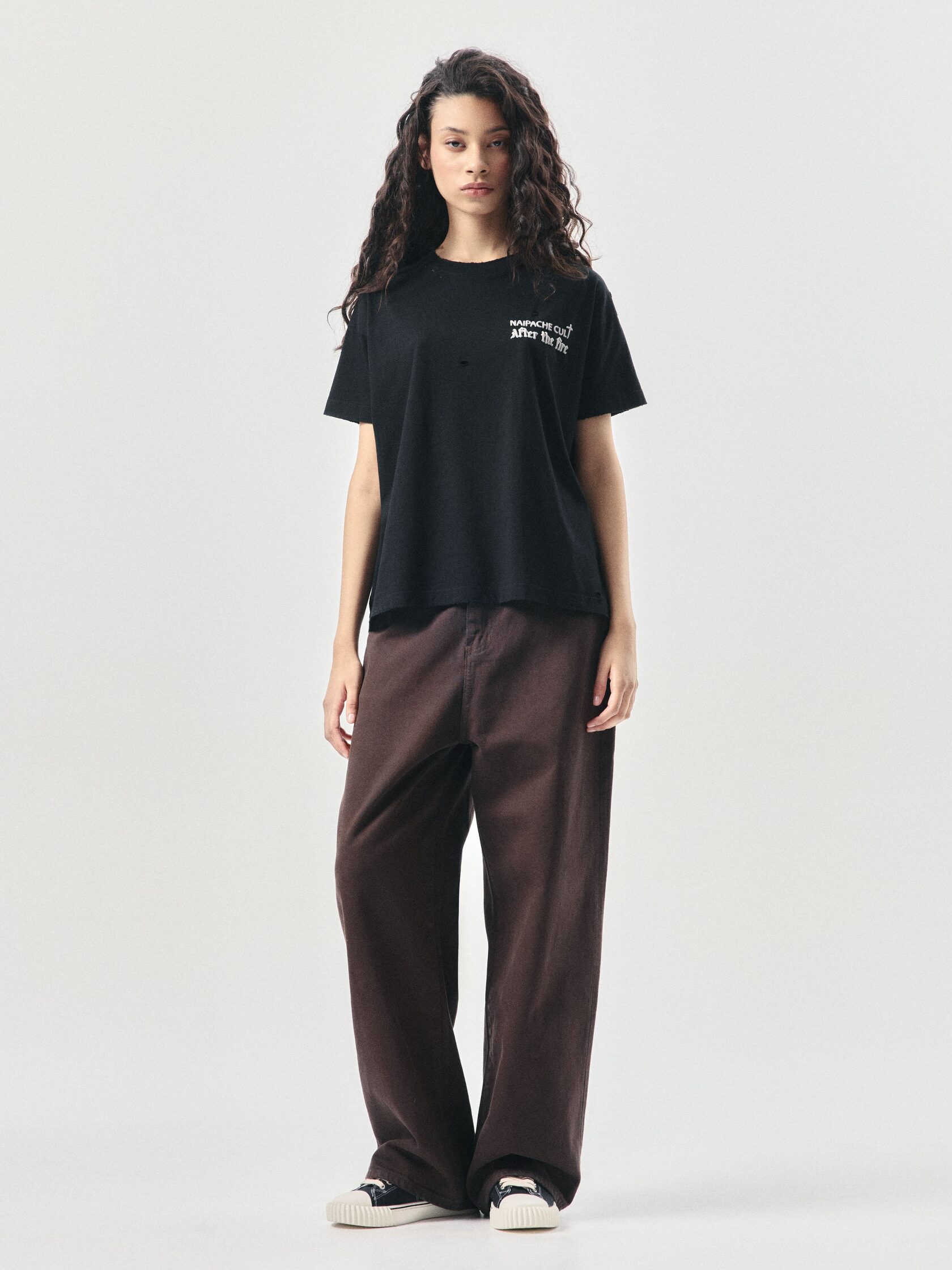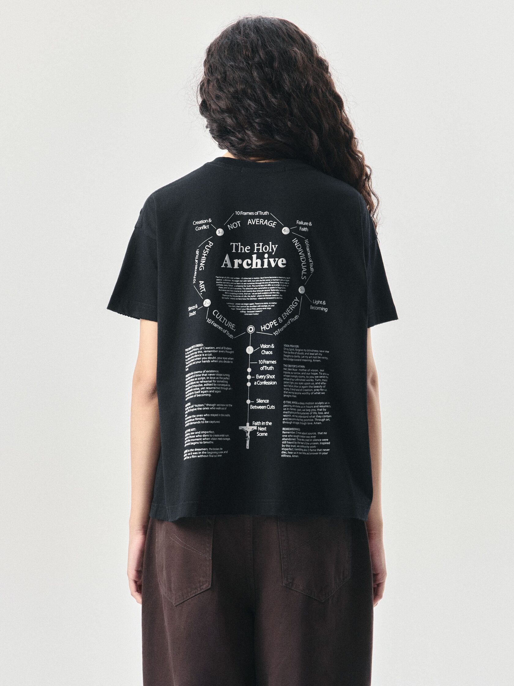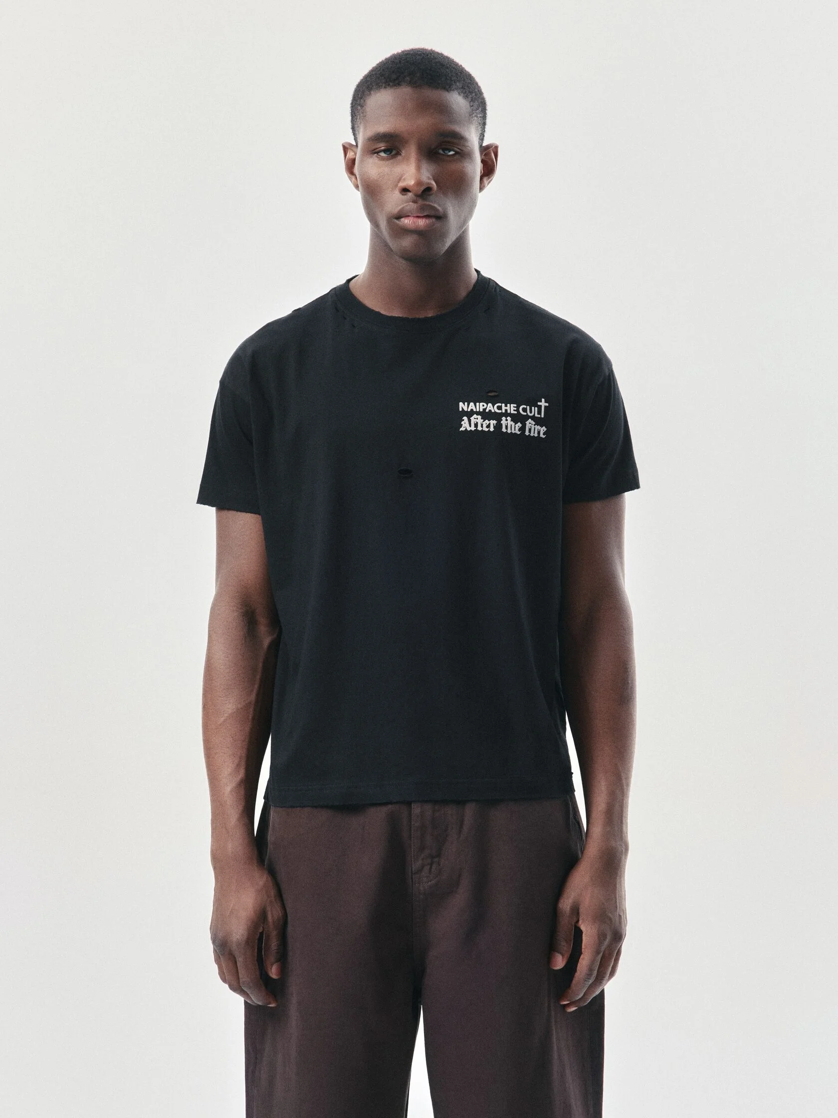 Футболка из 100% хлопка плотностью 180 г/м² с крупным текстовым принтом во всю спину. Модель выделяется комплексной обработкой, где ручная печать обеспечивает уникальность графики. Ключевой этап - спрей-эффект «whiskers» - создаёт характерные светлые потёртости, отсылающие к денимной эстетике, а декоративные разрывы усиливают винтажный характер. Финальная обработка выполняет две задачи: придаёт ткани мягкость и обеспечивает проявление эффекта «whiskers», интегрируя все элементы в целостный образ с налётом архивной вещи. Классический крой и смелая графика делают её самостоятельным акцентом, который можно сочетать с простыми джинсами, однотонным худи или носить под растёгнутой кожаной косухой, чтобы не перегружать образ.