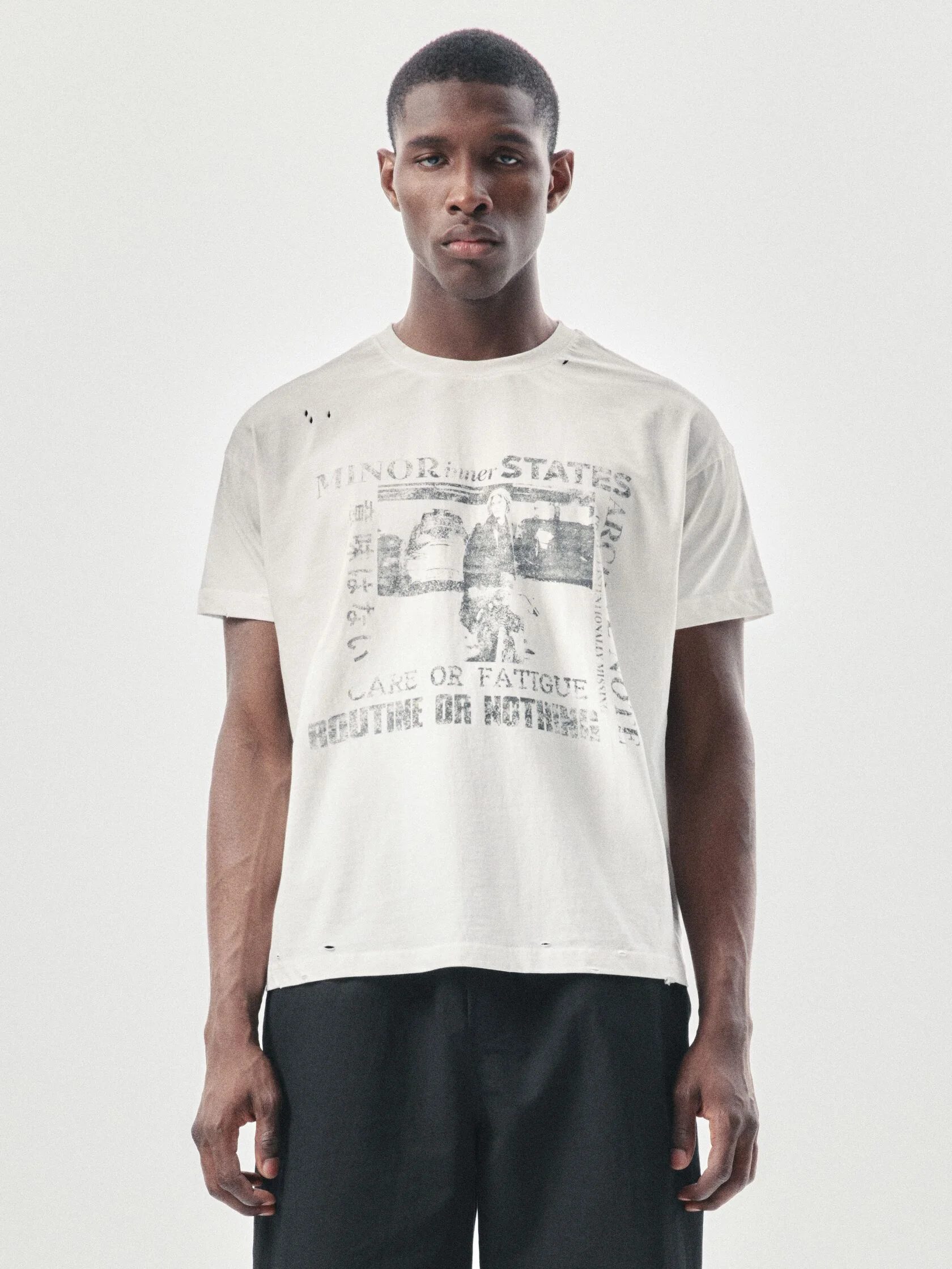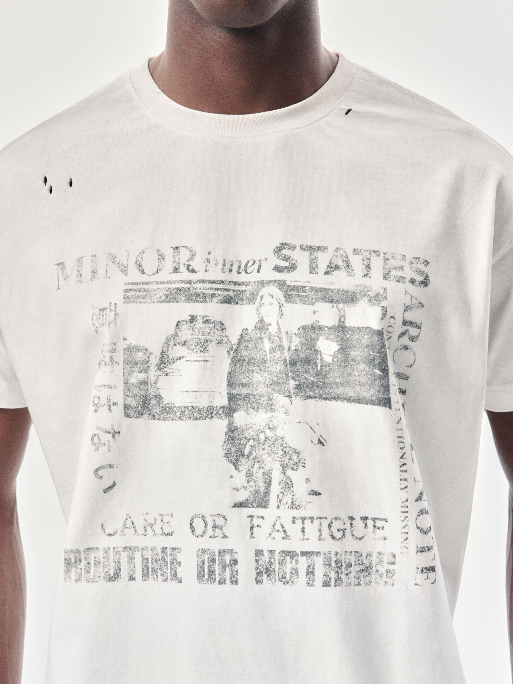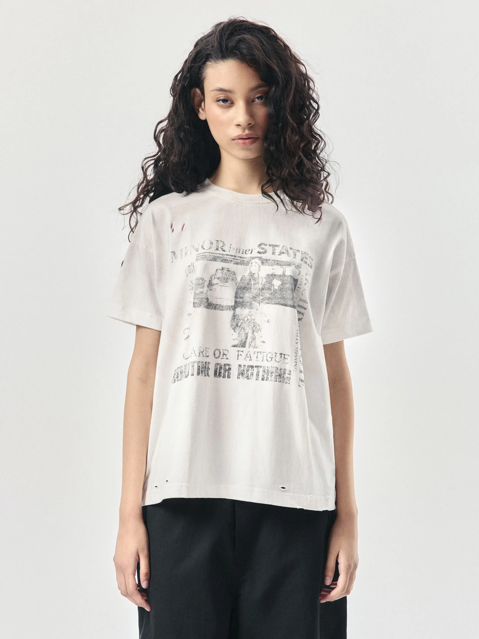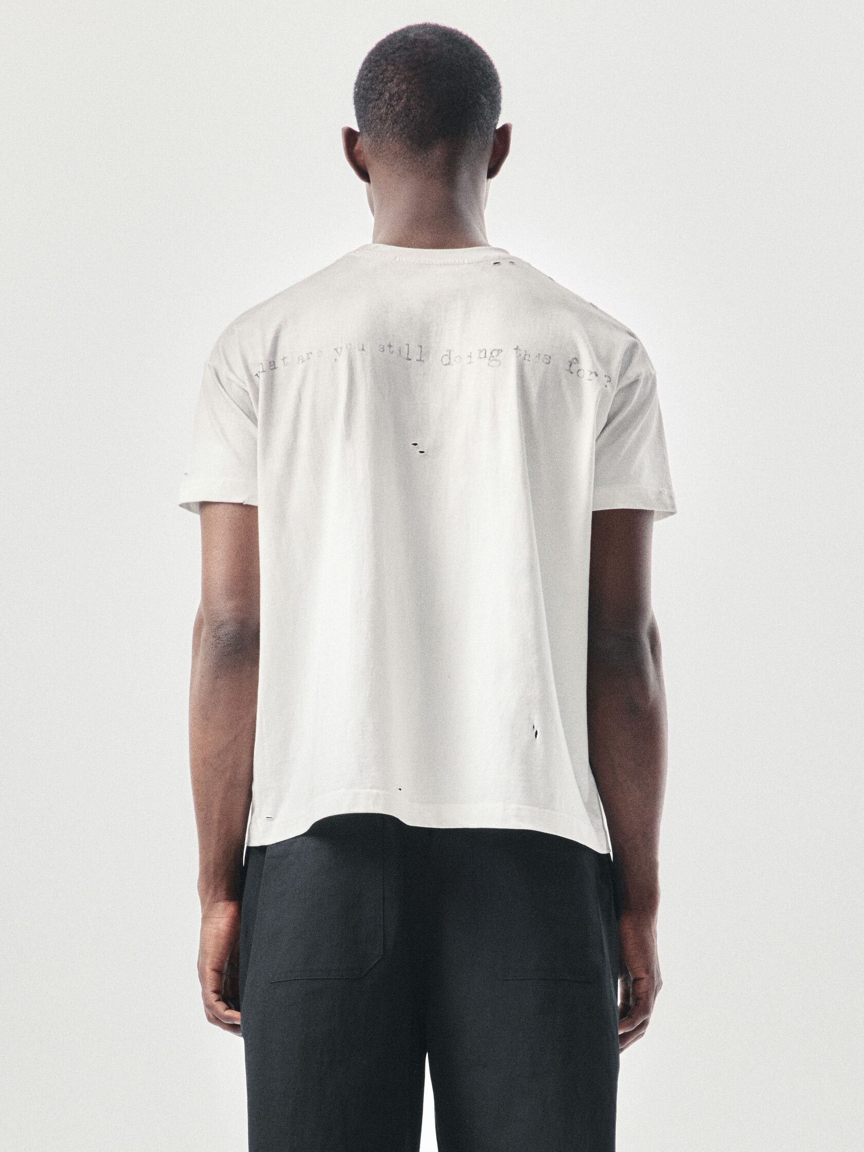 Футболка классического кроя из 100% хлопка плотностью 180 г/м². Дизайн модели создан вручную: уникальный принт нанесен методом ручной печати, а декоративные разрывы добавляют индивидуальный характер. Финальная обработка придает хлопку приятную мягкость и винтажный оттенок, который естественно сочетается с элементами состаривания. Универсальный крой позволяет сочетать футболку с джинсами, худи или курткой из коллекции.