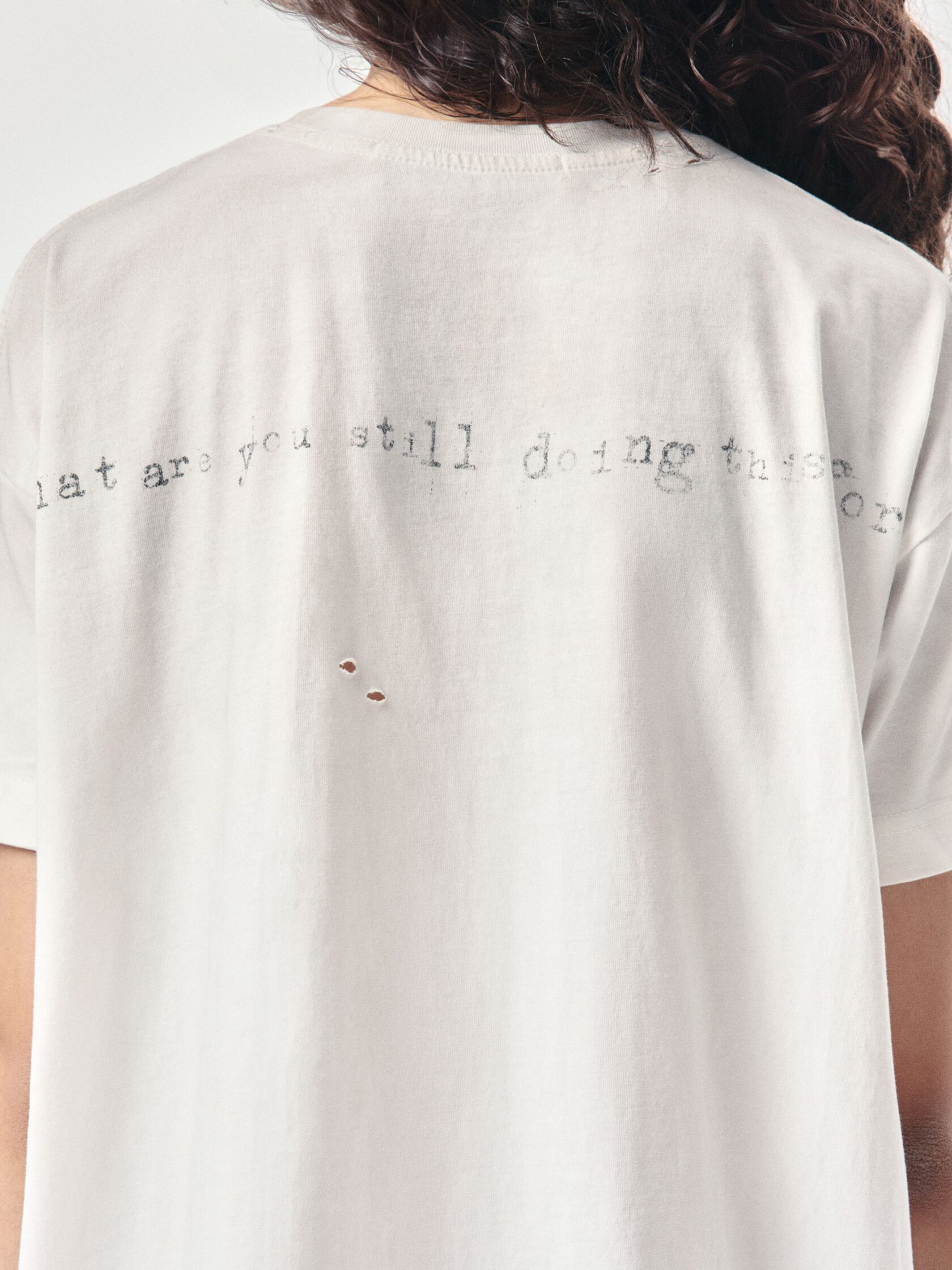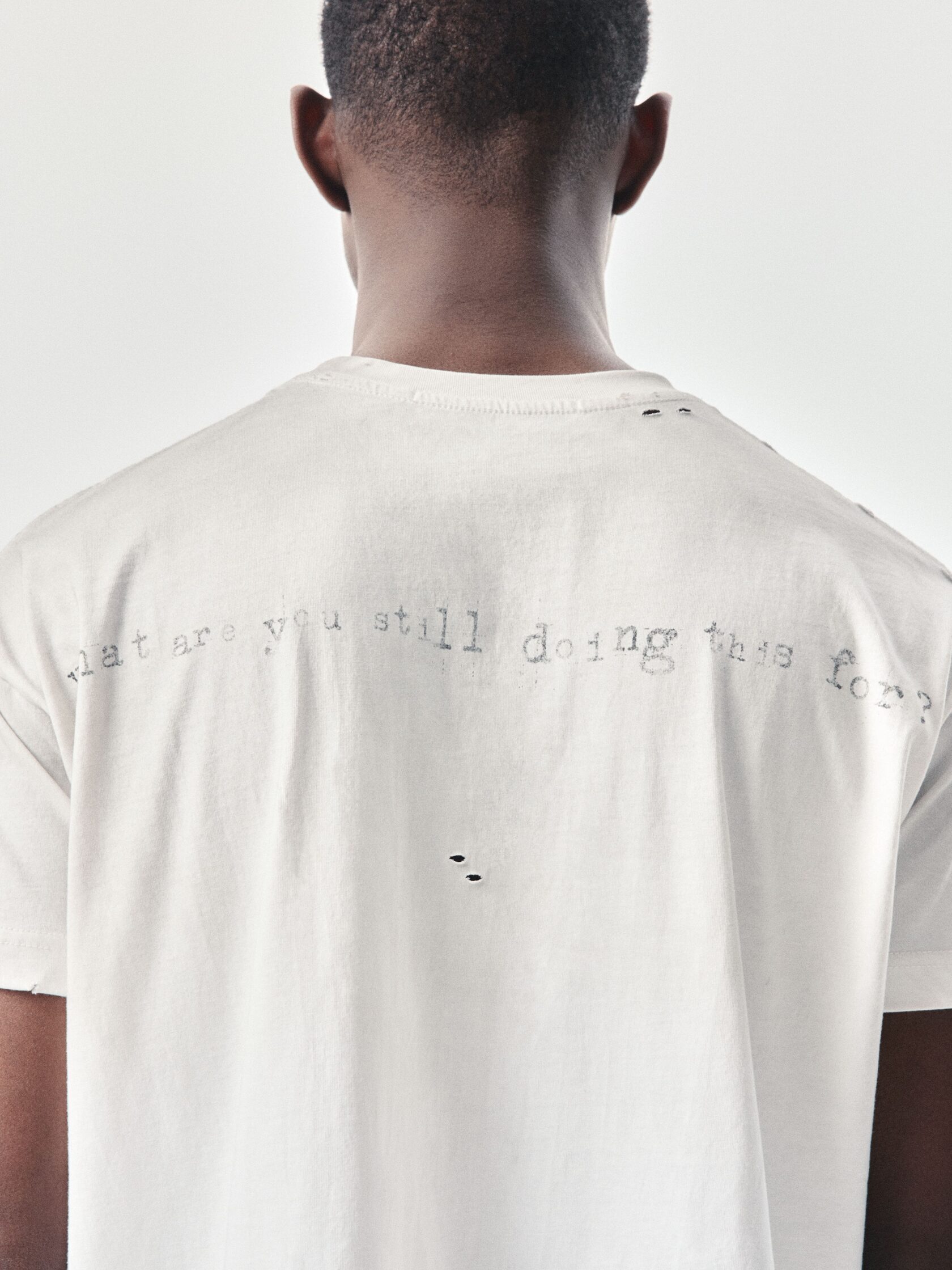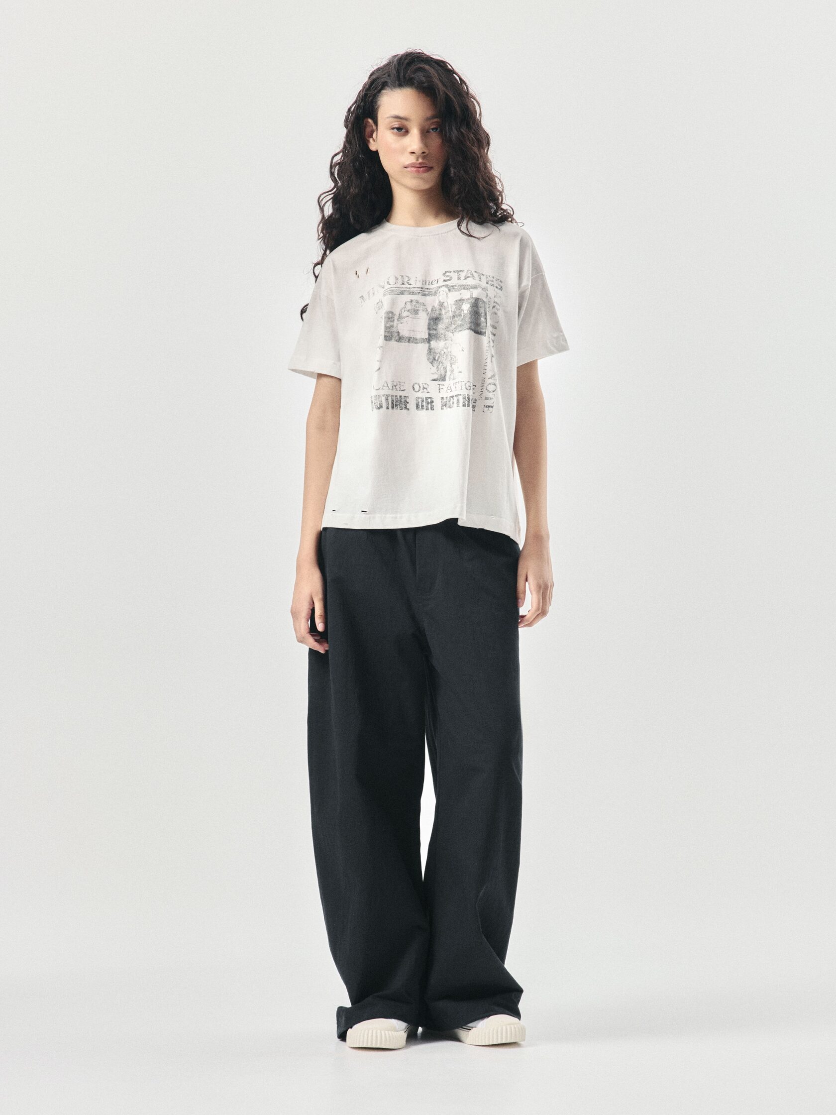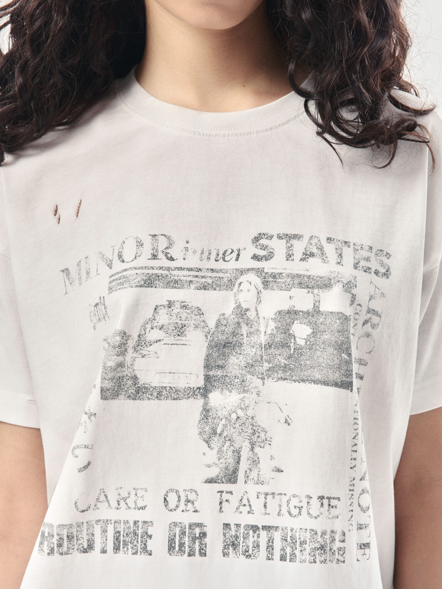 Футболка классического кроя из 100% хлопка плотностью 180 г/м². Дизайн модели создан вручную: уникальный принт нанесен методом ручной печати, а декоративные разрывы добавляют индивидуальный характер. Финальная обработка придает хлопку приятную мягкость и винтажный оттенок, который естественно сочетается с элементами состаривания. Универсальный крой позволяет сочетать футболку с джинсами, худи или курткой из коллекции.