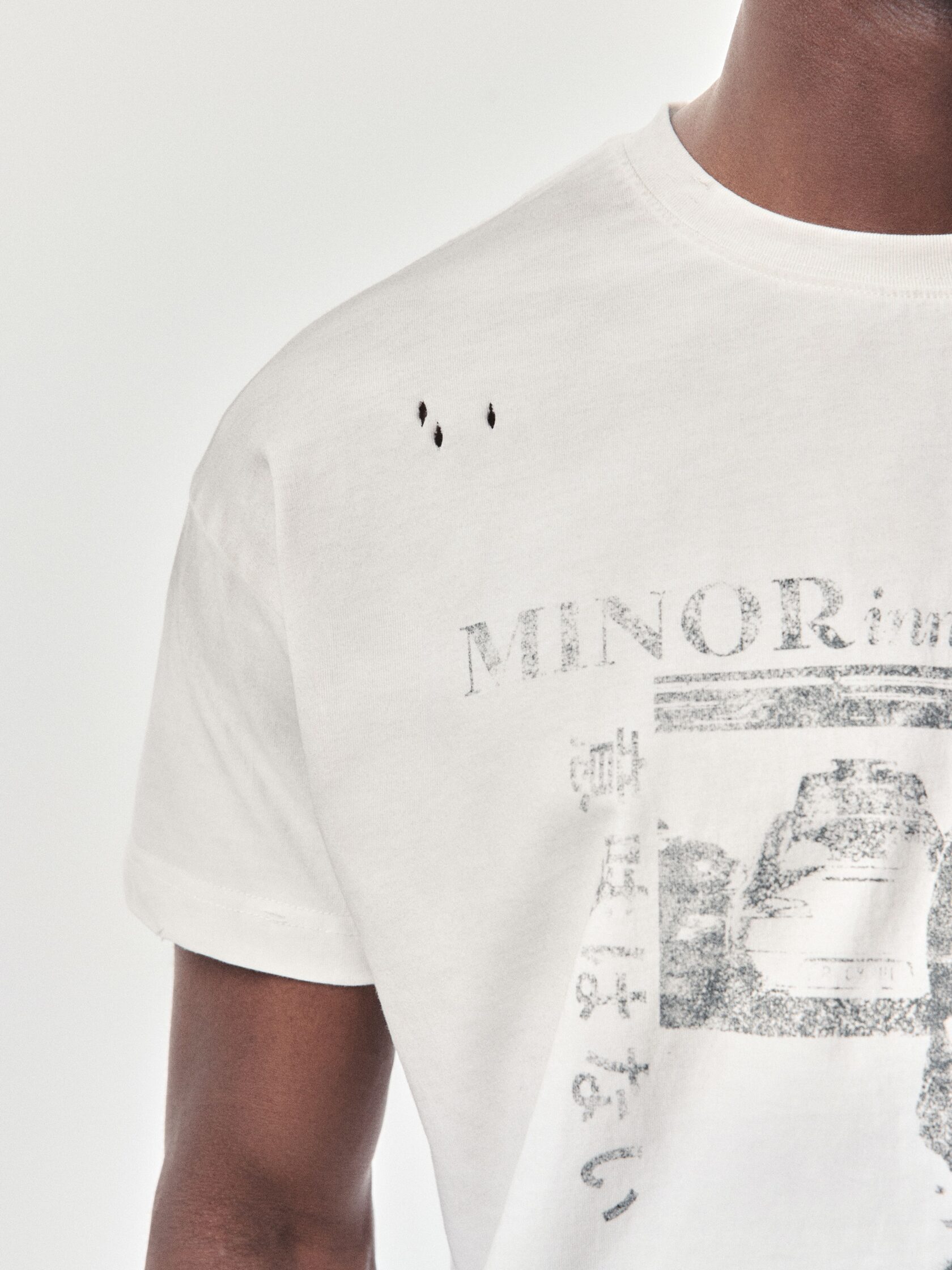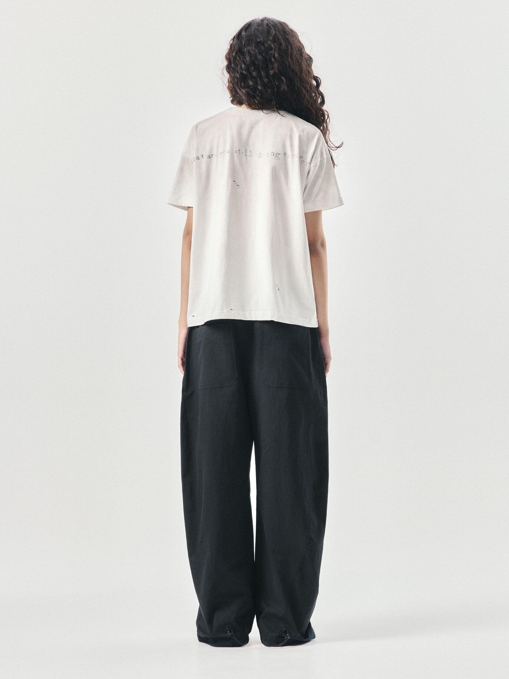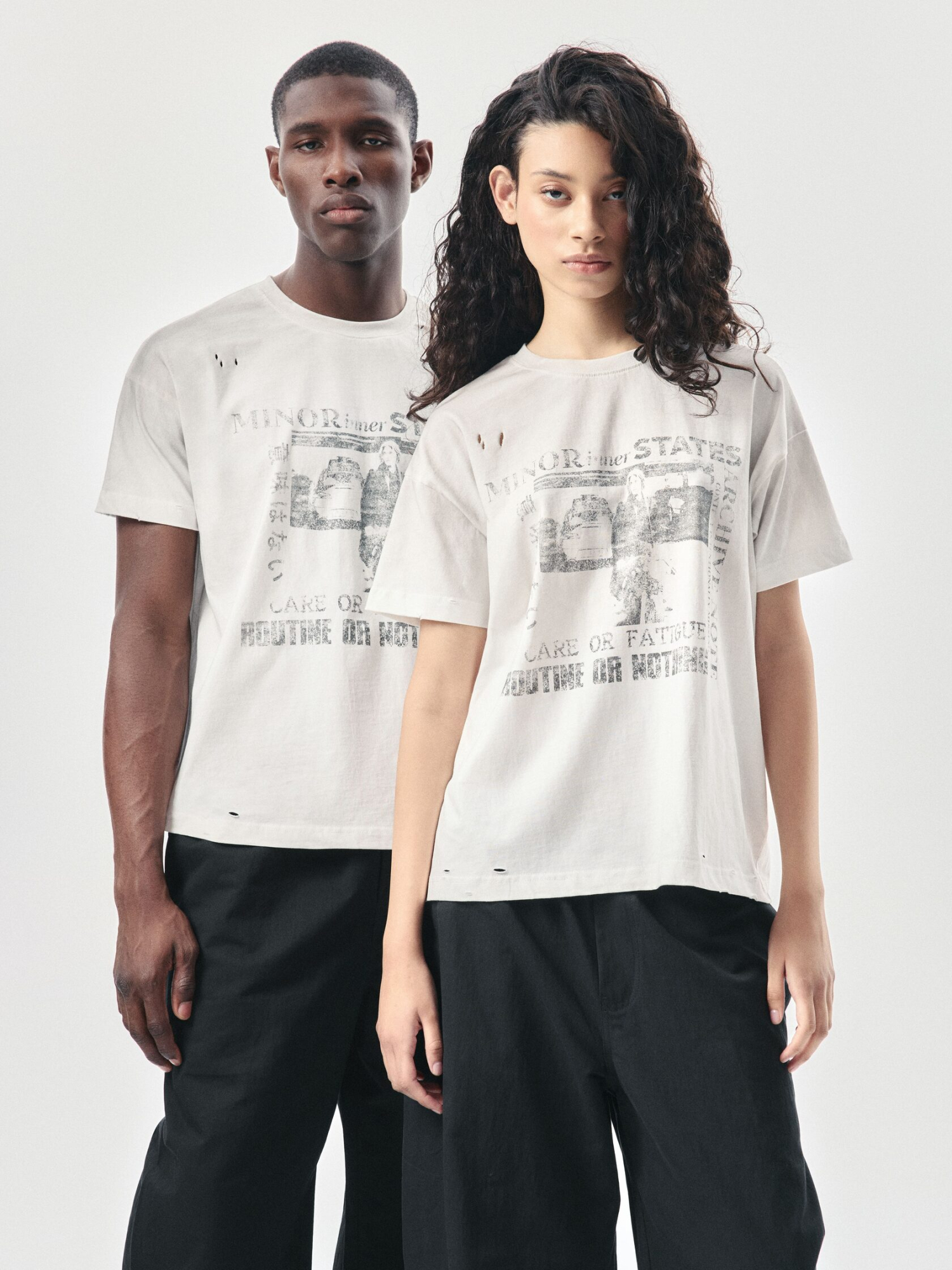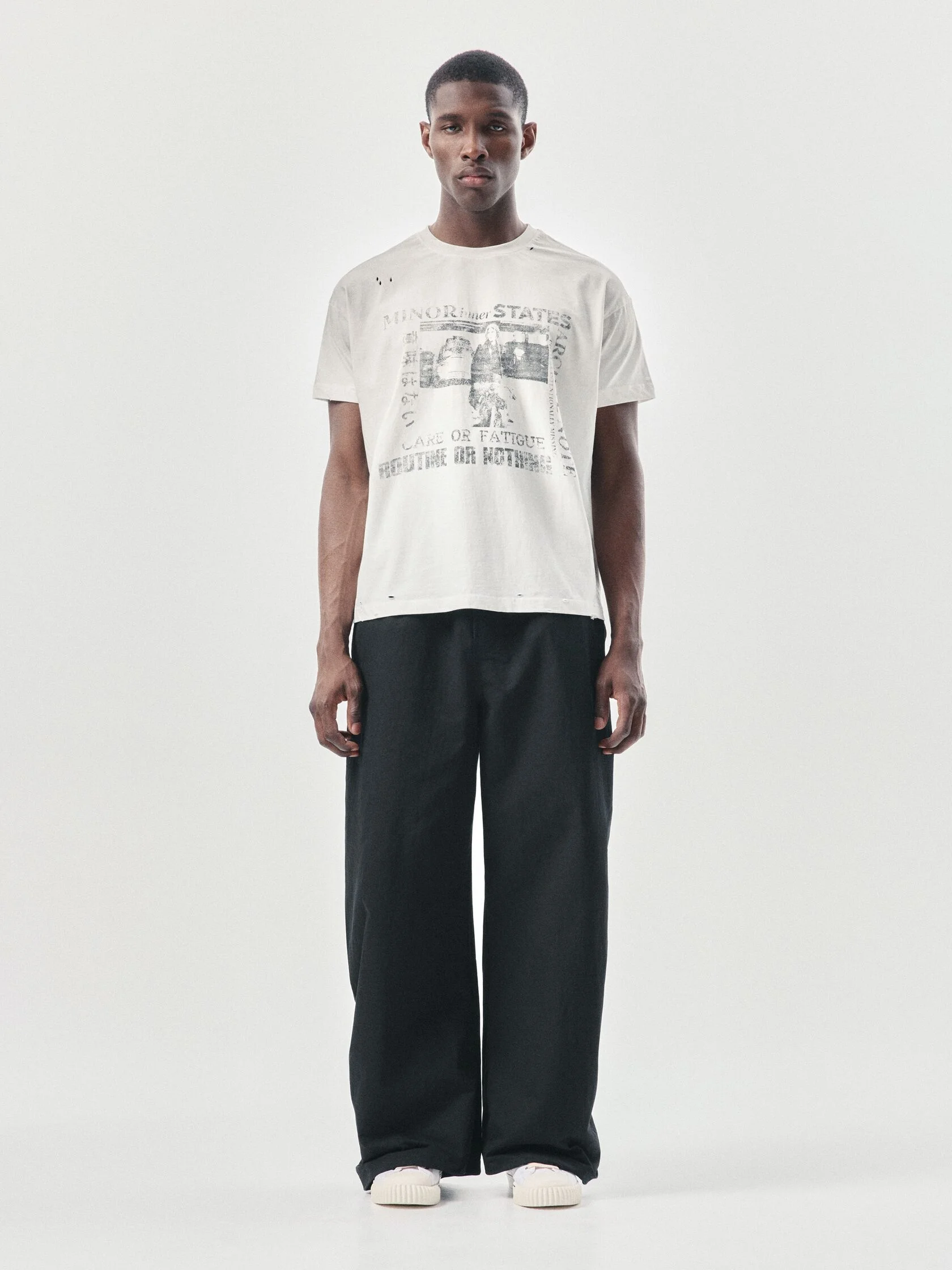 Футболка классического кроя из 100% хлопка плотностью 180 г/м². Дизайн модели создан вручную: уникальный принт нанесен методом ручной печати, а декоративные разрывы добавляют индивидуальный характер. Финальная обработка придает хлопку приятную мягкость и винтажный оттенок, который естественно сочетается с элементами состаривания. Универсальный крой позволяет сочетать футболку с джинсами, худи или курткой из коллекции.