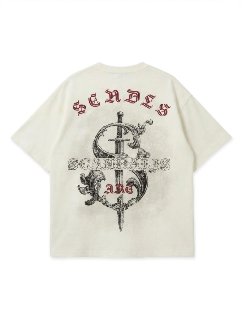 На спине расположена масштабная многослойная шелкография, вдохновленная тату эстетикой. Фоновое напыление серого цвета вокруг принта создает эффект «дымки» и придает рисунку объем и глубину. Акцентная вышивка слова SCANDALIS дополняет композицию дизайна.