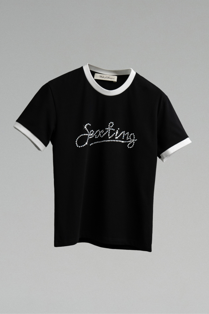 Футболка свободного кроя, с круглым вырезом контрастного цвета. Изготовлена из хлопка и украшена надписью, выполненной из страз.