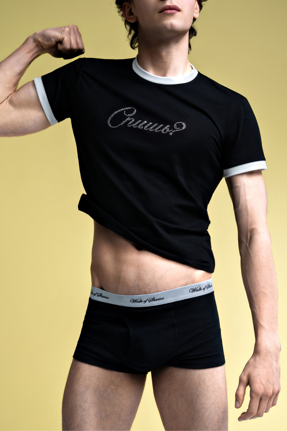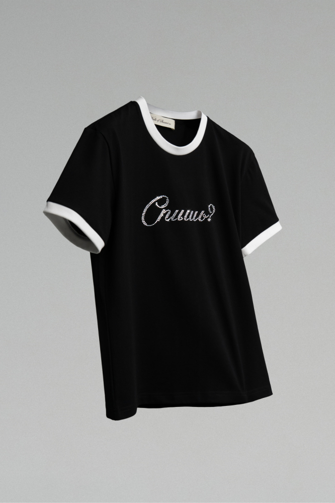 Футболка свободного кроя, с круглым вырезом контрастного цвета. Изготовлена из хлопка и украшена надписью, выполненной из страз.