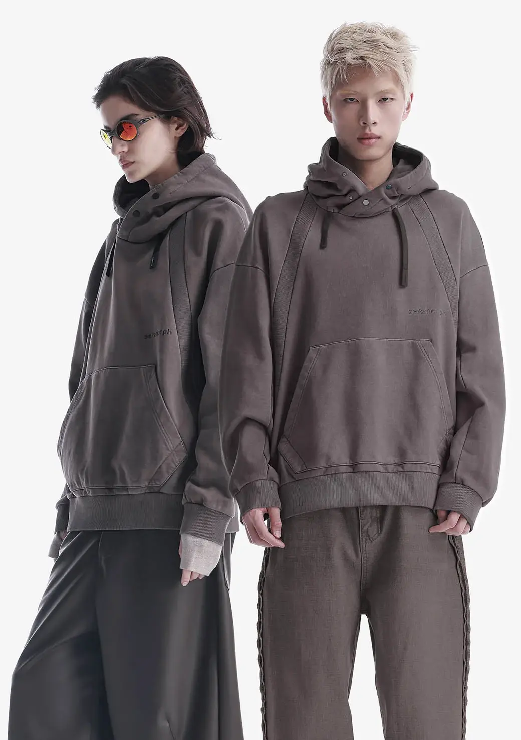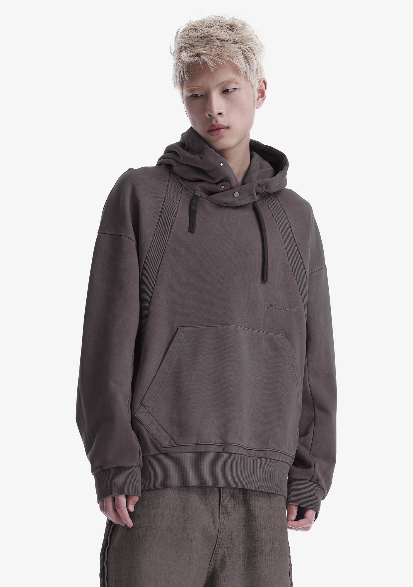 - Двуслойный капюшон с высоким воротником, затяжником и застёжкой на кнопках