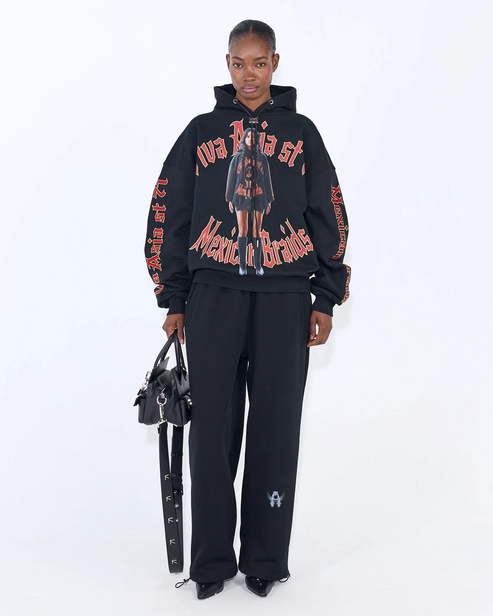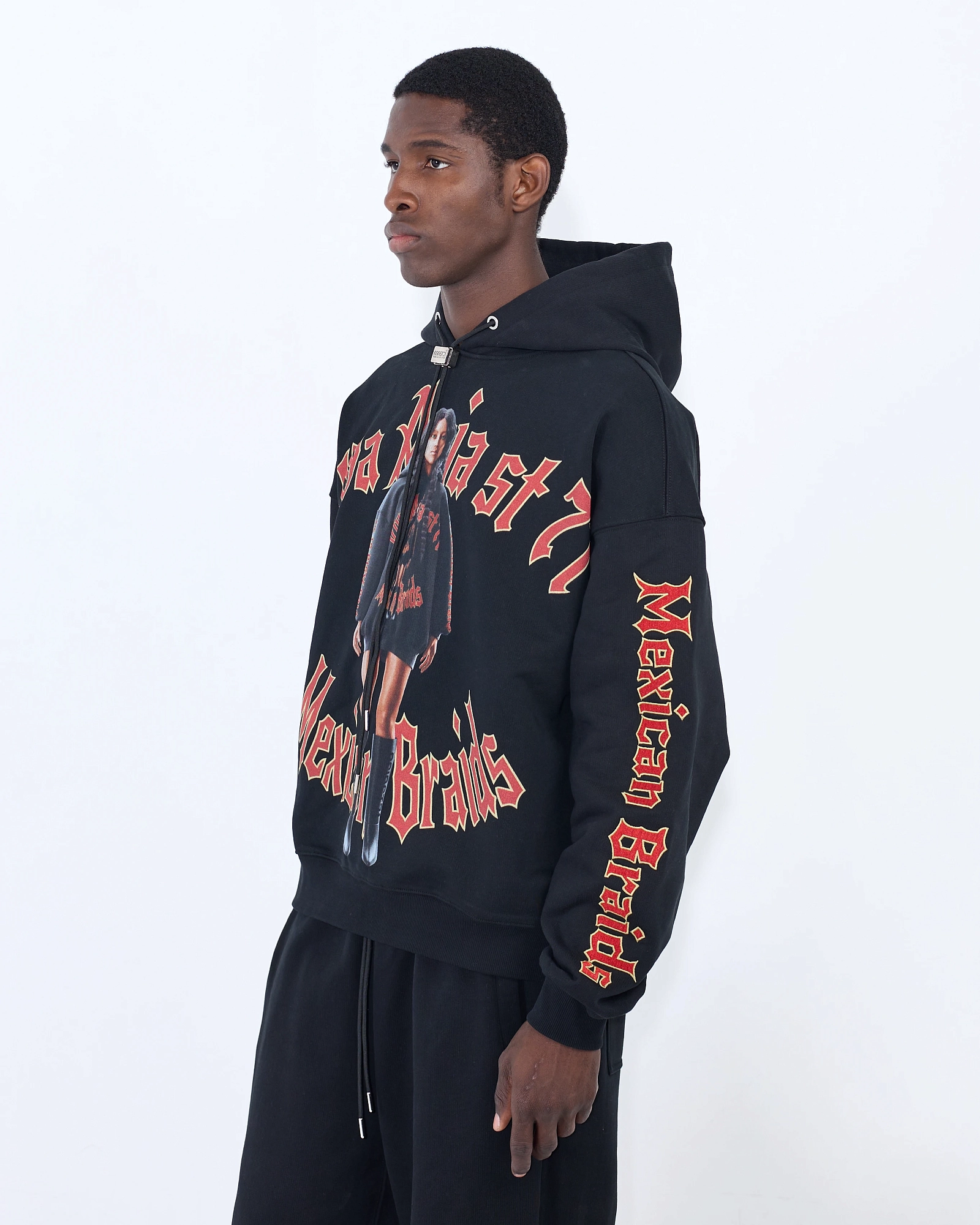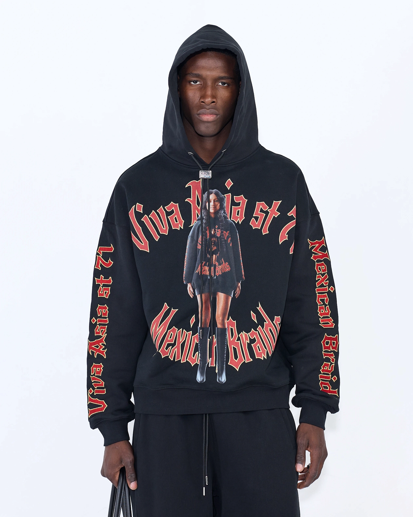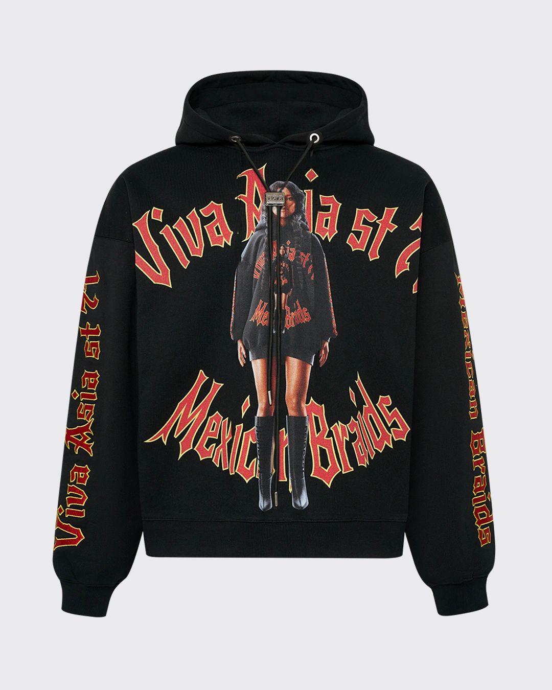 Худи MEXICAN BRAIDS — это визуальное заявление о культурной самоидентичности. Модель выполнена в свободном оверсайз-крое из плотного хлопка и дополнена графичным принтом с брендированной символикой. Центральный элемент — изображение девушки и готические надписи, создающие смелое визуальное высказывание. Идеальный выбор для повседневных образов в духе современного streetwear.