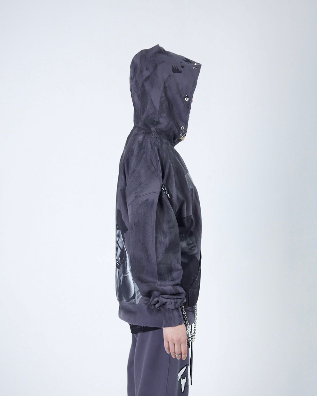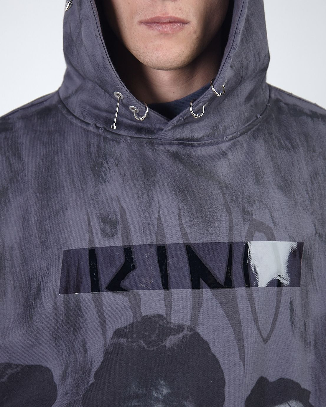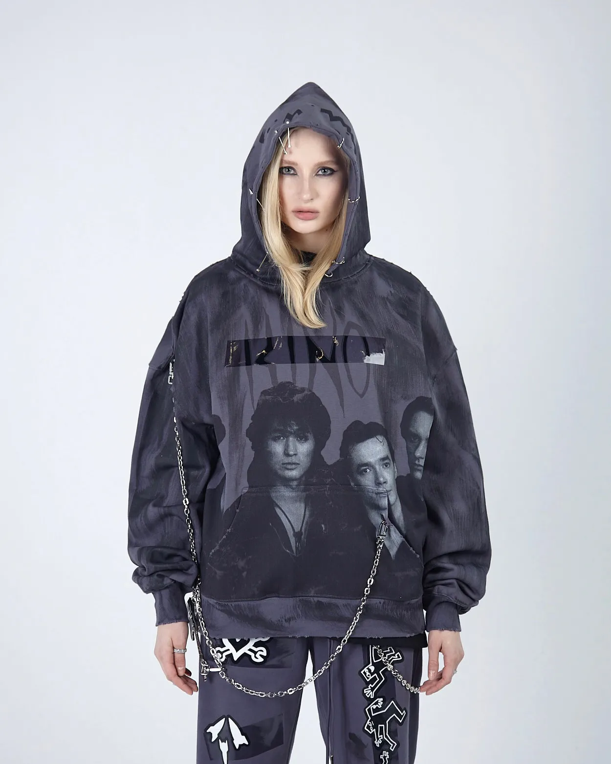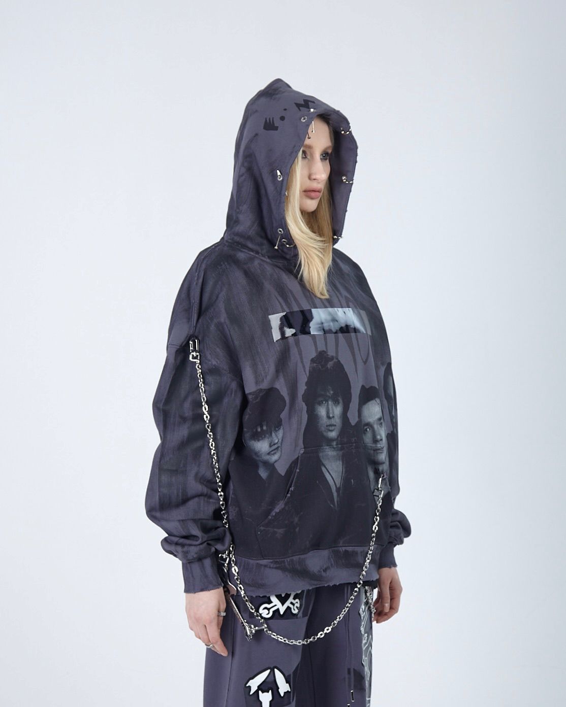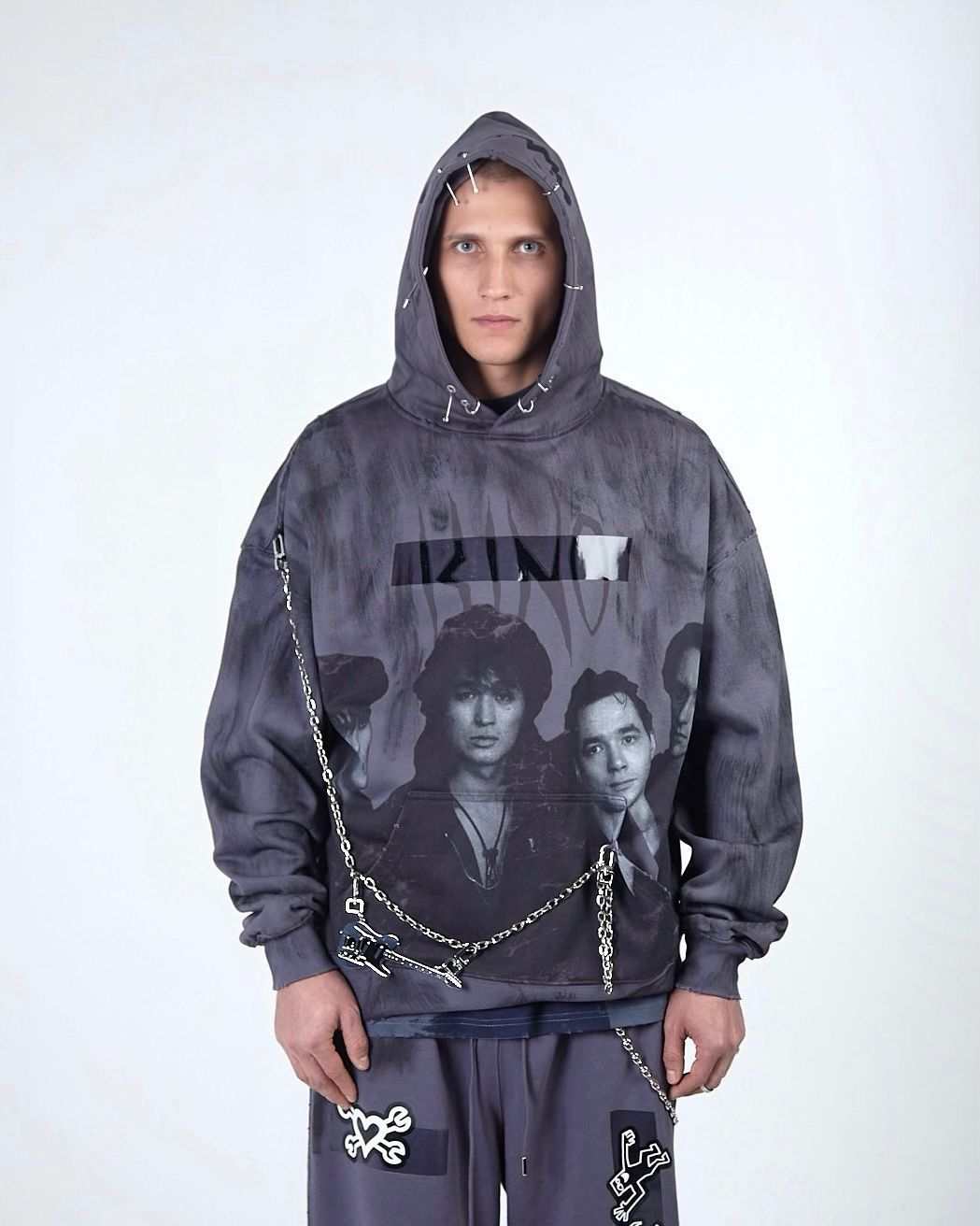 Коллекция KINO x Asia St 71 – это воплощение стиля и бунтарского духа 80-х годов. Худи выполнено из высококачественного плотного хлопка, оно отличается свободным объёмным кроем, который обеспечивает комфортную посадку и свободу движений. Вымытый эффект, необработанные швы, потертости и рваные края придают худи неповторимый гранжевый вид, а металлический пирсинг на элементах одежды подчеркивает его индивидуальность и смелость, а имиджевая цепь добавляет целостность образу Темные принты выполнены шелкографией и термотрансферным нанесением. Изделие станет акцентом вашего гардероба и позволит выразить свою уникальность.
