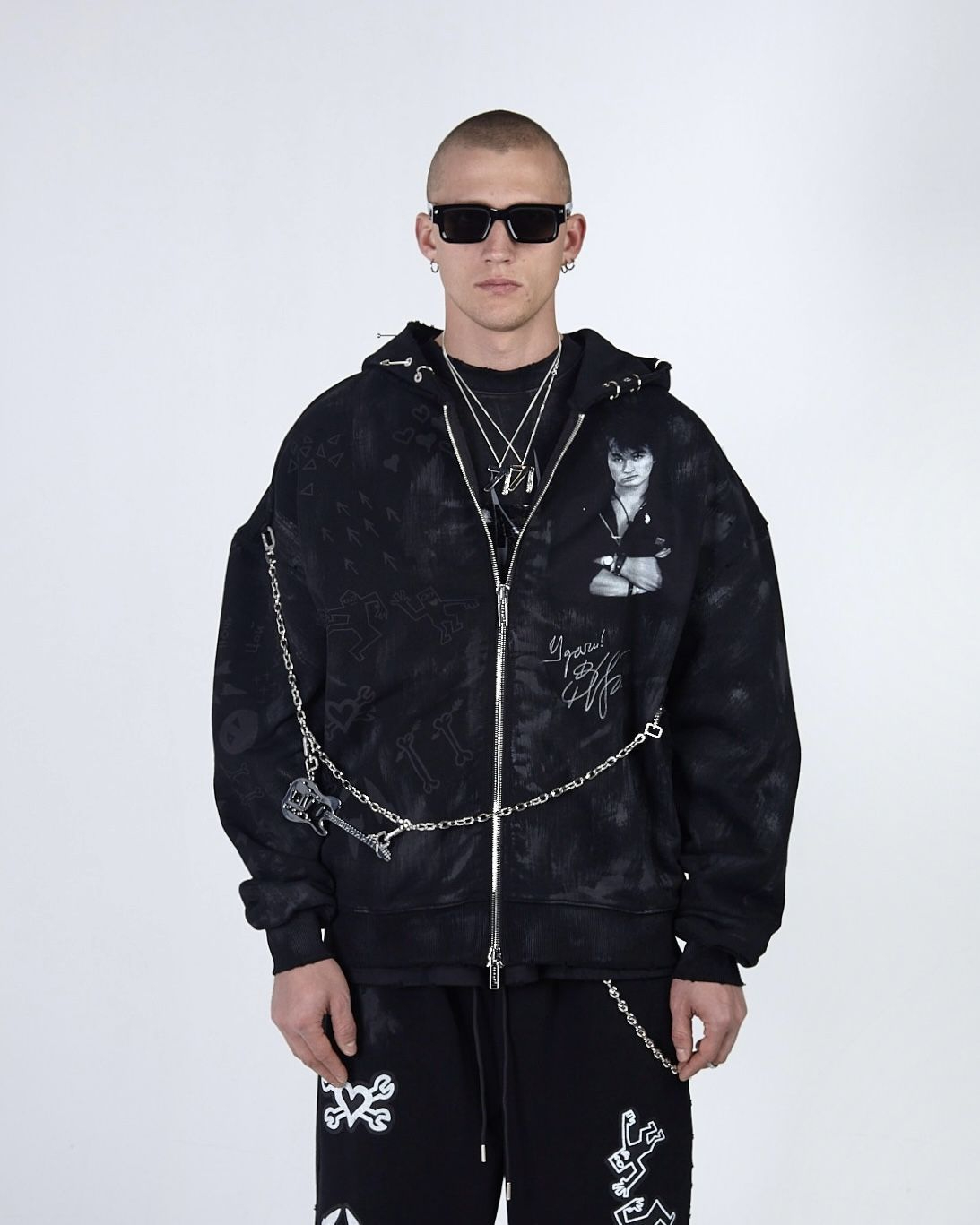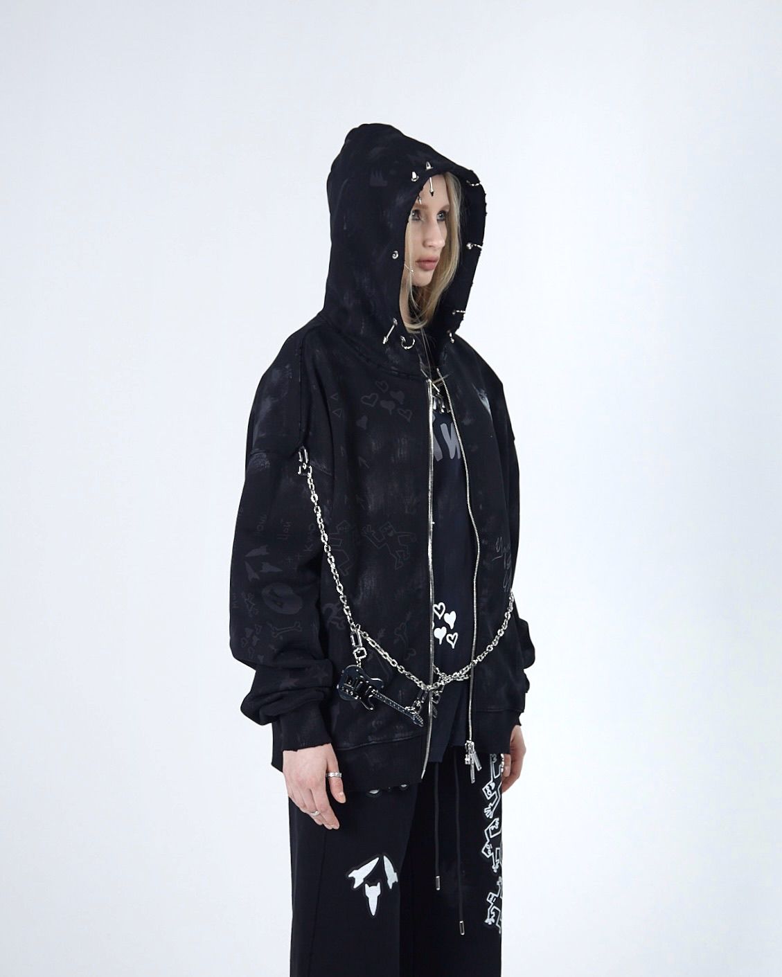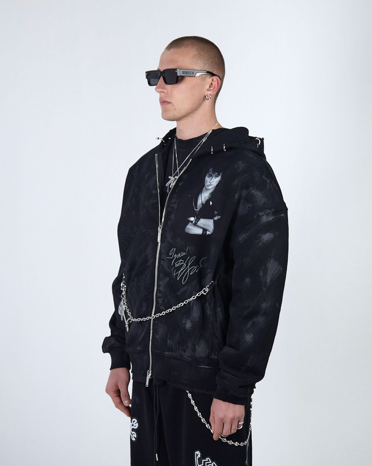 Худи выполнено из высококачественного плотного хлопка, оно отличается свободным объёмным кроем, который обеспечивает комфортную посадку и свободу движений. Вымытый эффект, необработанные швы, потертости и рваные края придают худи неповторимый гранжевый вид, а металлический пирсинг на элементах одежды подчеркивает его индивидуальность и смелость, а имиджевая цепь добавляет целостность образу