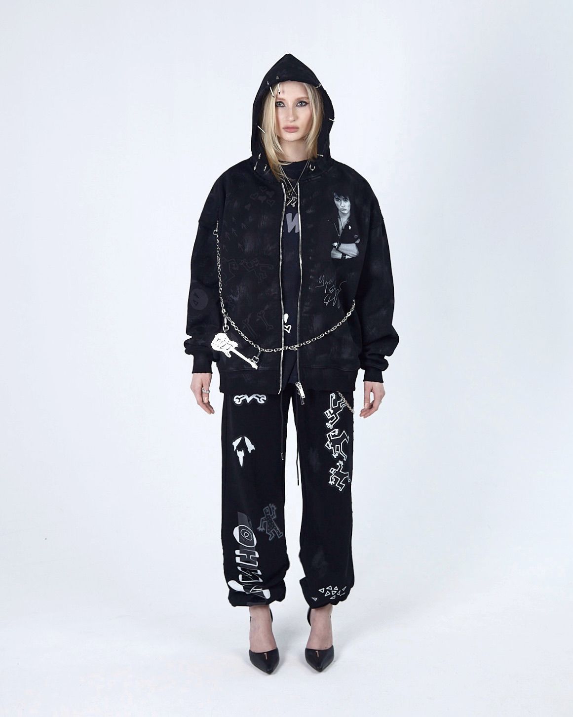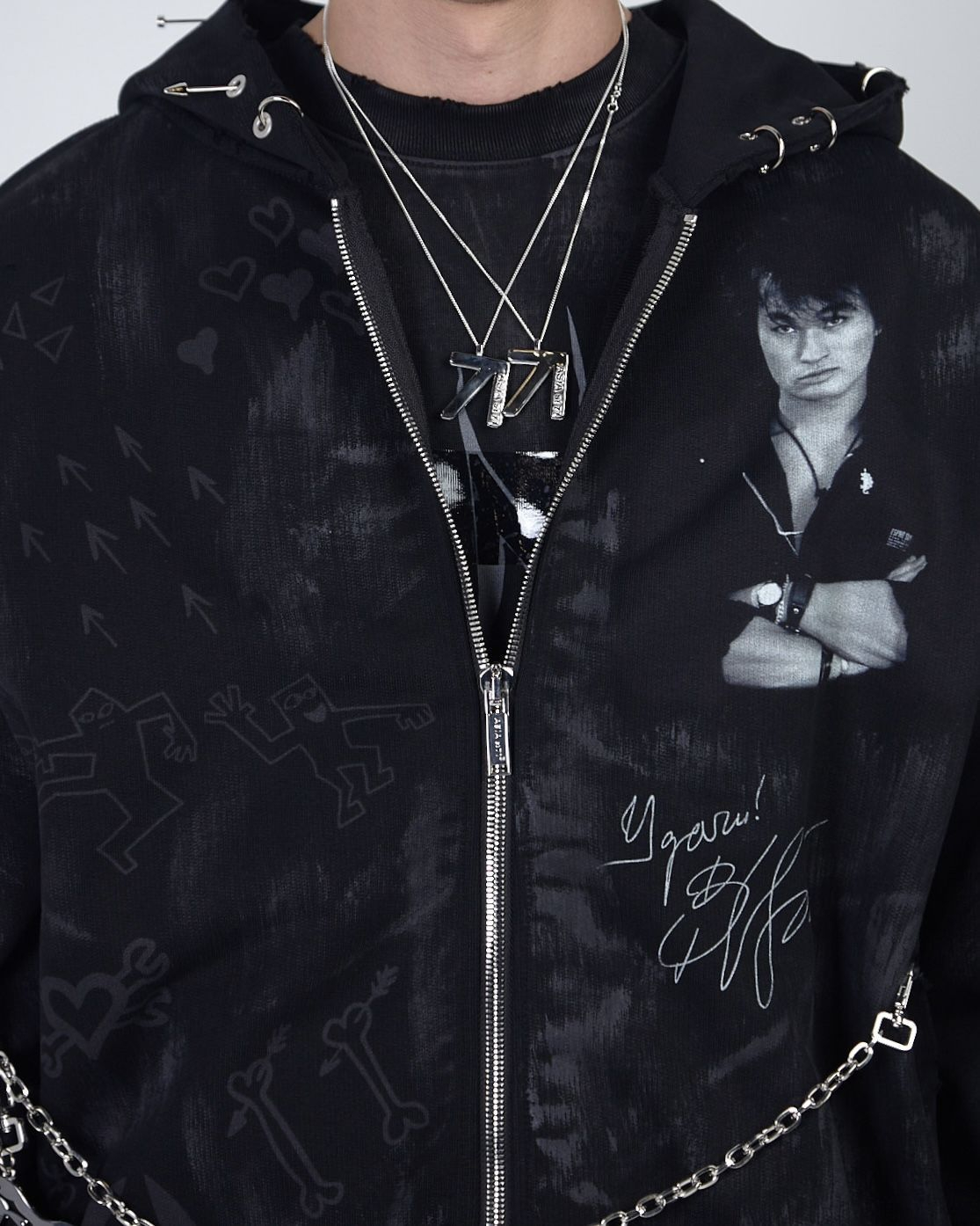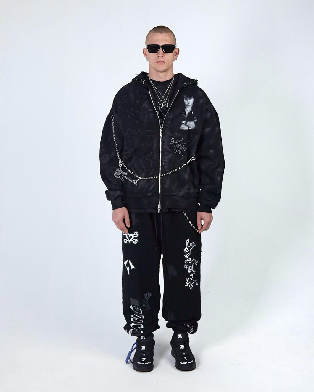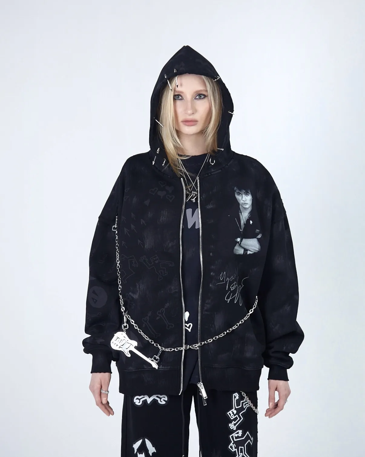 Худи выполнено из высококачественного плотного хлопка, оно отличается свободным объёмным кроем, который обеспечивает комфортную посадку и свободу движений. Вымытый эффект, необработанные швы, потертости и рваные края придают худи неповторимый гранжевый вид, а металлический пирсинг на элементах одежды подчеркивает его индивидуальность и смелость, а имиджевая цепь добавляет целостность образу