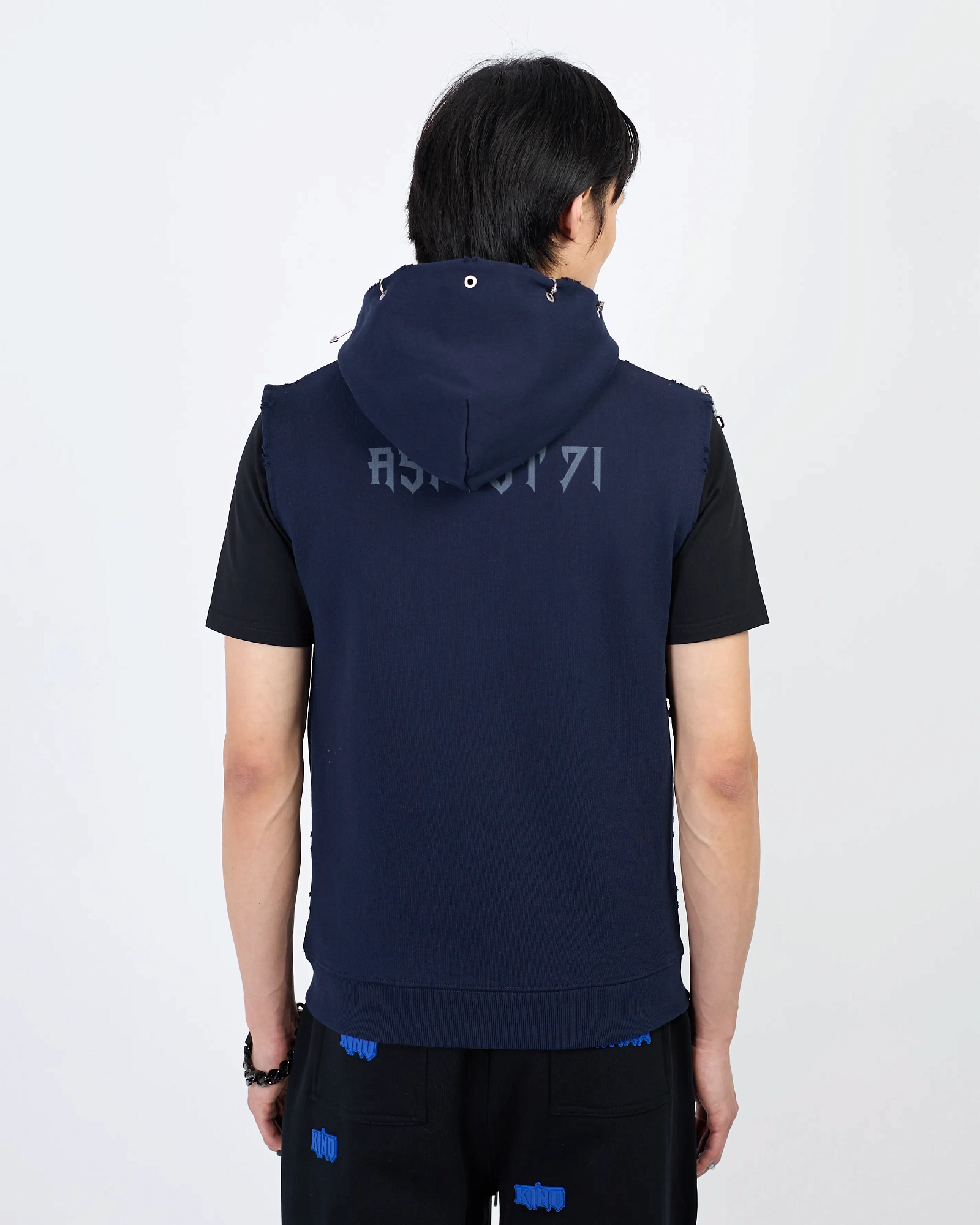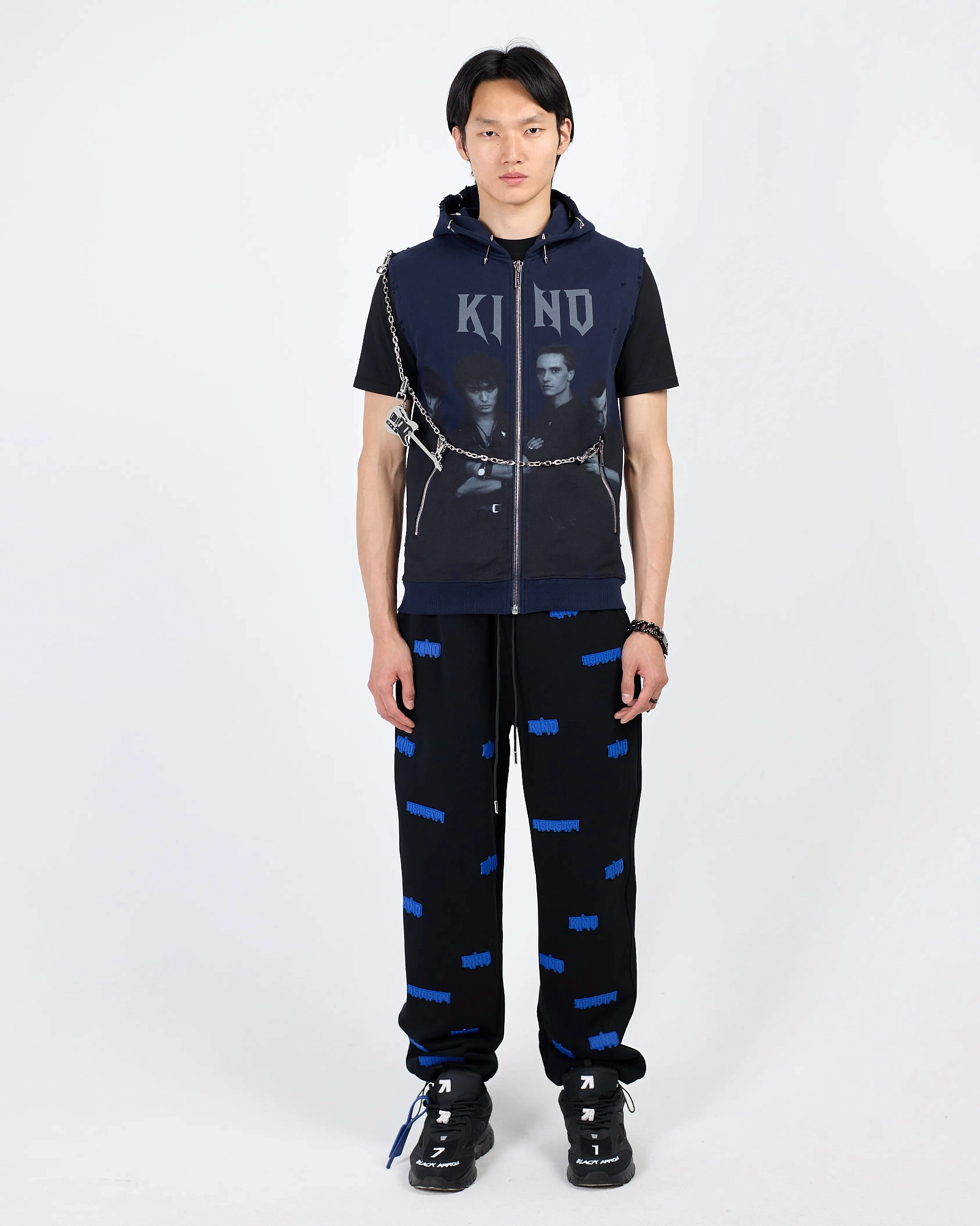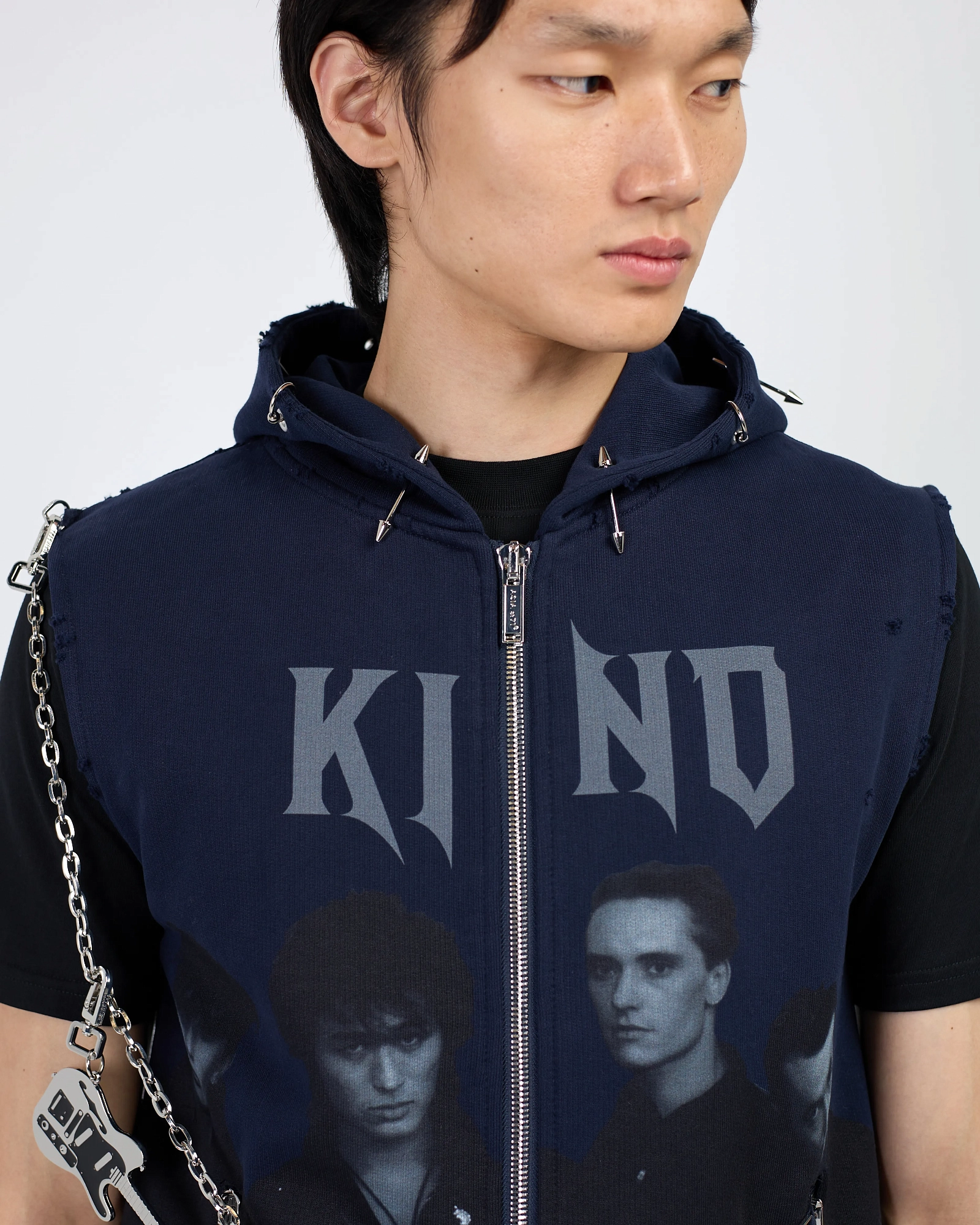 Акцентная безрукавка в рокерском стиле с принтом группы Kino, стальной цепочкой с гитарой на карабине и вставками-пирсингами в виде колец и шипов по краю капюшона, с эффектом рваного края. Стальная и брендированная фурнитура, карманы на молнии, манжет по нижнему краю, материал - плотный хлопок. Данная безрукавка сделает ваш образ запоминающимся и завершенным. Рекомендуем носить поверх футболки или лонгслива с любимым низом в виде брюк или джинс.