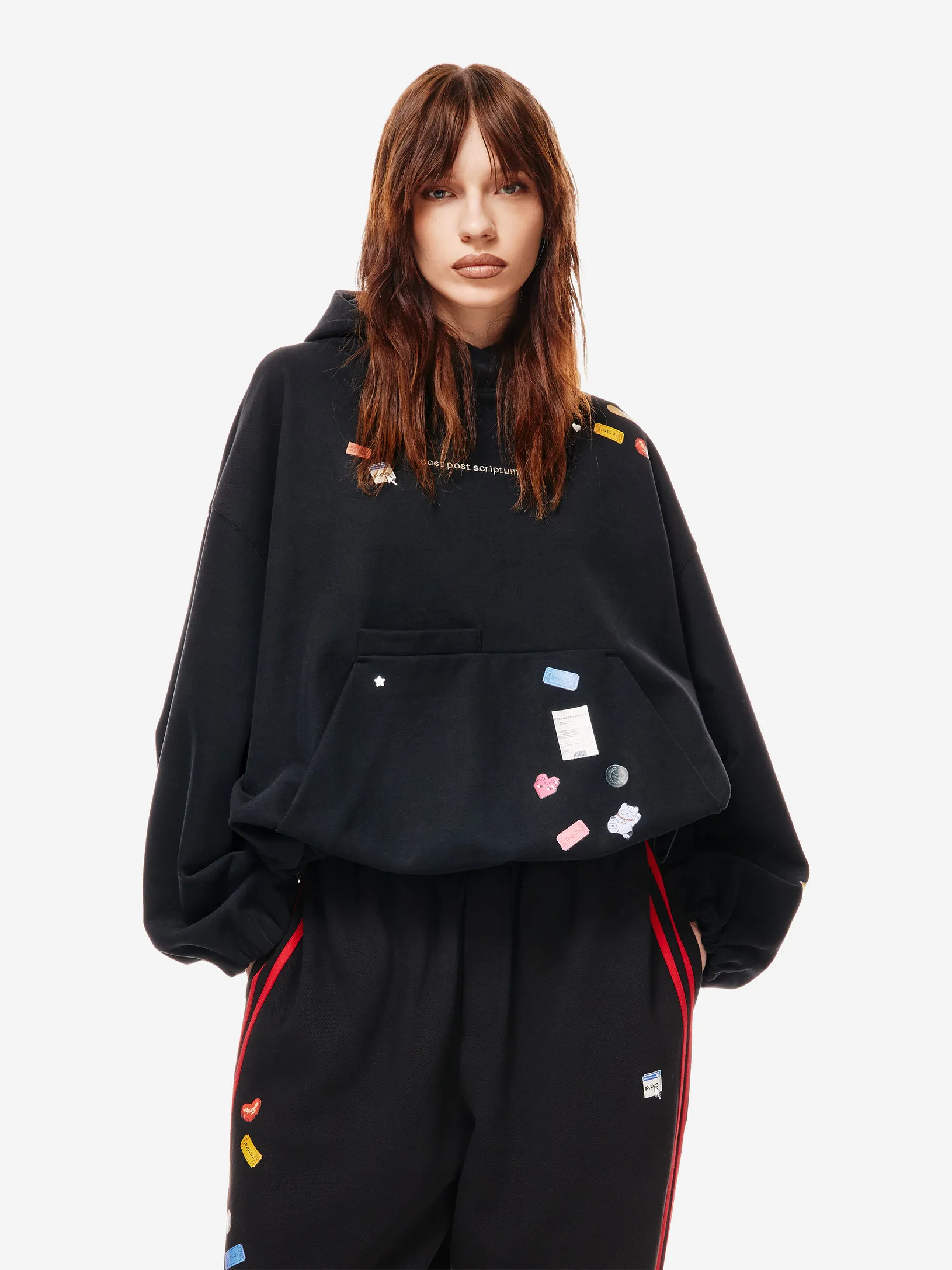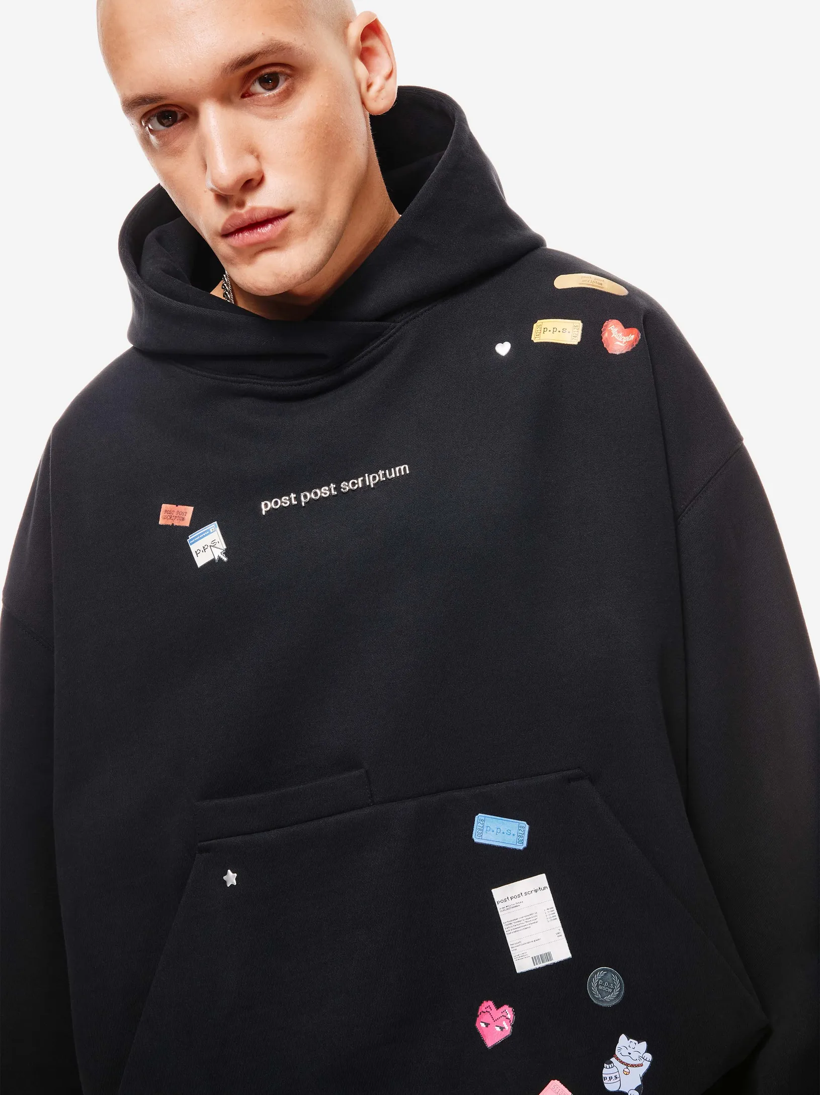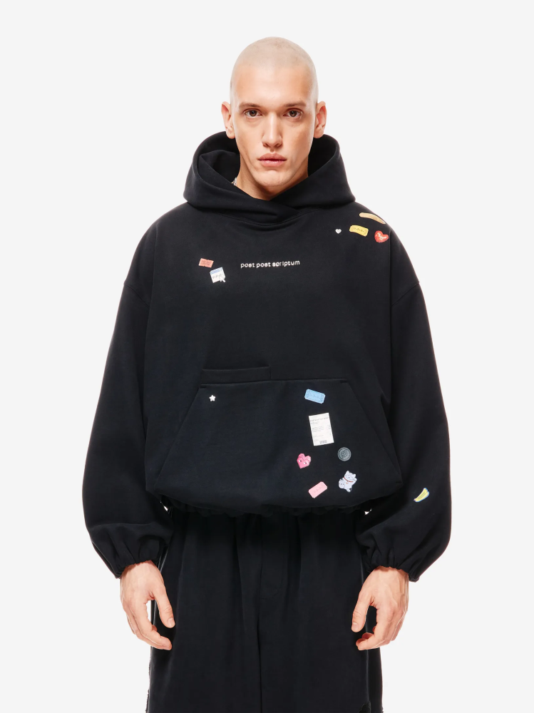Худи выполнен из 100% хлопкового трикотажа плотностью 470 г со специальной винтажной стиркой, которая придает ткани глубину цвета и мягкость. Фирменный крой бренда подчеркивается объемным силуэтом, спущенными плечами, перекрывающимся вырезом плавно переходящим в массивный капюшон. Вышитый красный логотип “post post scriptum” спереди добавляет контрастный акцент. Просторный передний карман, эластичные манжеты и собранный на резинку подол обеспечивают комфортную посадку и стильный баланс между расслабленным и продуманным дизайном.