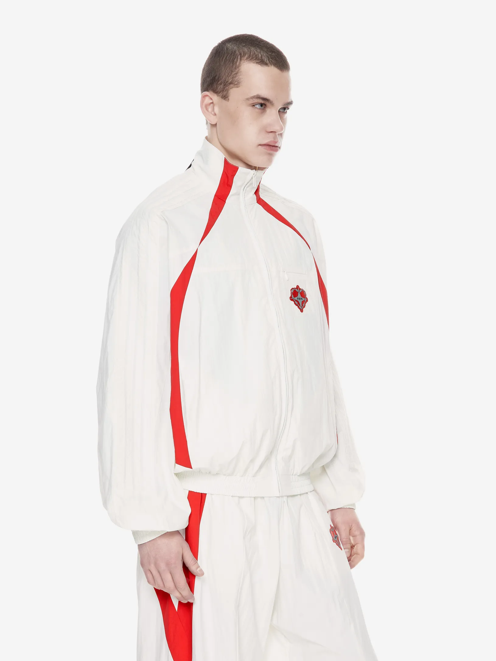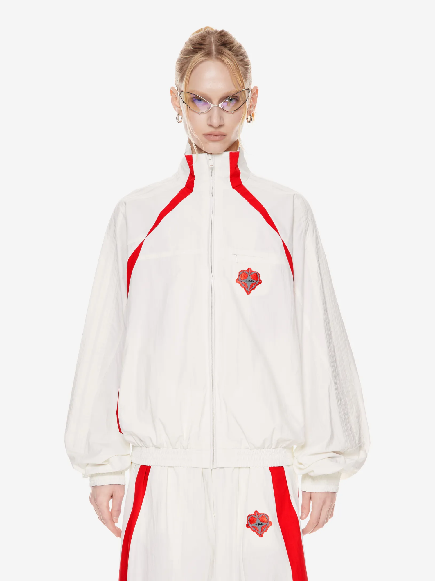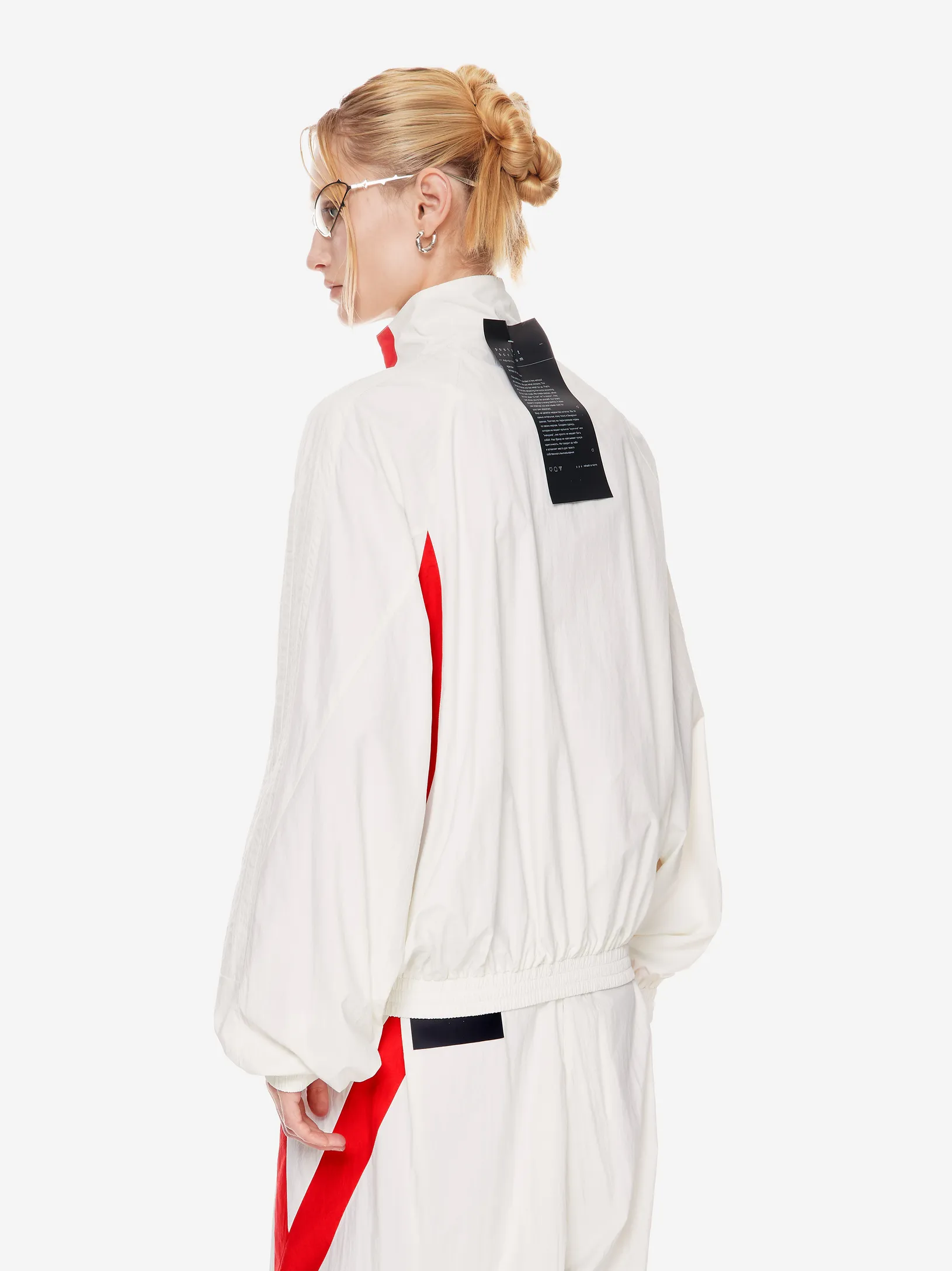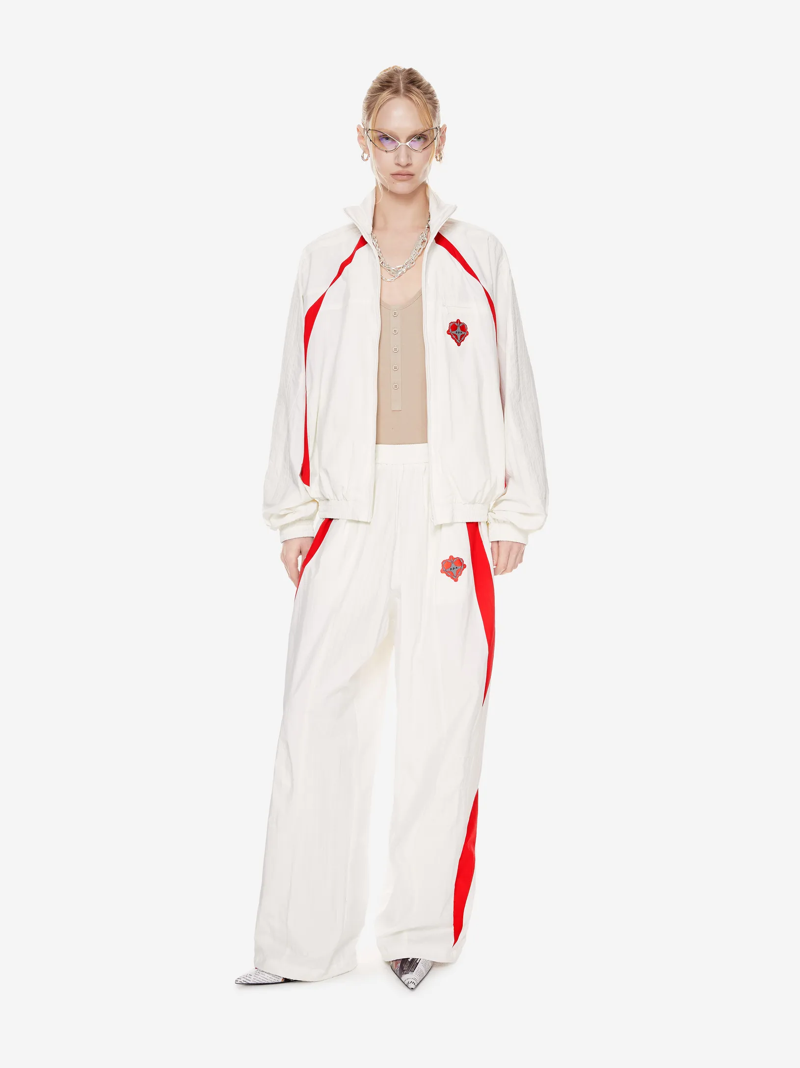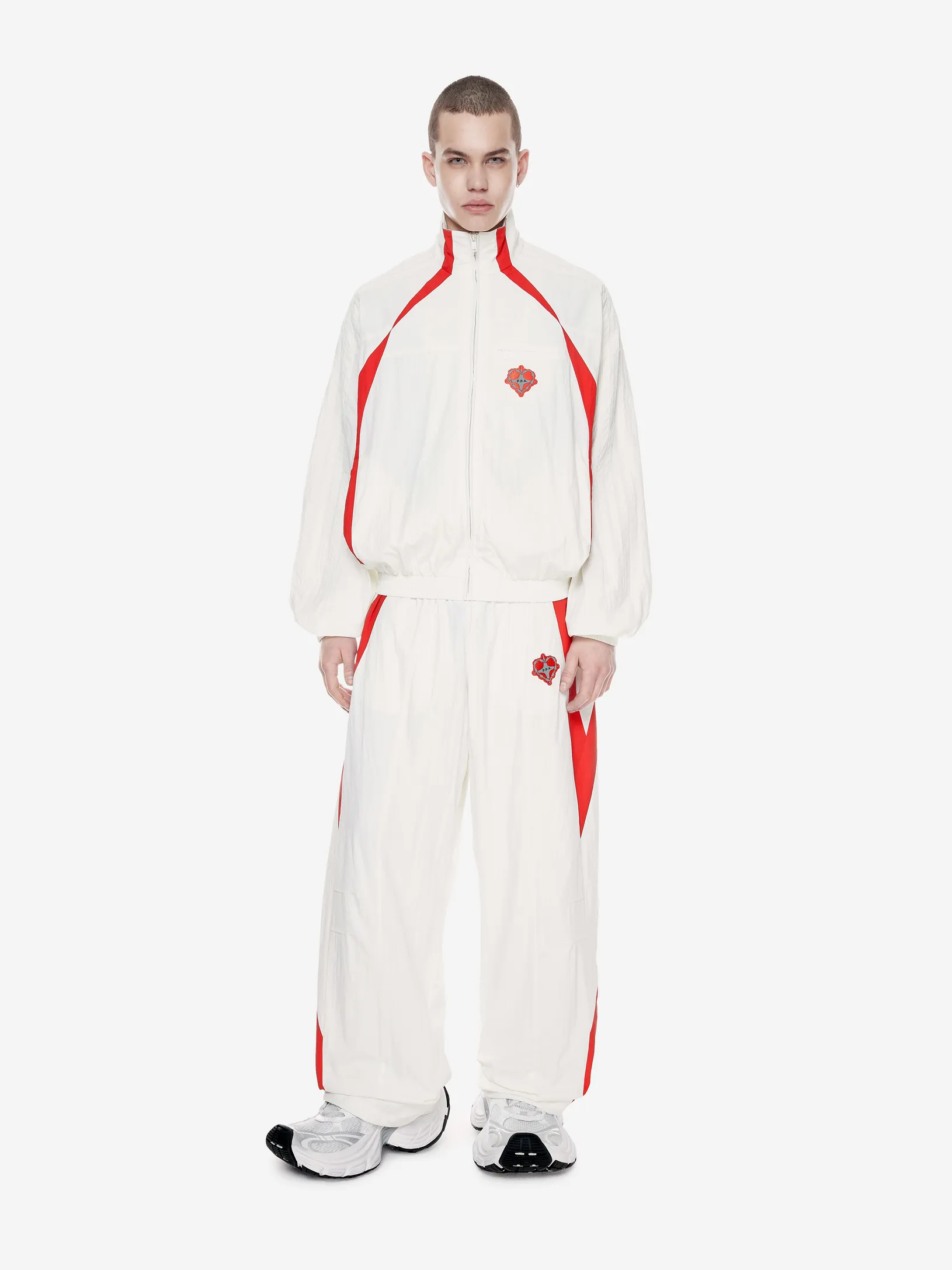Переосмысление архивного спортивного силуэта в эстетике 2000-х. Контрастные вставки и лампасы формируют динамичный образ на стыке спорта, урбанистики и индивидуального стиля.