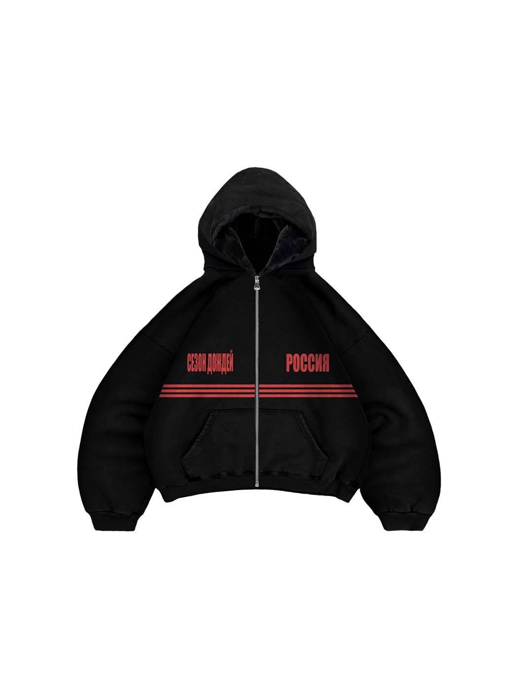 Хлопковое двустороннее черное худи на молнии свободного кроя. Вторая сторона выполнена из премиального искусственного меха с коротким ворсом. Украшено контрастными принтами красного цвета. Носите с другими вещами из коллаборации с Три Дня Дождя.