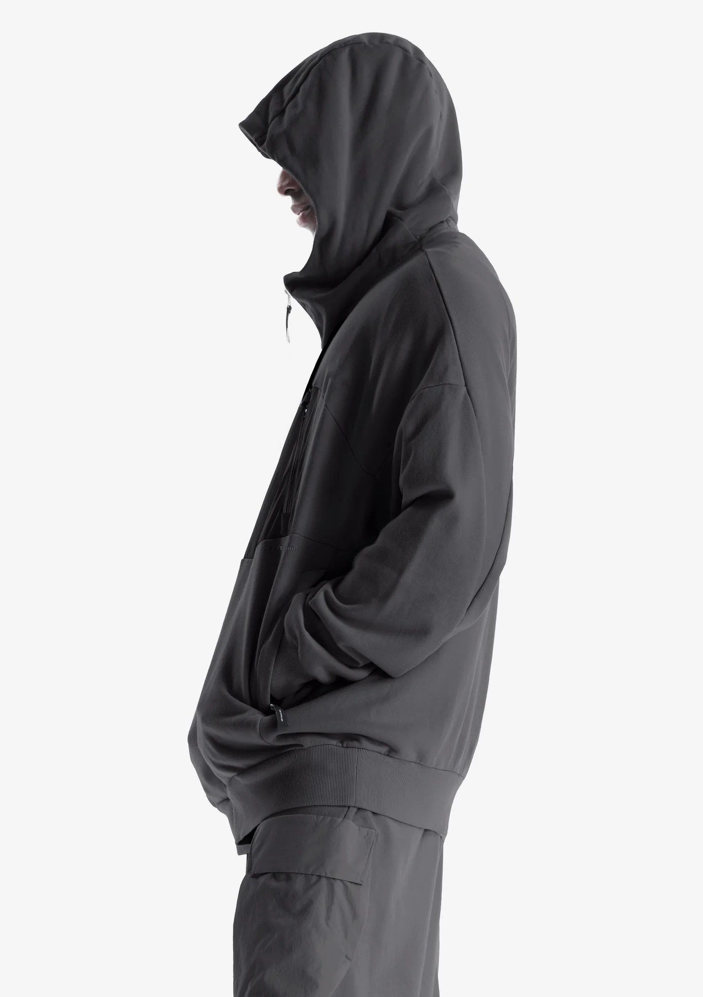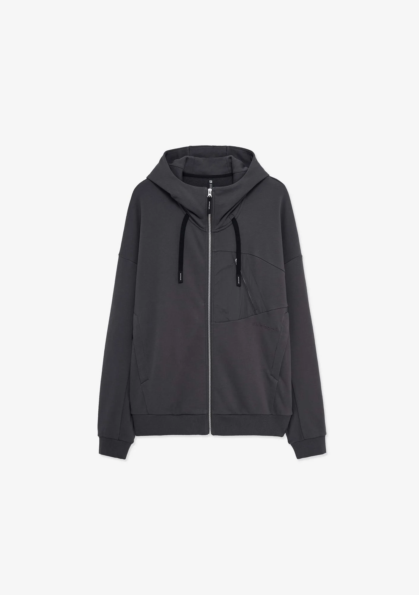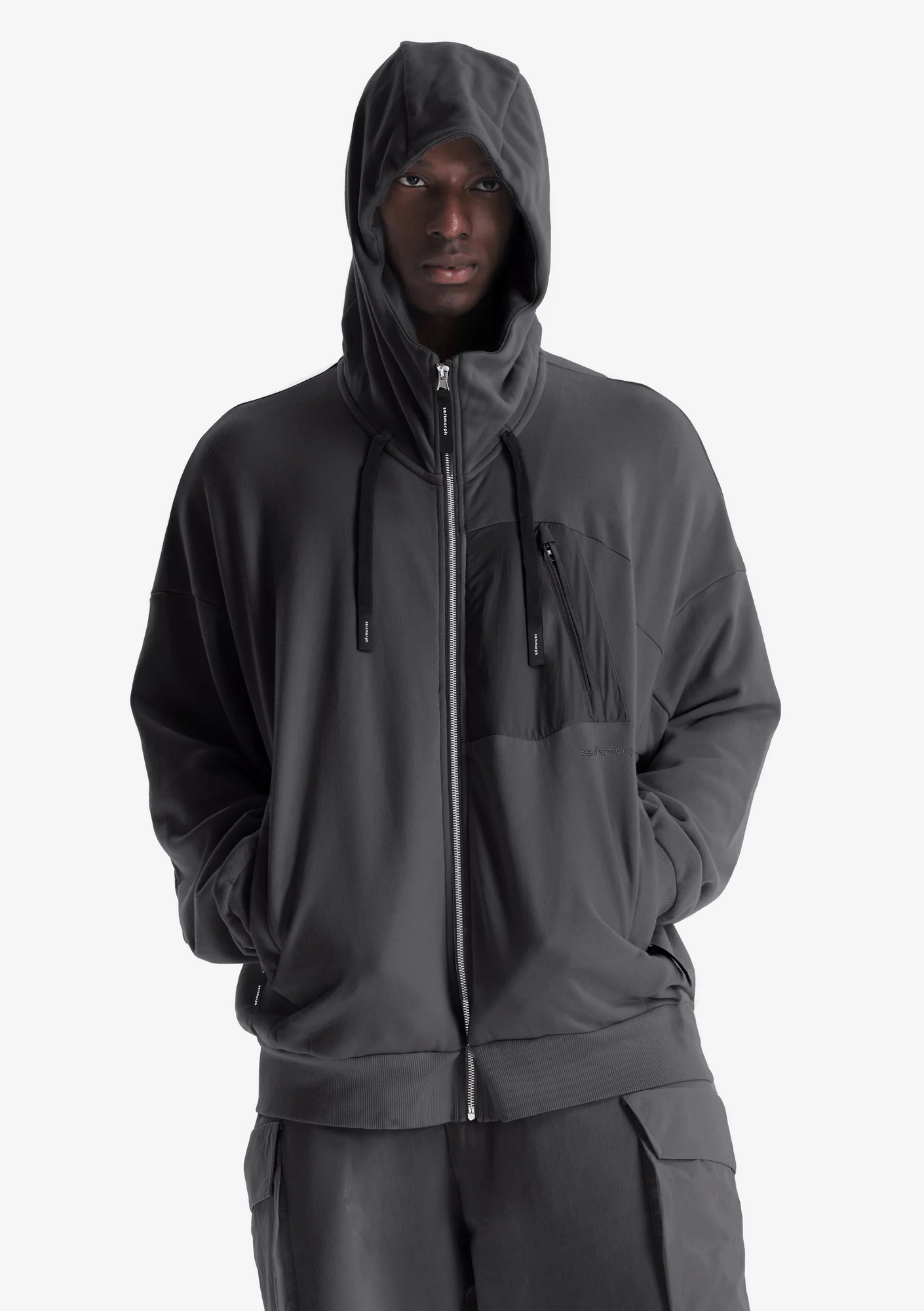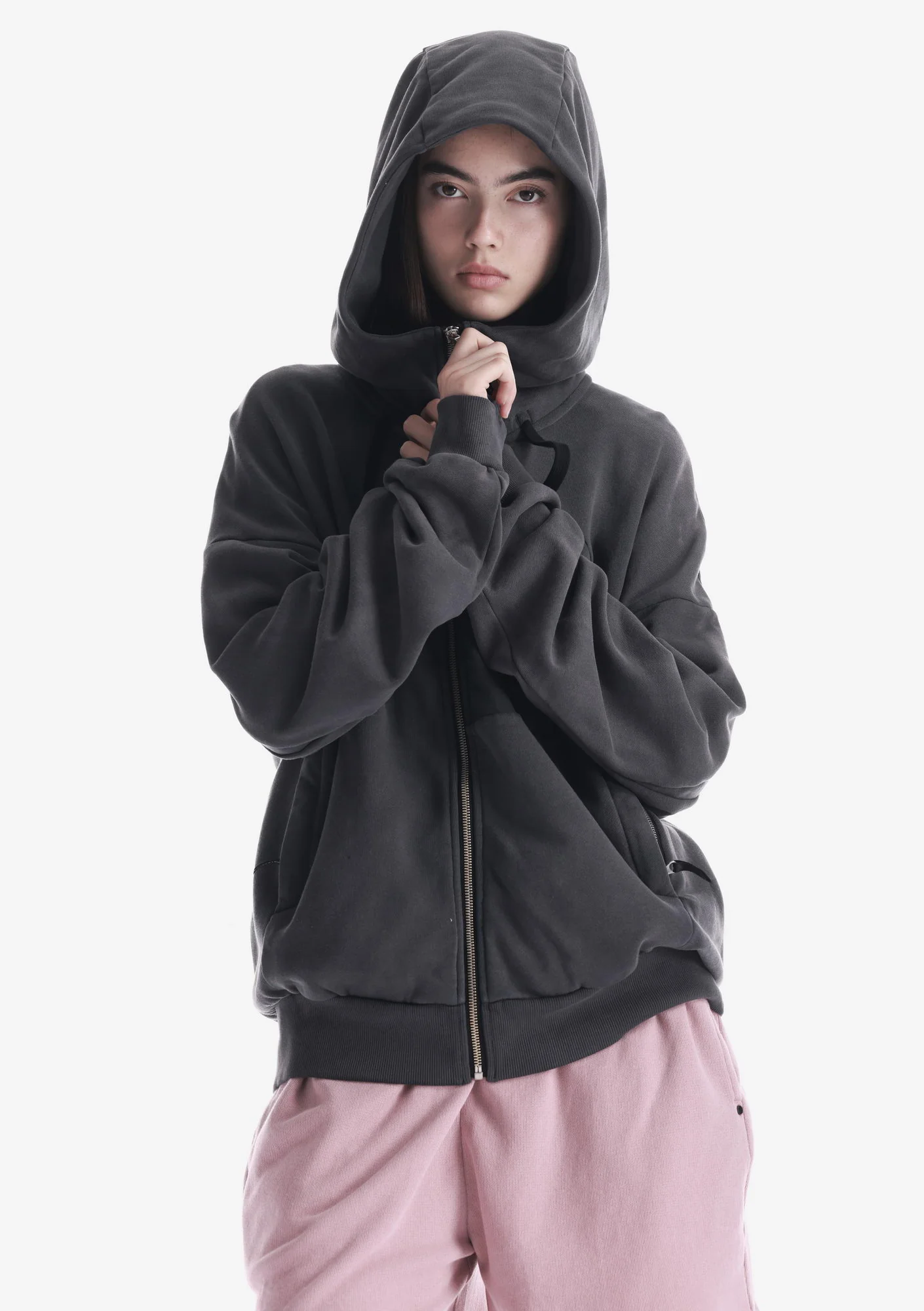 Худи на молнии из плотного хлопкового футера с петлевой изнанкой. Двухслойный капюшон, карманы на молнии и рибовые манжеты с низом обеспечивают функциональность и стабильную посадку.