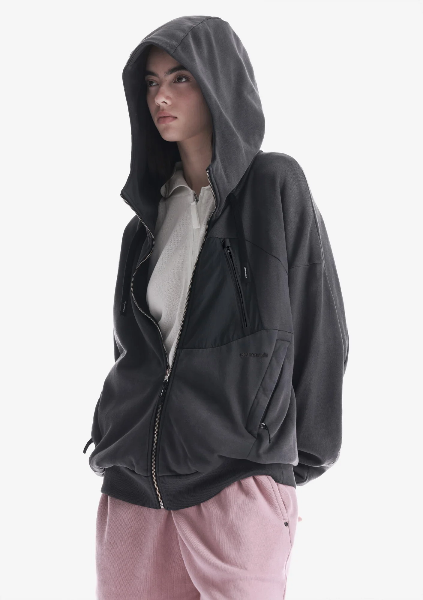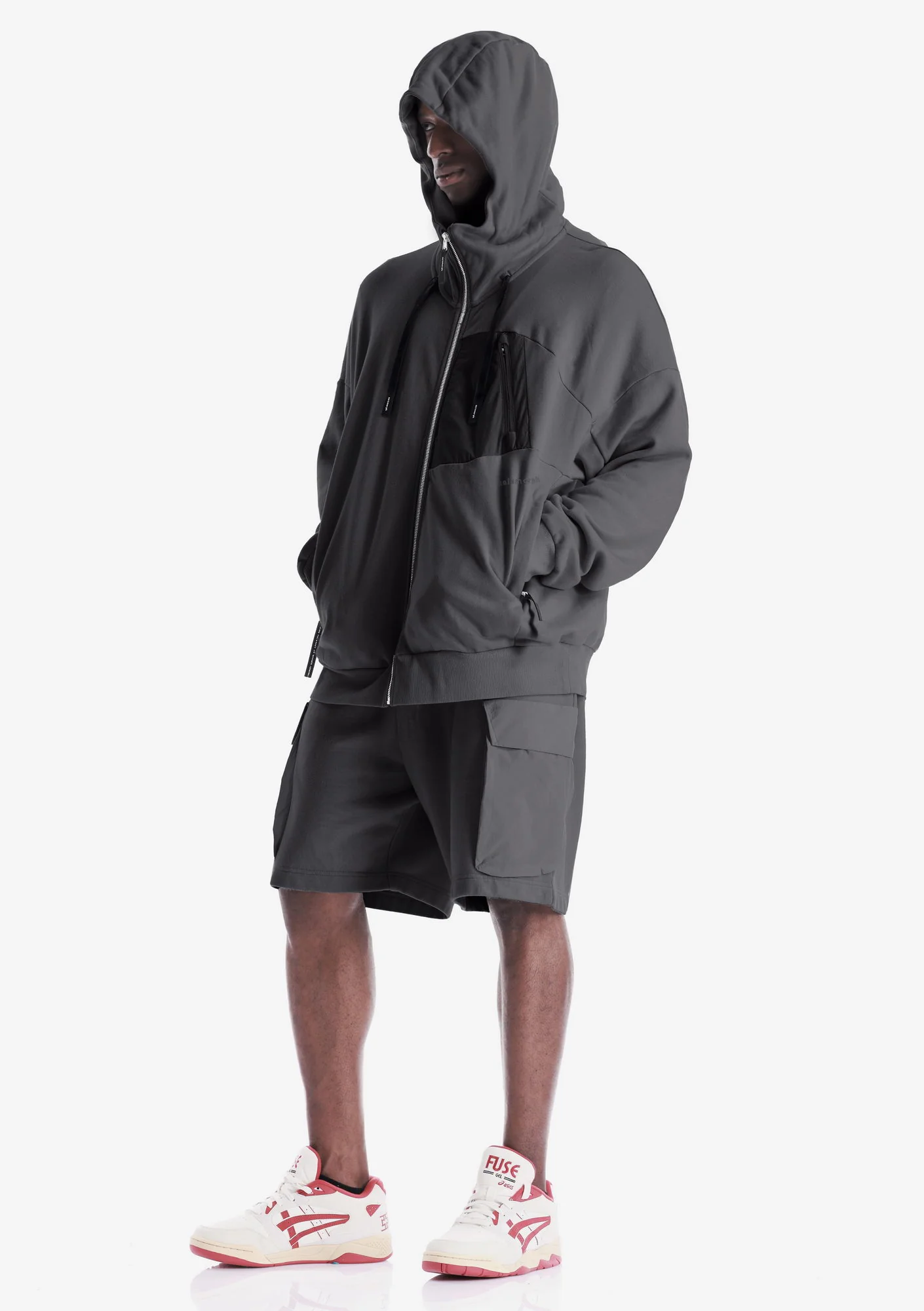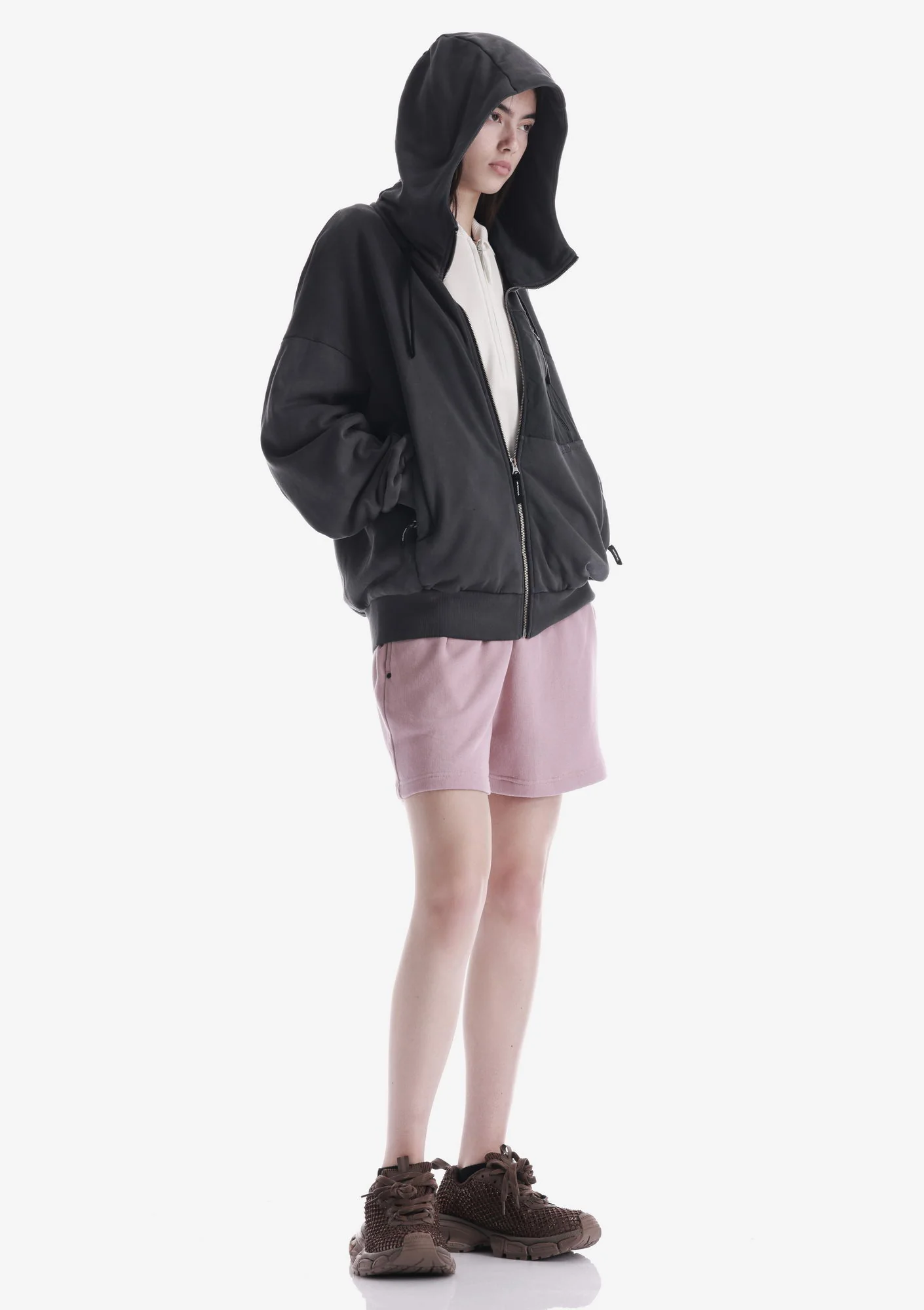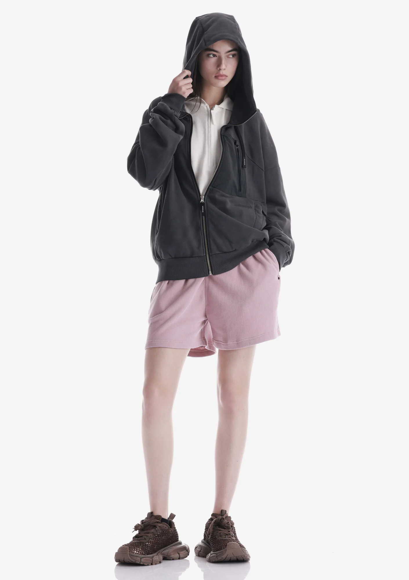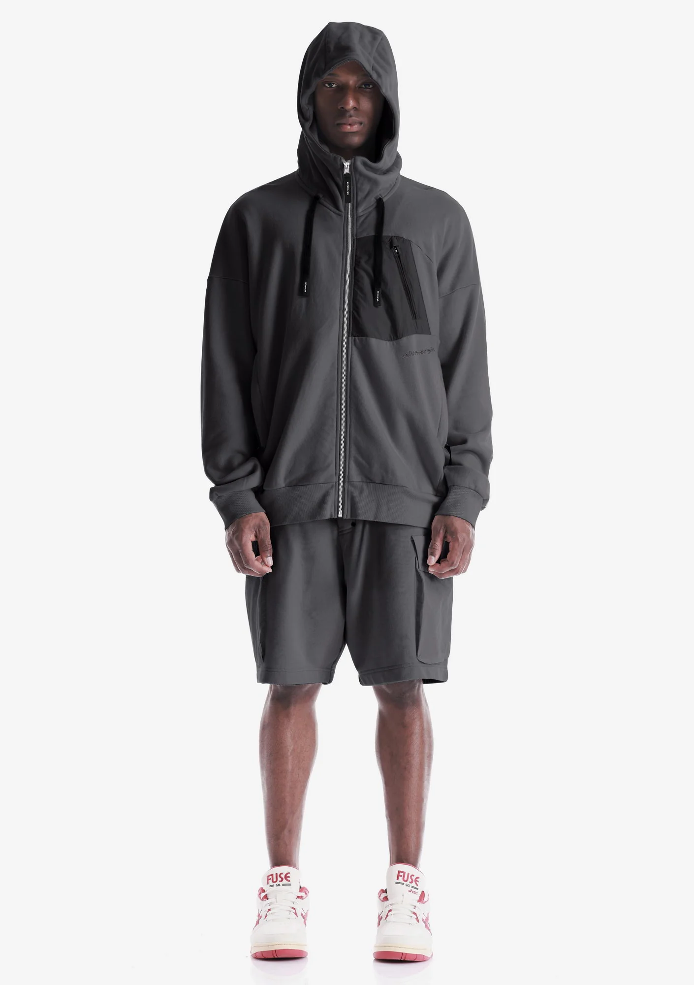 Худи на молнии из плотного хлопкового футера с петлевой изнанкой. Двухслойный капюшон, карманы на молнии и рибовые манжеты с низом обеспечивают функциональность и стабильную посадку.
