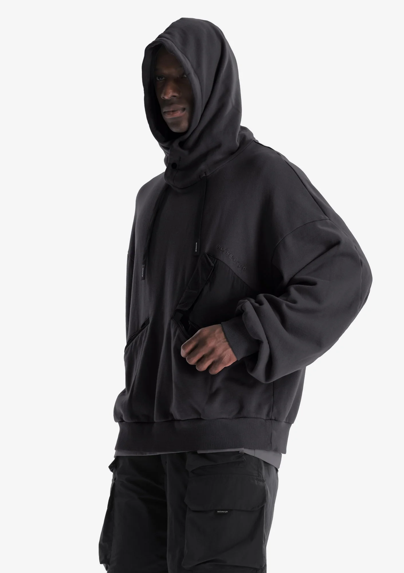 - Двухслойный капюшон с затяжником и кнопкой