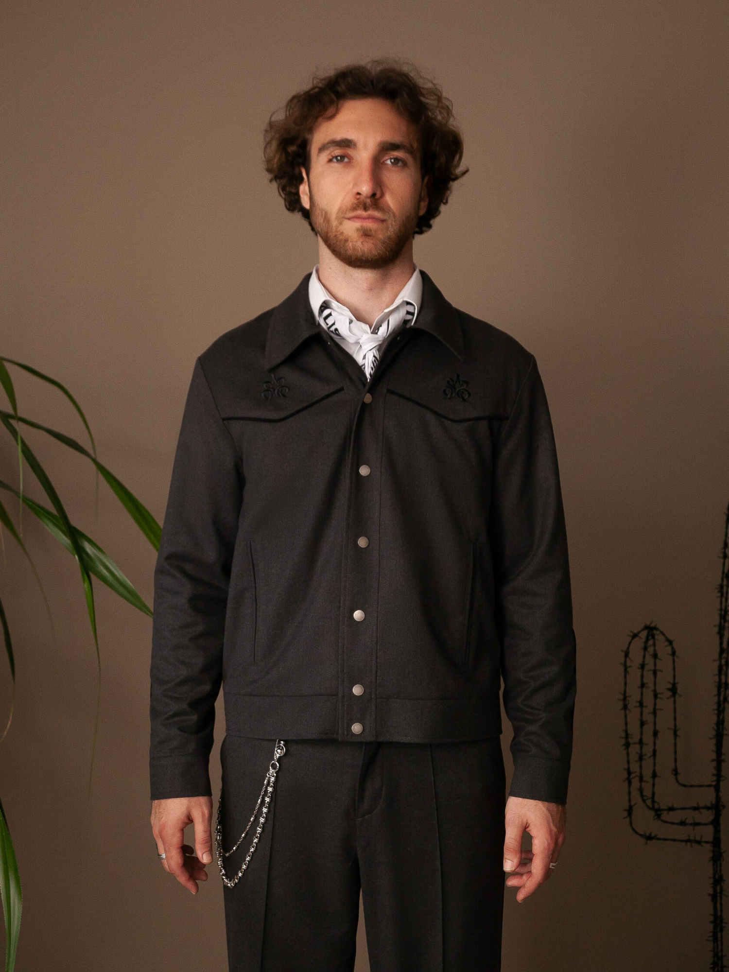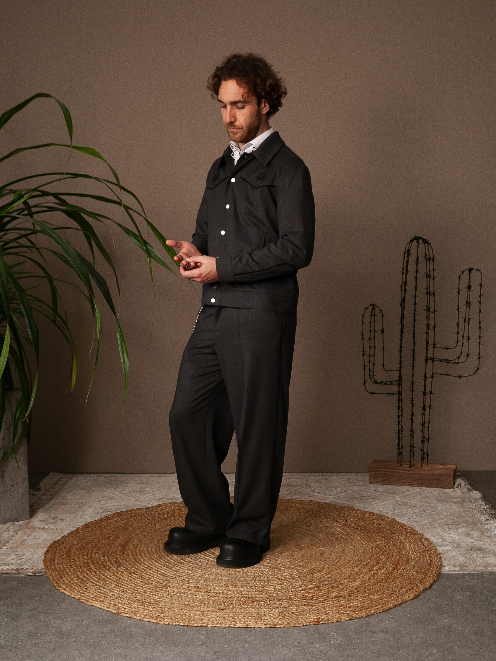 Аутфит сочетает в себе элегантность кроя и бунтарскую эстетику бренда.