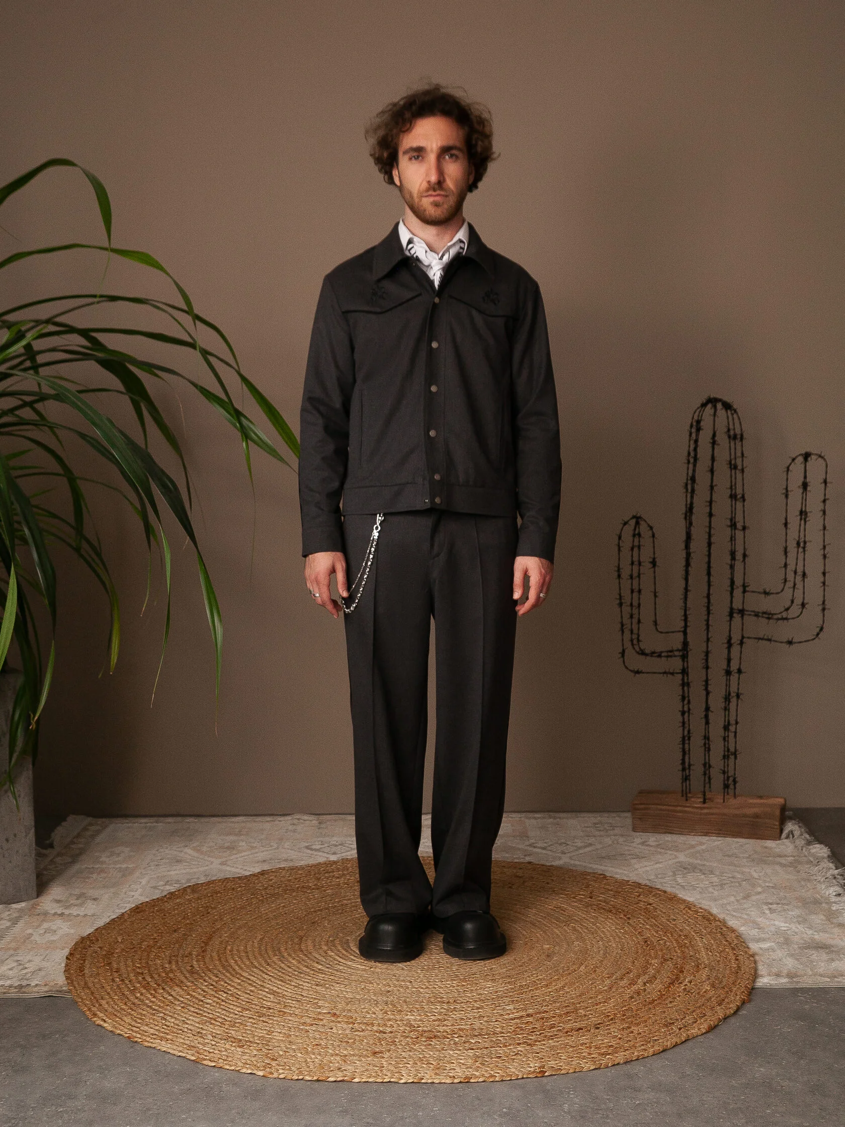 Костюм из мягкой фактурной ткани; Ключевая деталь- окантовка на полочке и рукавах пиджака. Акцентная вышивка.