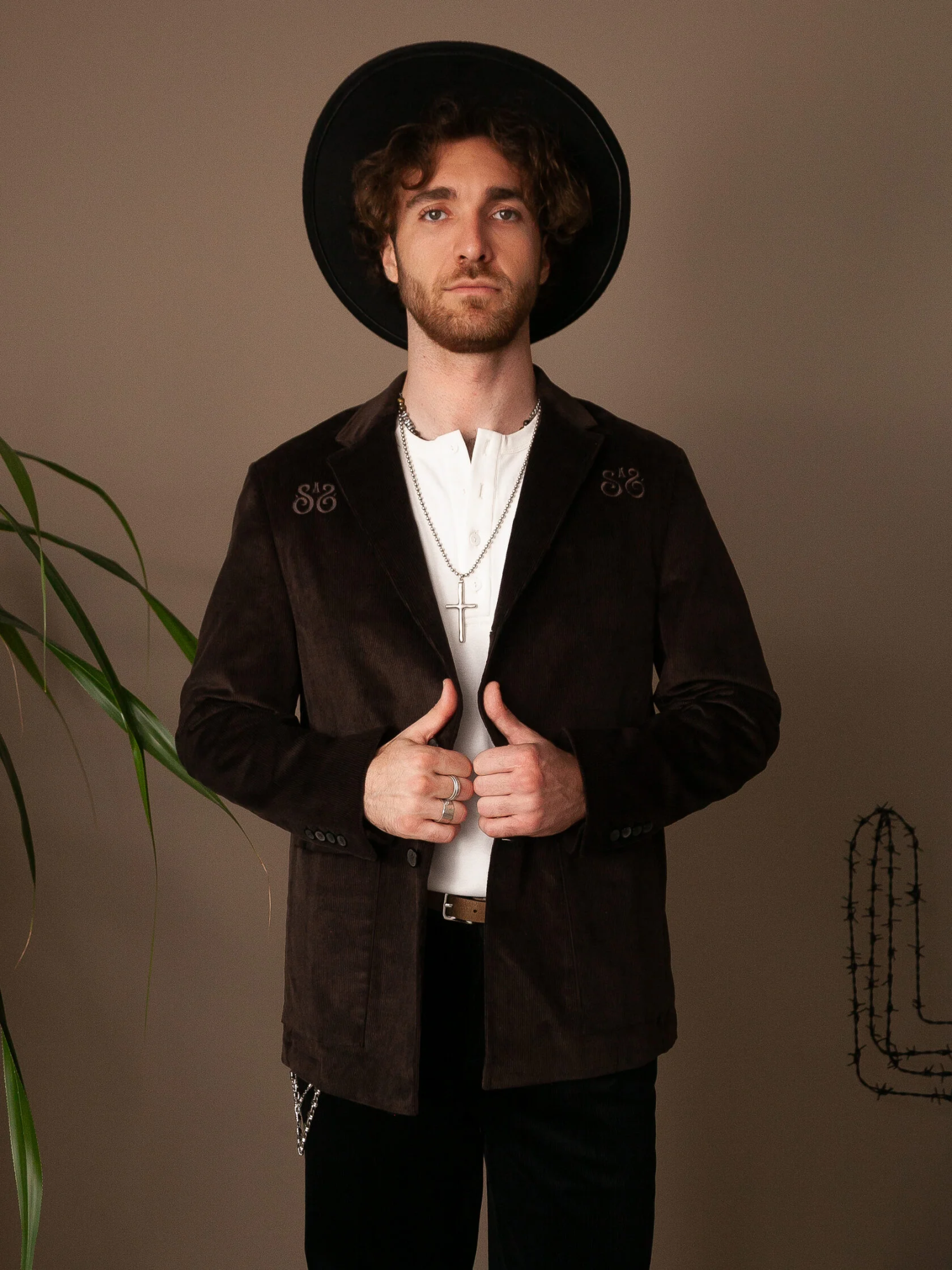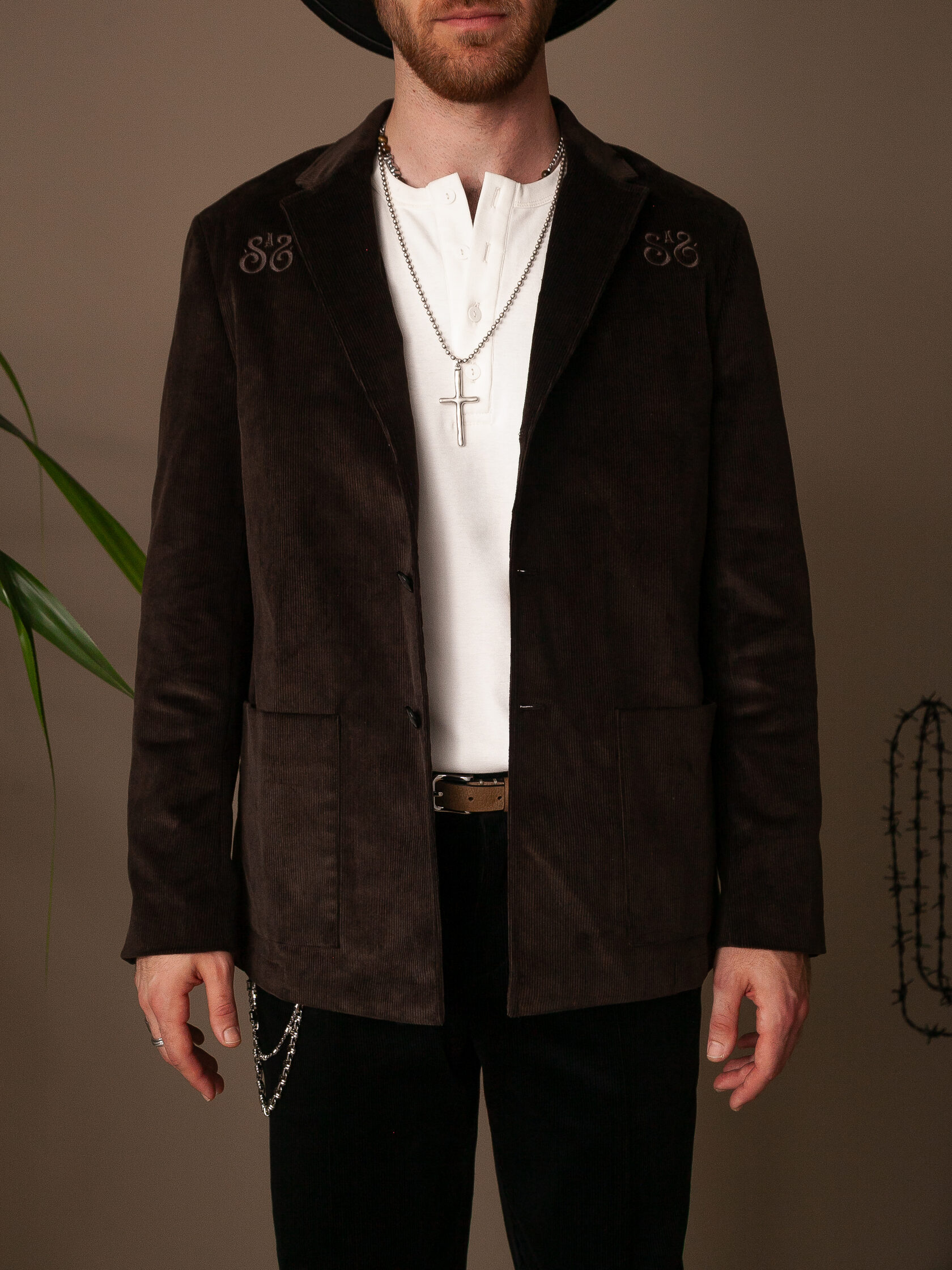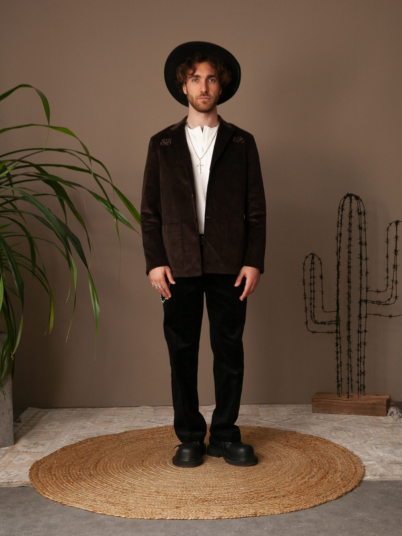 АРХИТЕКТУРА МОДЕЛИ Пиджак: Прямой грубый крой, с мягким плечом, короткий лацканом. По переду прямые накладные карманы без скруглений. Конструкция без подклады. Характерная вышивка на левой полке изделия с двух сторон.