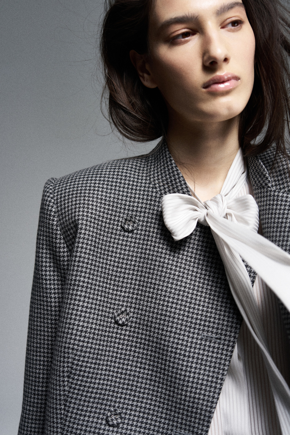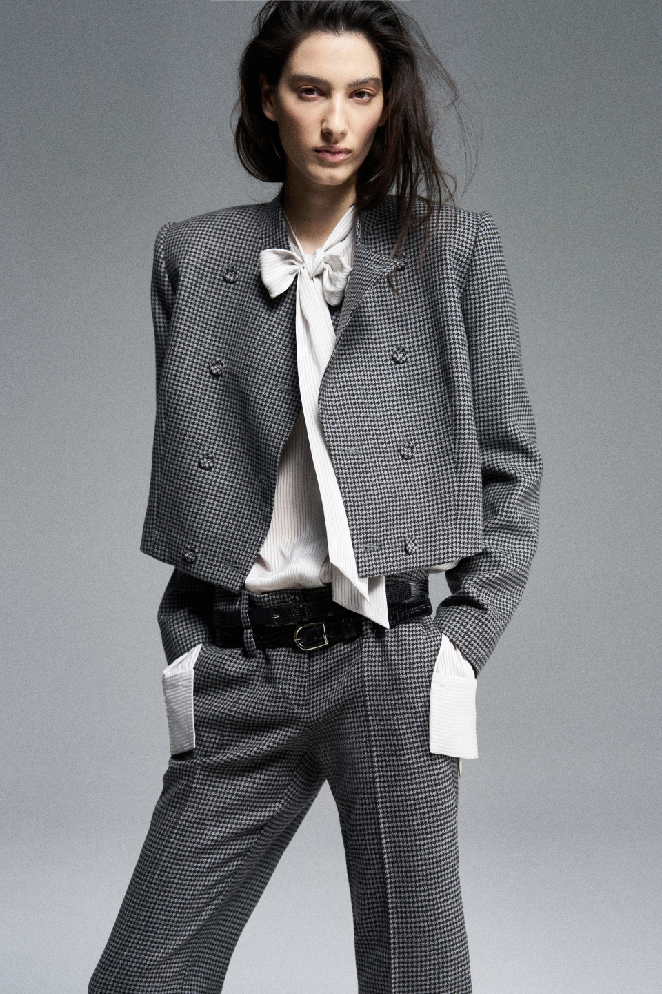 Модель трансформируется: жакет можно застегивать как на мужскую, так и на женскую сторону. Возможна закрытая посадка под шею или вариант с лацканами. Также изделие можно застегнуть встык, формируя мягкие борта с отворотами.