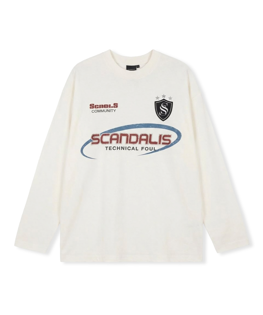 Классический силуэт свободного кроя с акцентированной линией плеча и удлиненными рукавами. Фронтальная часть изделия декорирована сложной многоцветной шелкографией. В центре расположен крупный логотип бренда в синем динамичном овале, дополненный надписью. В верхней части нанесены дополнительные графические элементы: красный текстовый блок слева и светлый геральдический щит с тремя звездами справа. Графика имеет эффект легкого винтажного растрескивания.