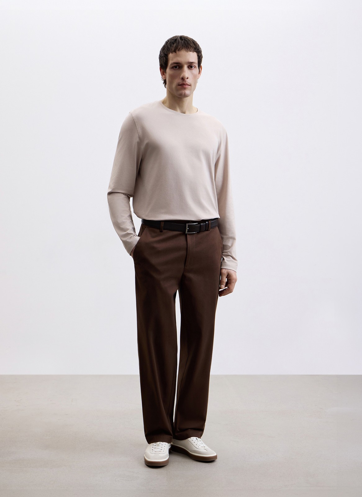 Лонгслив полуприлегающего кроя станет базой в гардеробе.