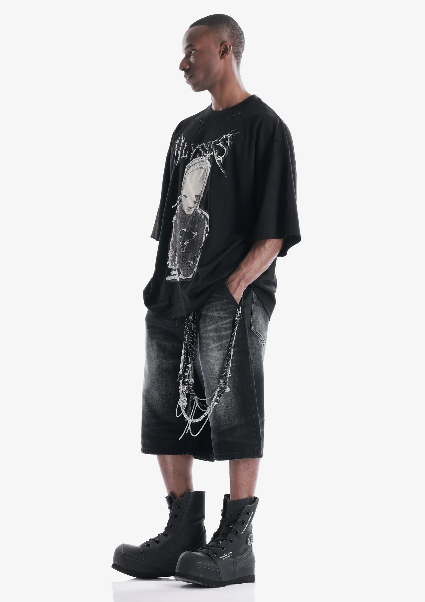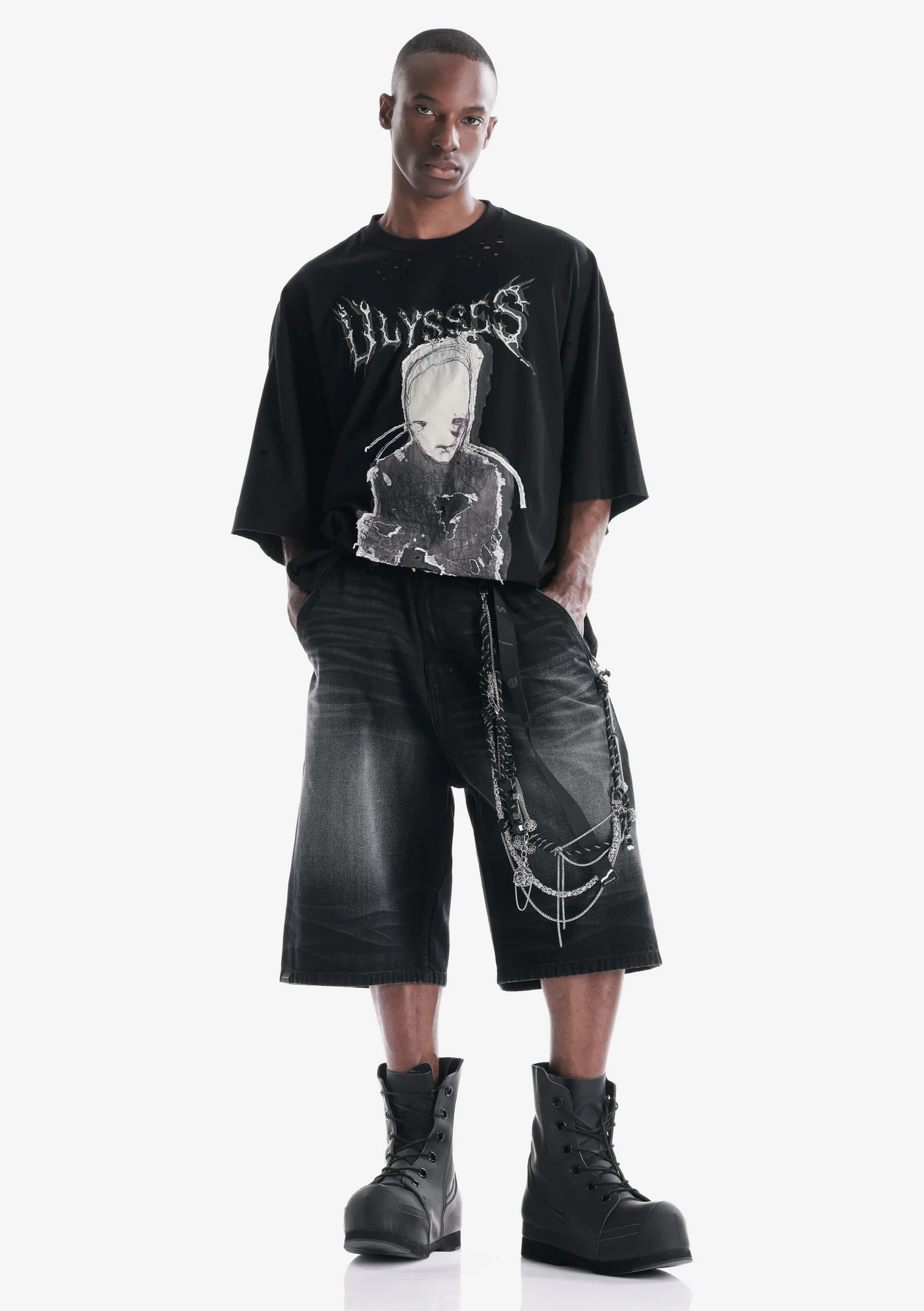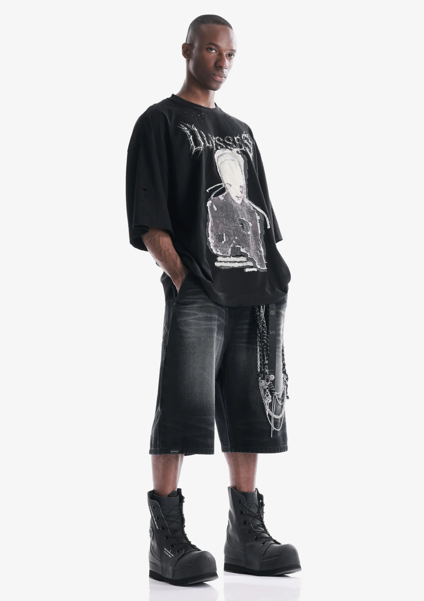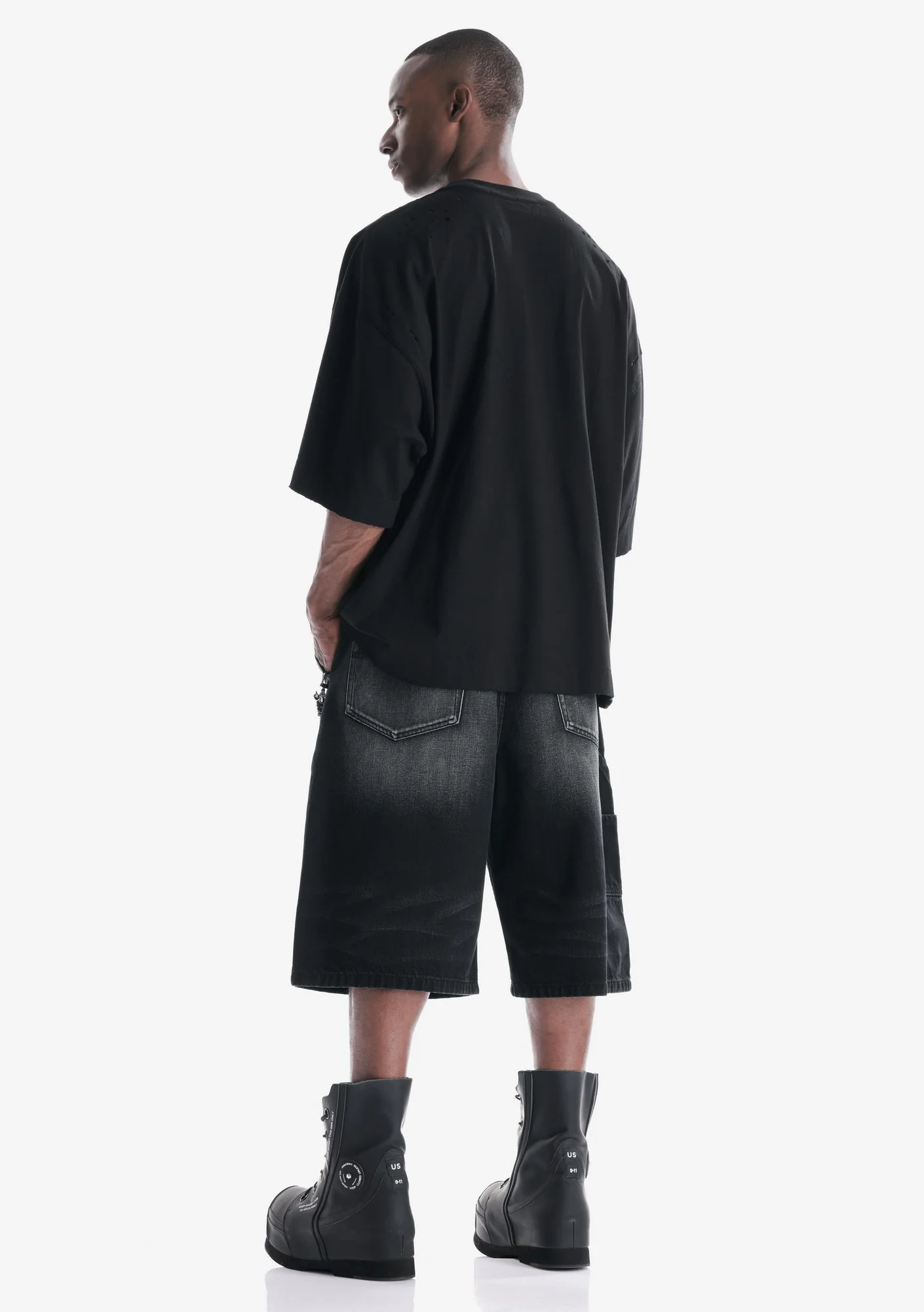 Удлинённые шорты выполнены из плотного денима с выраженной текстурой, который хорошо держит форму и отличается высокой износостойкостью. Классическая конструкция дополнена дополнительными задними накладными карманами, усиливающими функциональность и утилитарный характер модели.